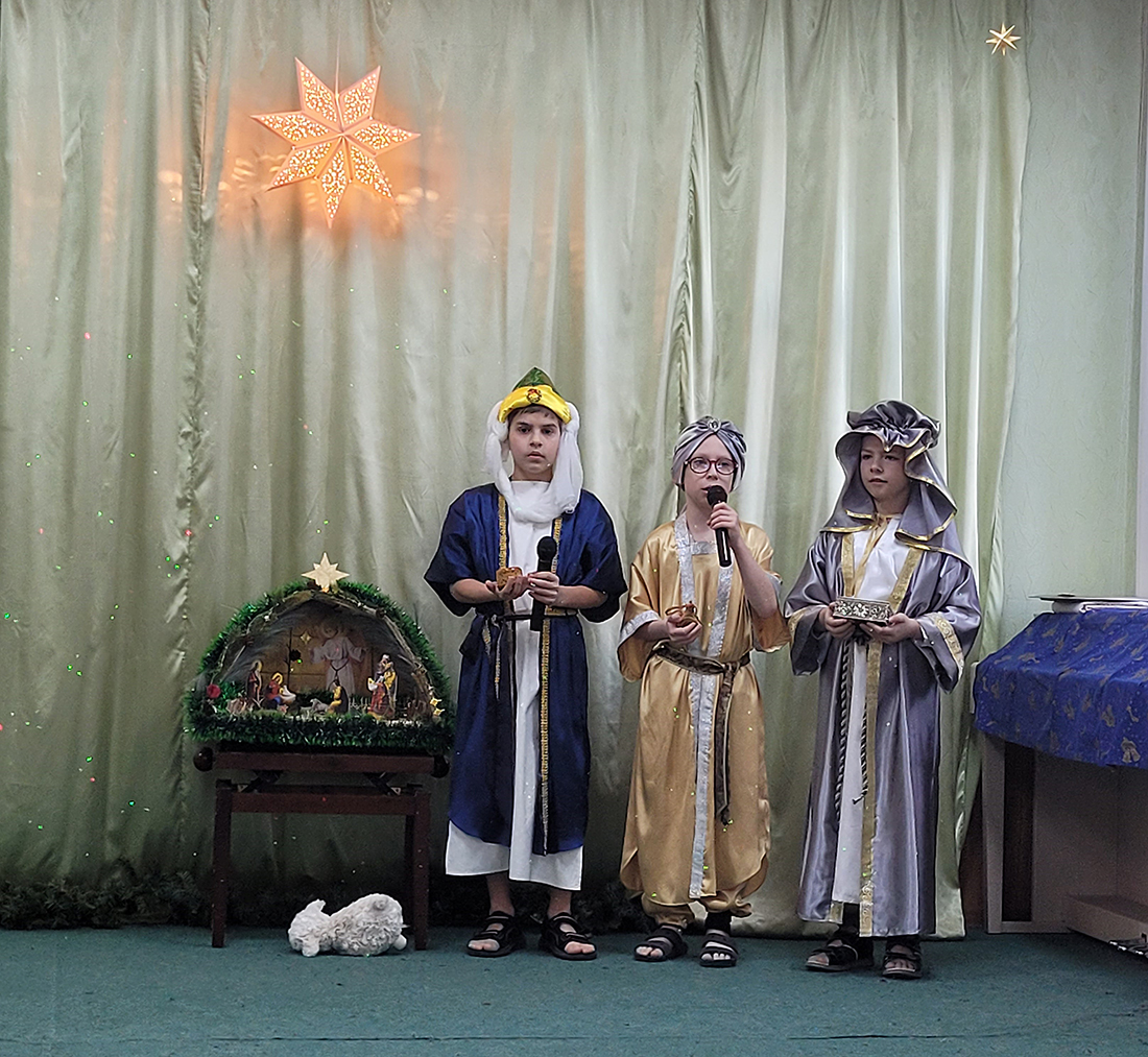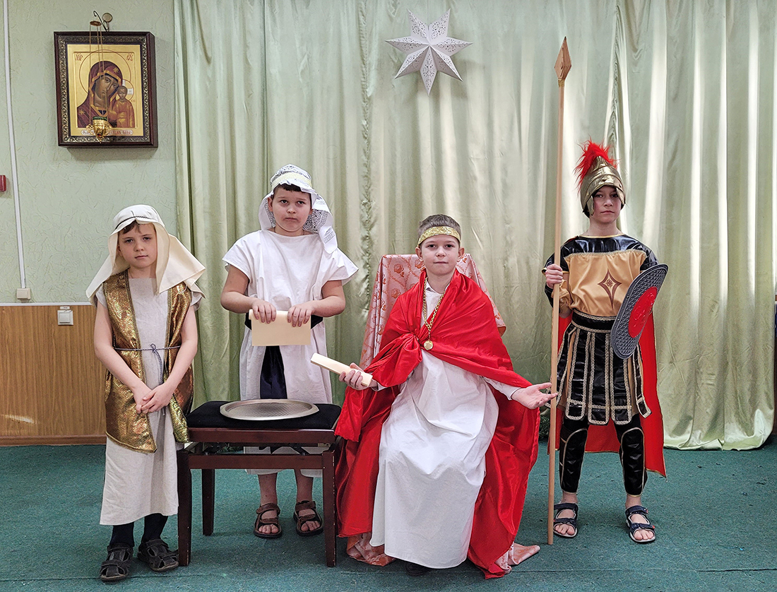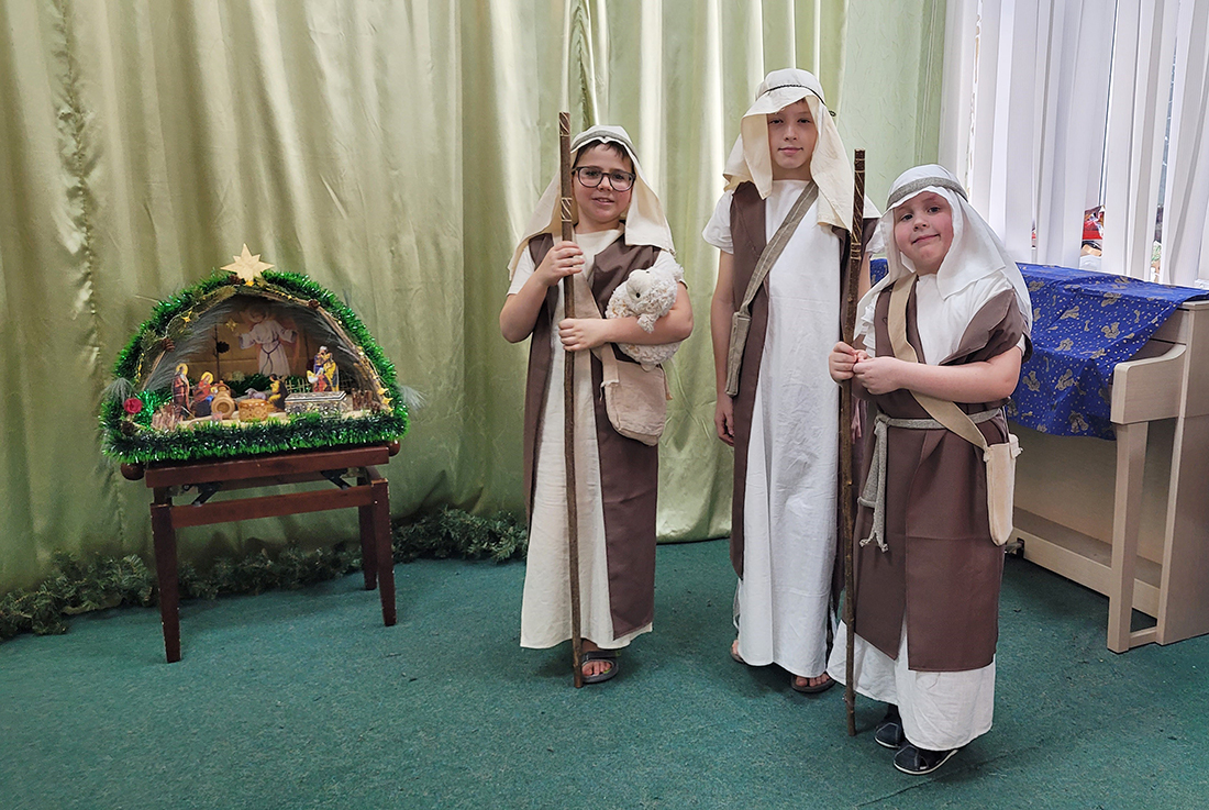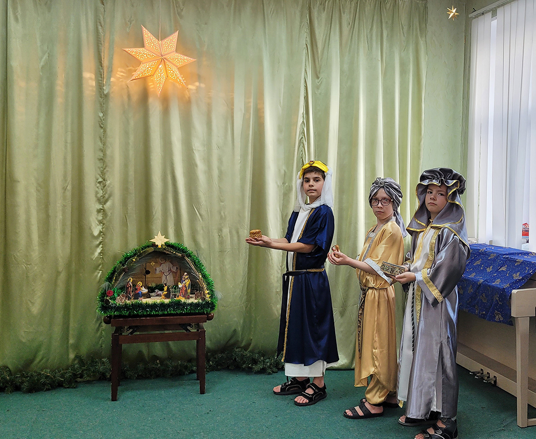 Праздник традиционно начался участием всех воспитанников в Божественной литургии, на которой ребята из старшей группы пели в составе клиросного хора. В этом году вход в храм украсил рождественский вертеп, сооруженный одной из семей воспитанников (автор – Демьянова Елизавета Евгеньевна).
