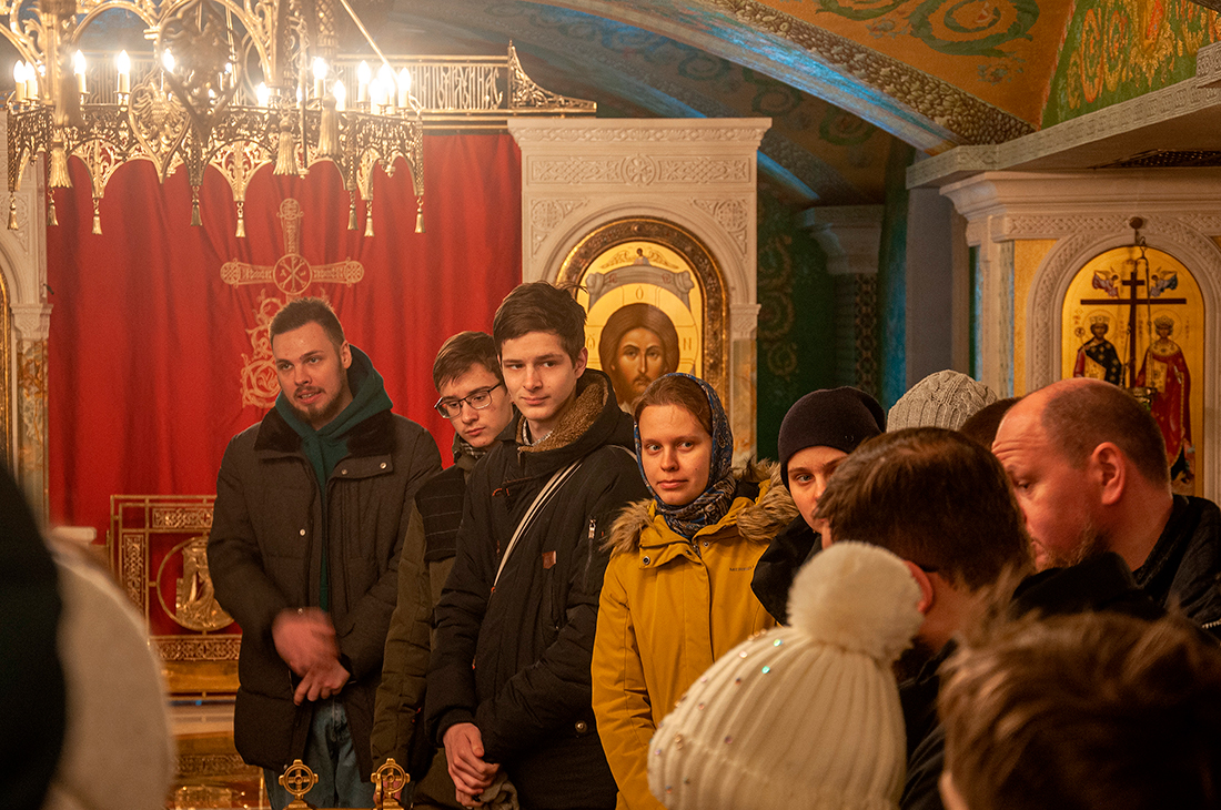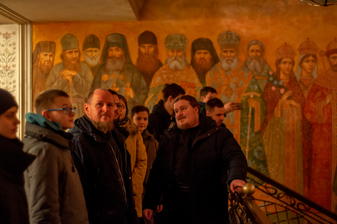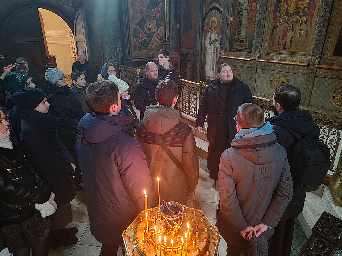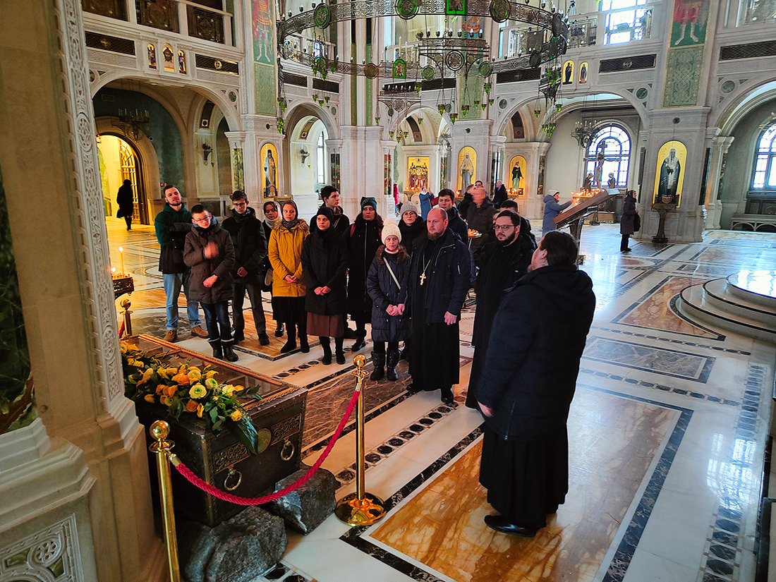 В ходе экскурсии молодежь посетила храм Сретения Владимирской иконы Божией Матери, где они смогли помолиться у келейной иконы архимандрита Иоанна Крестьянкина – Владимирской Божией Матери, и исполнить, совместно с молящимися в храме, молитву «Царице моя Преблагая». Именно этим чтимым списком старец благословил обитель Сретенского монастыря.