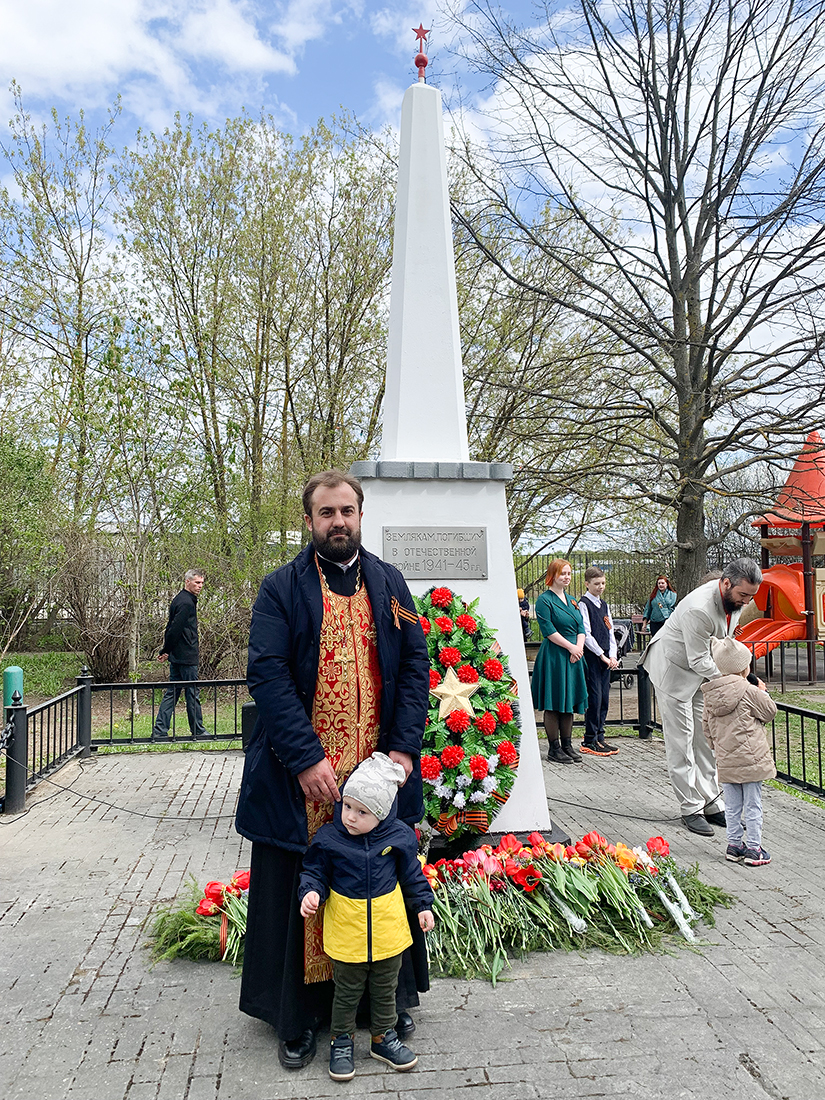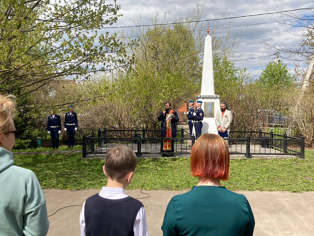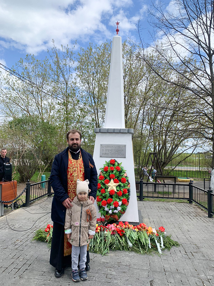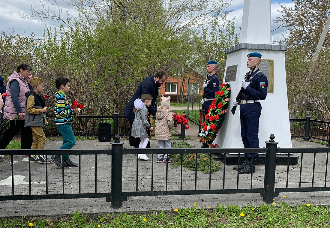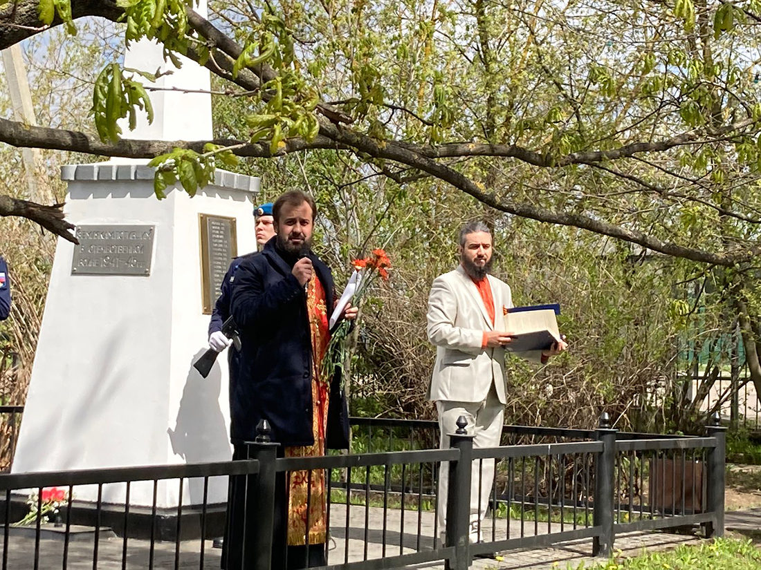 Отец Виталий поздравил присутствующих с Днём Победы и провозгласил Вечную память всем погибшим за Родину в годы Великой Отечественной войны, после чего к стелле были возложены венки и цветы.