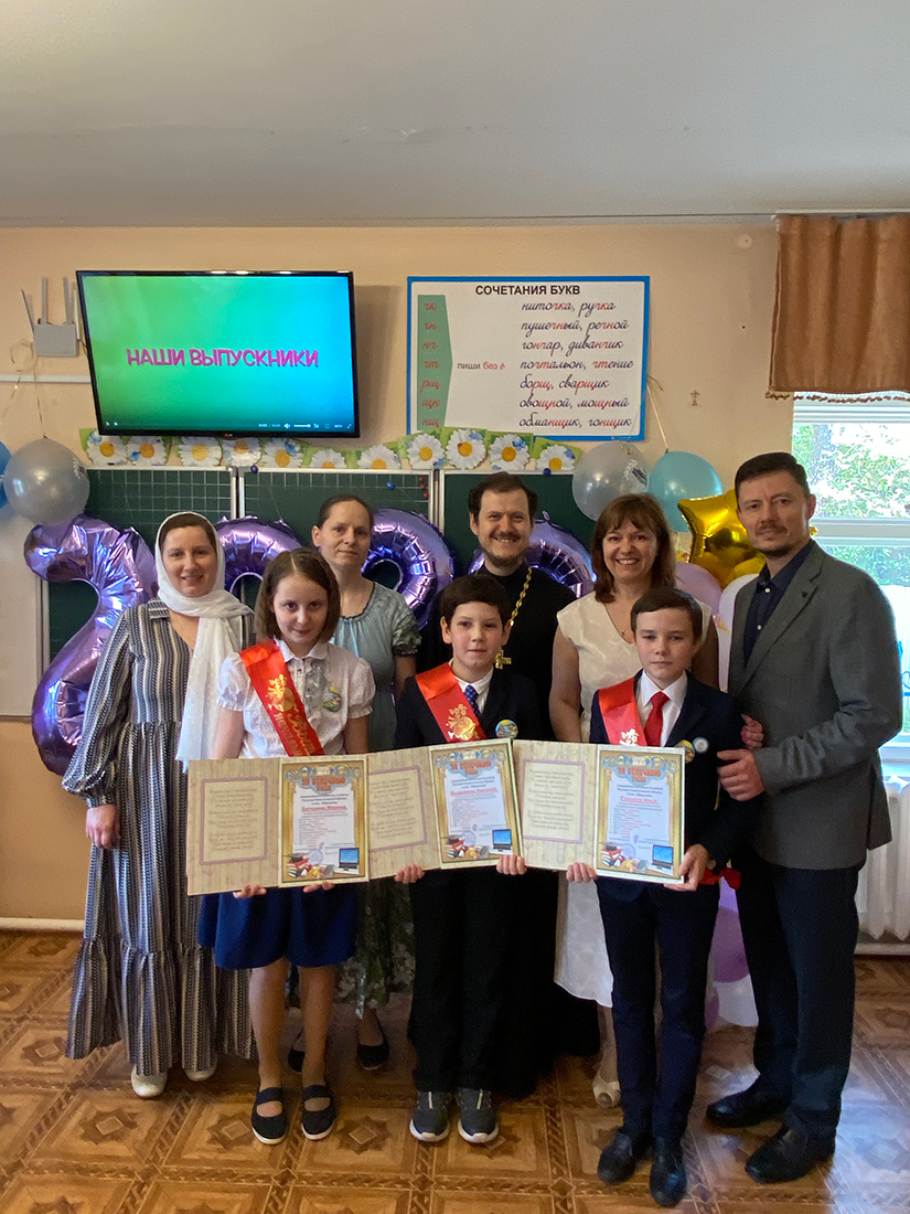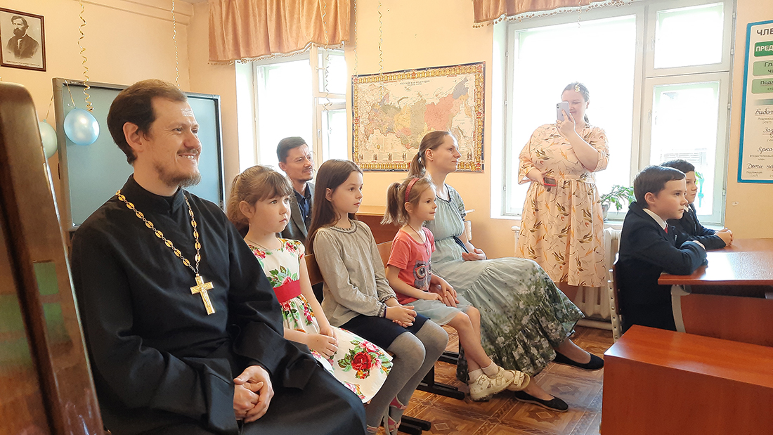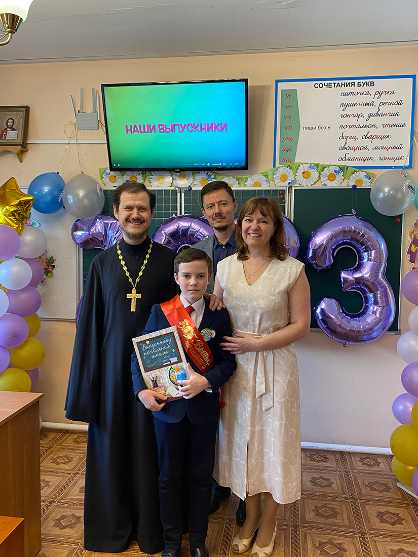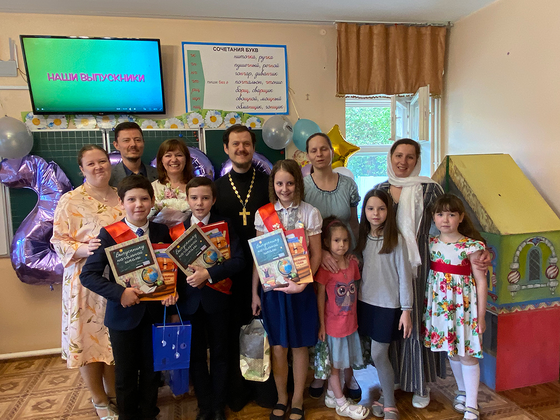Руководитель школы священник Димитрий Выдумкин поздравил выпускников 4-го класса с окончанием начального звена и наступлением летних каникул. Поблагодарив педагогов и родителей за совместный непростой четырехлетний труд, отец Димитрий отметил отрадные успехи учащихся, – все выпускники окончили начальную школу с отличием. Затем вниманию присутствующих был представлен небольшой фильм-летопись о первой четырехлетке совместного труда педагогов и учащихся. Все выпускники получили от школы памятные подарки, после чего все отправились в храм поблагодарить Бога за успешно увенчанные труды в школе. После молебна всех ждал праздничный обед.