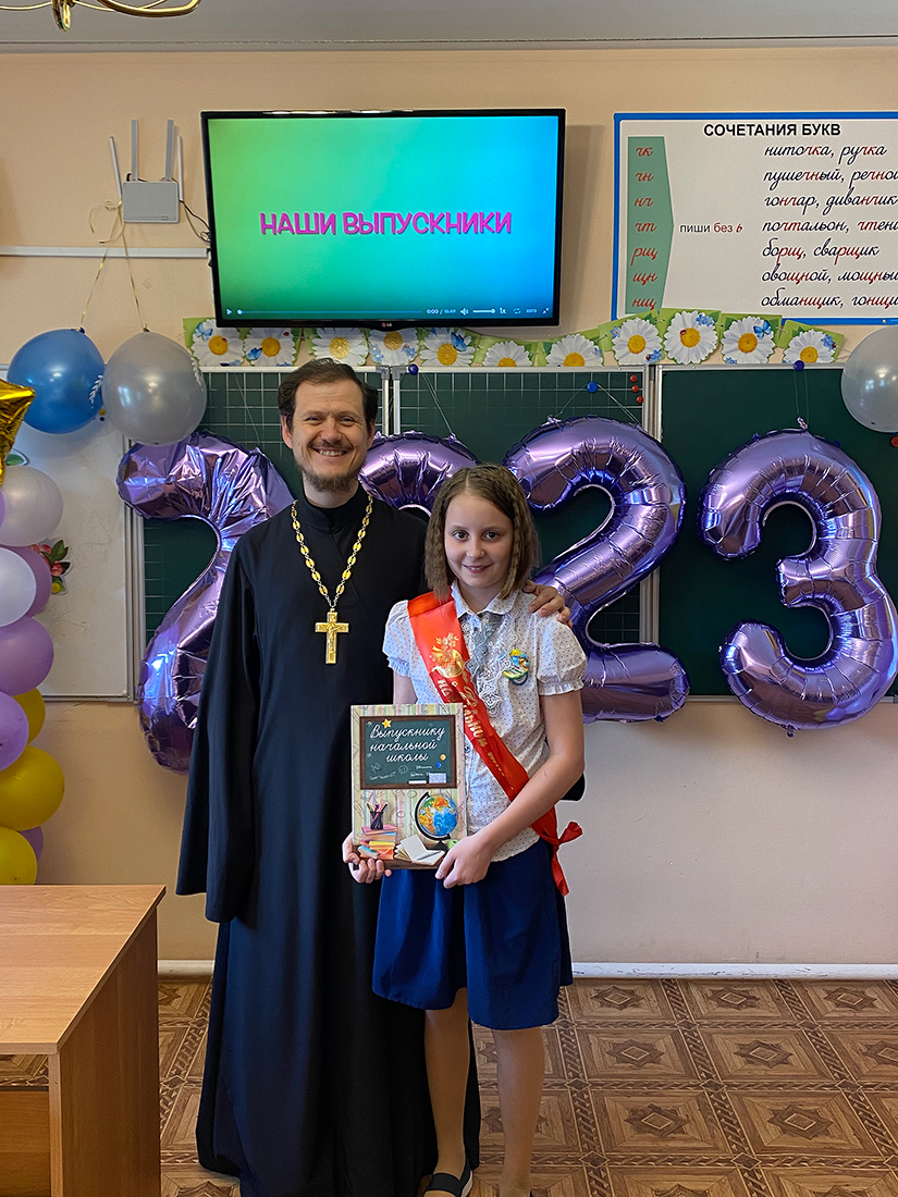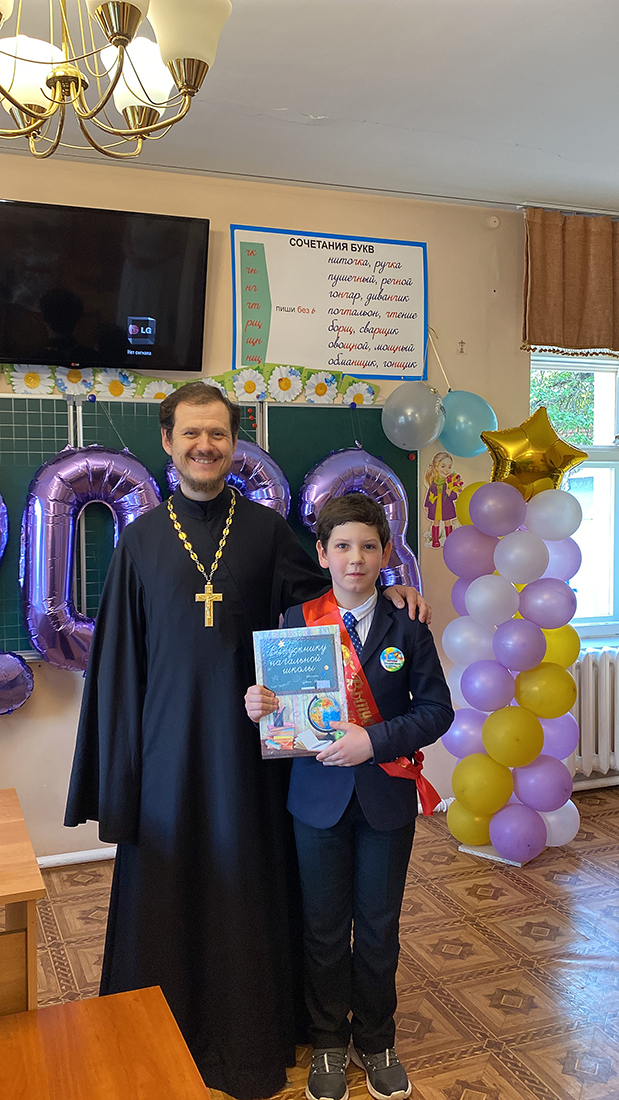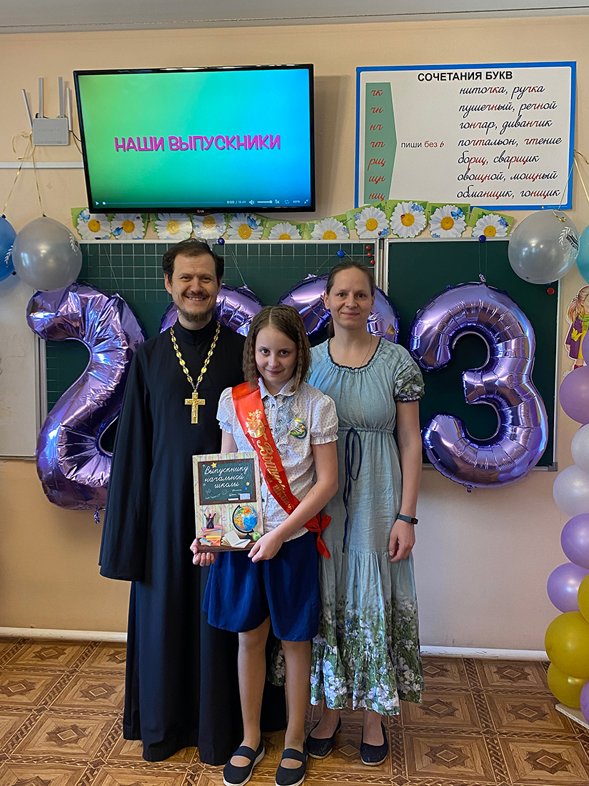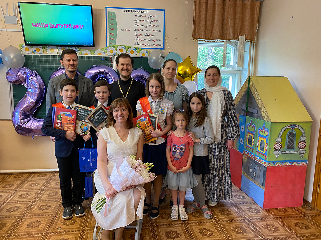 Руководитель школы священник Димитрий Выдумкин поздравил выпускников 4-го класса с окончанием начального звена и наступлением летних каникул. Поблагодарив педагогов и родителей за совместный непростой четырехлетний труд, отец Димитрий отметил отрадные успехи учащихся, – все выпускники окончили начальную школу с отличием. Затем вниманию присутствующих был представлен небольшой фильм-летопись о первой четырехлетке совместного труда педагогов и учащихся. Все выпускники получили от школы памятные подарки, после чего все отправились в храм поблагодарить Бога за успешно увенчанные труды в школе. После молебна всех ждал праздничный обед.