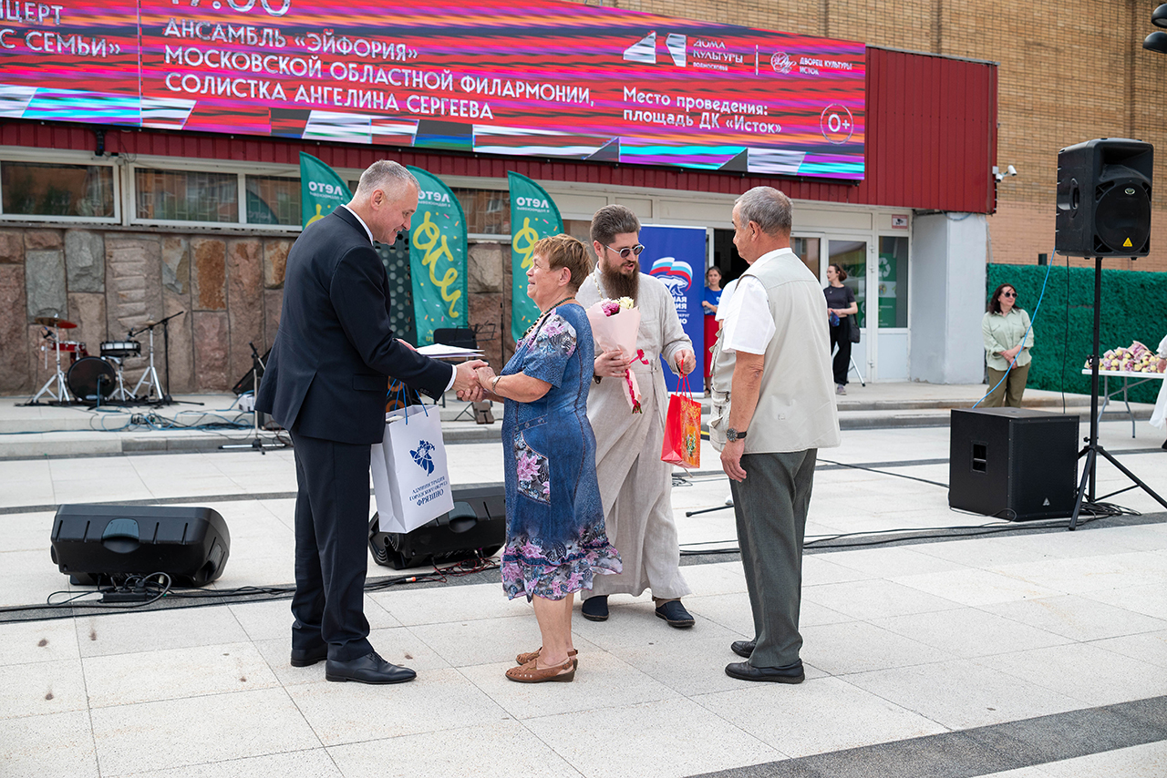 В этот же день настоятель Державного храма города Фрязино священник Димитрий Третьяков принял участие в праздновании Дня семьи, любви и верности в Наукограде Фрязино. Вместе с Главой города Дмитрием Воробьевым и руководителем местного отделения фракции «Единая Россия» Александрой Киреевой, наградили пары, которые отмечали свой юбилей. С глубоким уважением отец Димитрий вручил подарки от прихода храма Державной иконы Божией Матери парам, которые прожили вместе 50, 60 и более лет вместе.