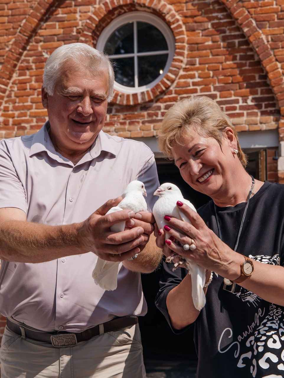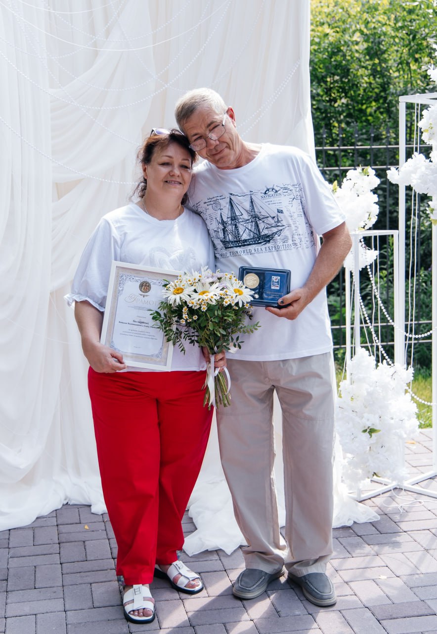 Почетными гостями праздника стали и юбиляры семейной жизни. В торжественной обстановке они получили поздравления и поделились с молодыми советами своей счастливой и долгой семейной жизни. Бессмертные Виталий Валентинович и Елена Анатольевна из Щелково в браке 35 лет. Супруги всегда мечтали о большей и дружной семье. Сейчас они приемные родители для 28 детей, из которых 18 детей они выпустили во взрослую жизнь. Семья врачей Поймановых Сергея и Ольги из Серпухова отпраздновала 45-годовщину свадьбы. В их семье двое сыновей, две внучки и внук. Все праздники семья отмечает дома, в кругу близких. Супруги Бадякшины Виктор и Алла из Мытищ в преддверии праздник отпраздновала «золотой» 50-летний юбилей семейной жизни.