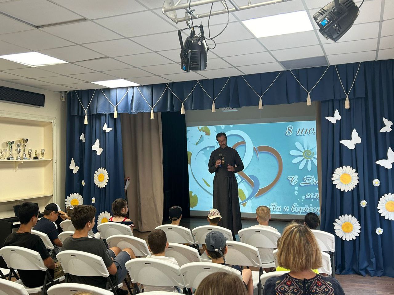 8 июля в Культурном центре города Фрязино состоялась встреча клирика Державного храма Наукограда священника Владимира Тарасюка с детьми из летнего лагеря «Сказка» фрязинской школы №2. Отец Владимир рассказал ребятам о святых благоверных князьях Петре и Февронии – покровителях семьи и брака, о семейных ценностях, любви и вере, заботе и внимании друг к другу. смалРебята задавали священнику вопросы, на которые он подробно отвечал.