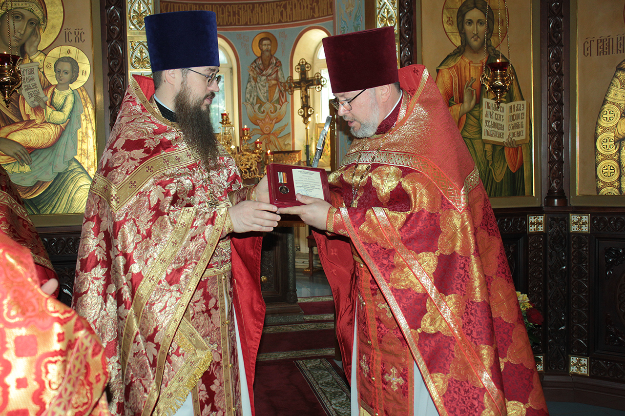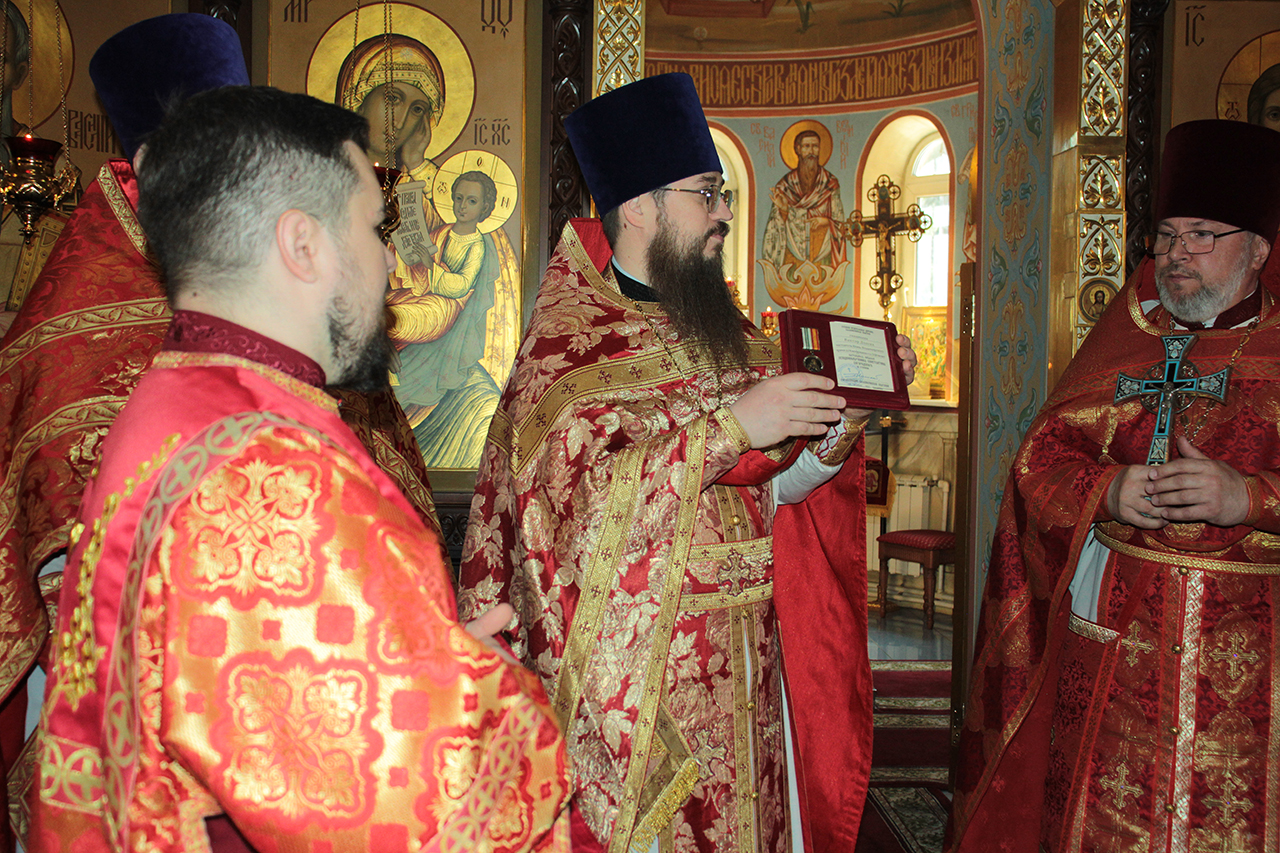 После Литургии заместитель благочинного Щёлковского церковного округа священник Димитрий Третьяков поздравил настоятеля храма священника Виктора Долгих с 55-летним юбилеем и передал высокую награду правящего Архиерея – медаль Балашихинской епархии священномученика Константина Богородского III степени за усердные труды на благо Святой Церкви.