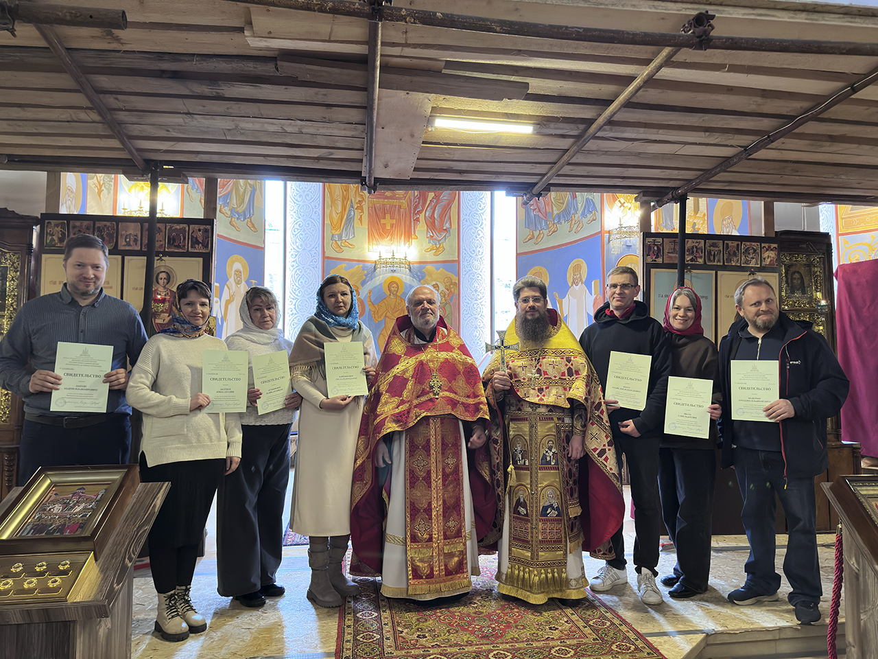 После службы состоялось торжественное вручение Свидетельств выпускникам Библейско-богословских курсов имени преподобного Сергия Радонежского при Державном храме города Фрязино.