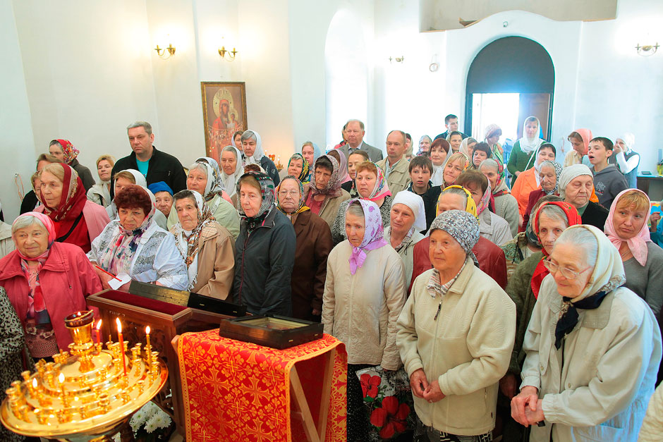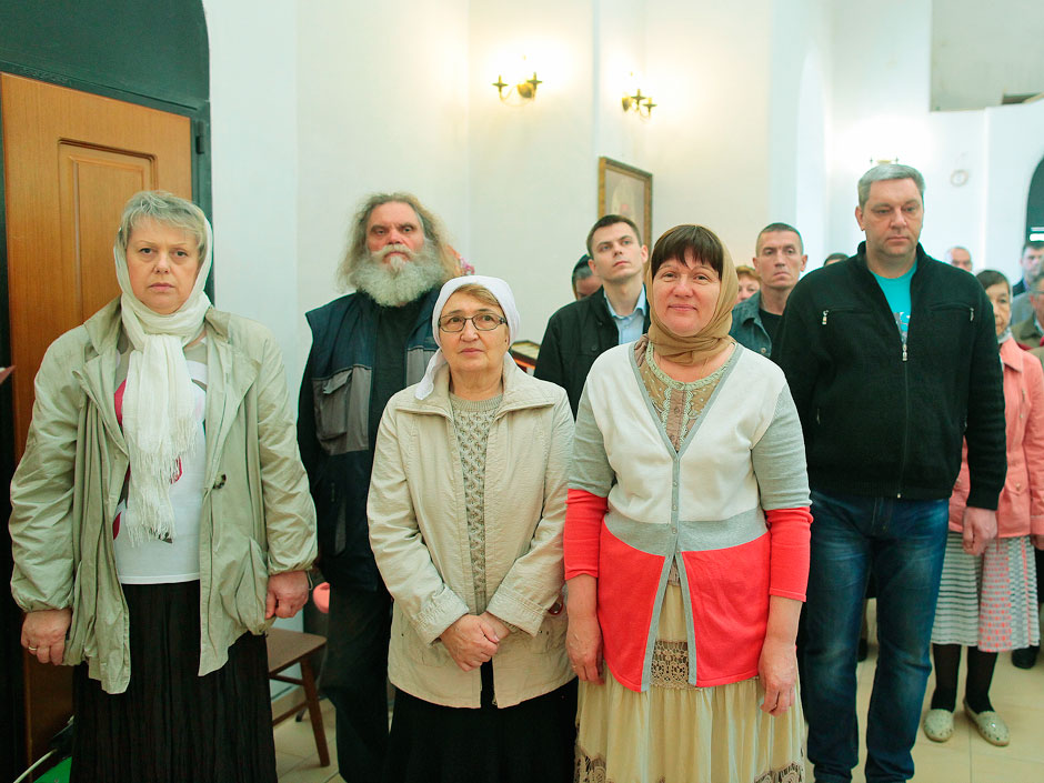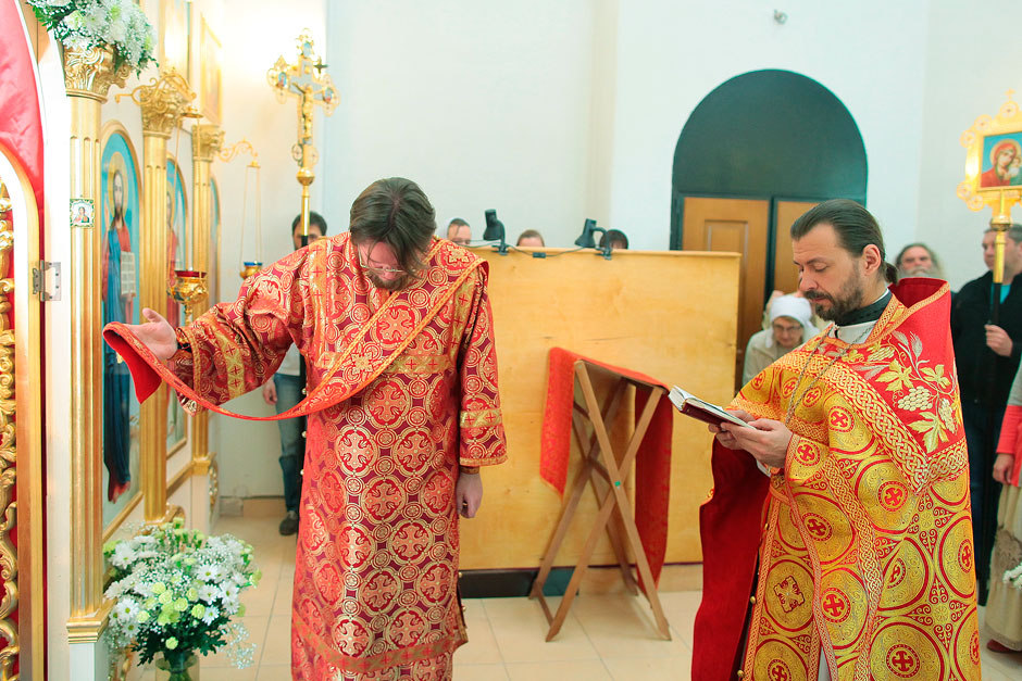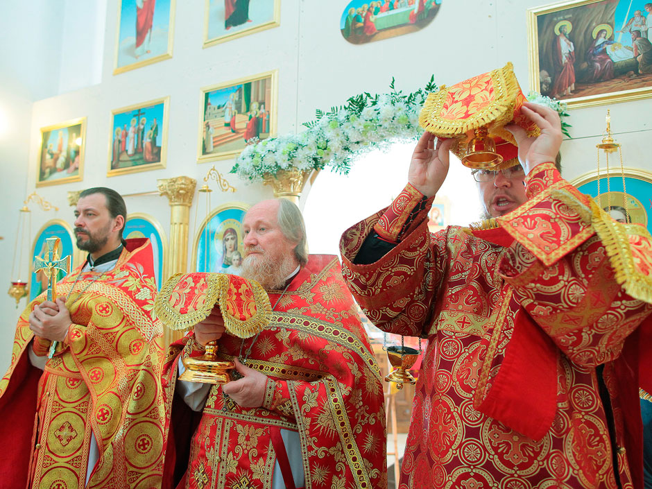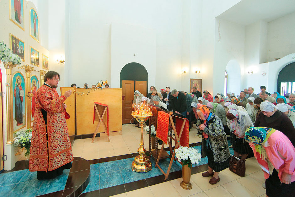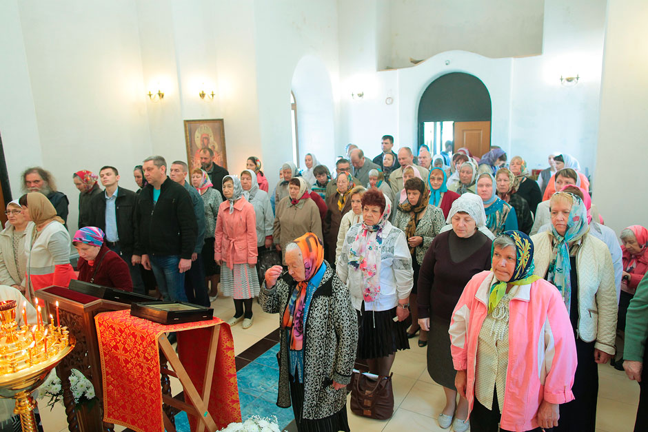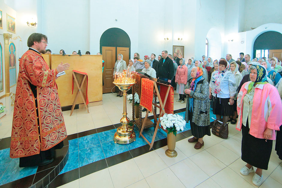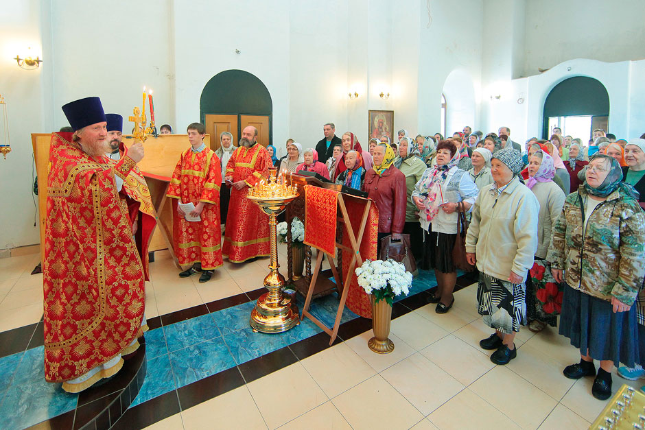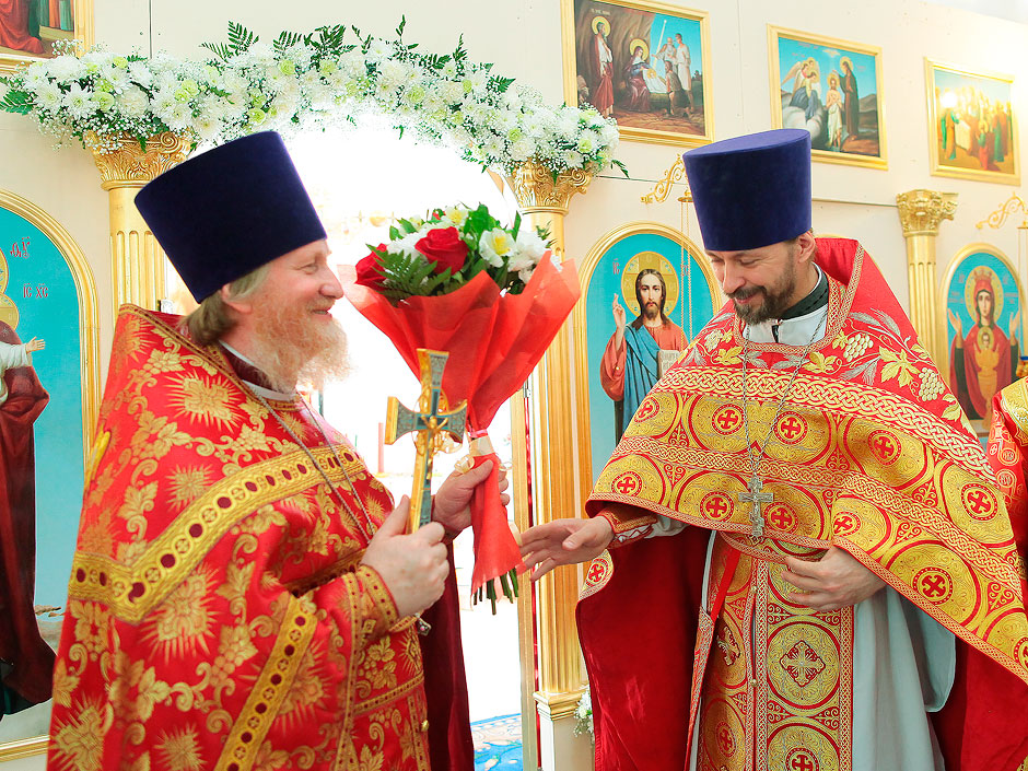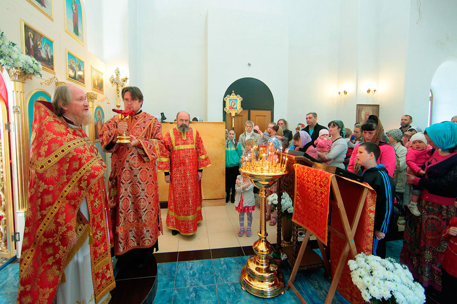 Ему сослужили настоятель храма священник Антоний Сенько и диакон Александр Амелин. После службы и крестного хода со словами поздравления с пасхальными днями и престольным праздником к прихожанам и жителям поселка обратился прот. Андрей Ковальчук.