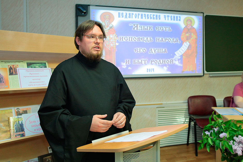 Доклад клирика Троицкого собора г. Щелково диакона Александра Амелина перенес слушателей во времена черноризца Храбра. Читая и комментируя отрывки его произведения «О письменах», о. Александр смог показать педагогам красоту старославянского языка и любовь автора к славянской письменности.