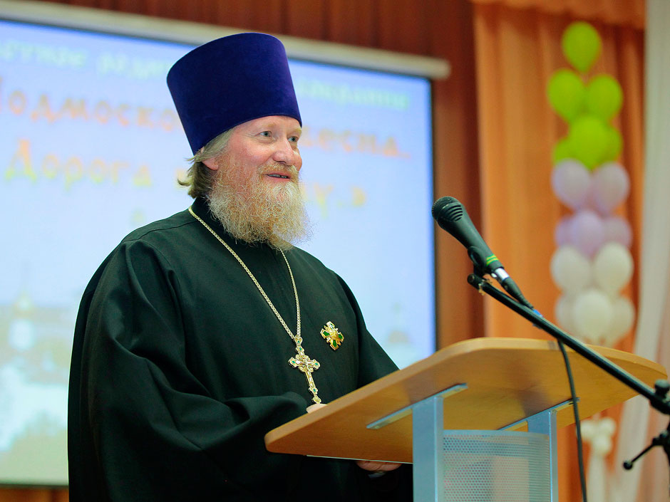 К полудню всех участников областного мероприятия гостеприимно встречала одна из лучших школ района – средняя общеобразовательная школа № 12, которая находится в знаменитом своей историей и воинскими доблестями Чкаловском военном гарнизоне (г. Щелково-3). В этом году совместные мероприятия Московской епархии и Министерства образования Московской области посвящены юбилейной дате – 700-летию со дня рождения преподобного Сергия Радонежского. В фойе школы гости сегодняшнего педагогического форума могли познакомиться с выставкой победителей и призеров областного конкурса детского изобразительного творчества «Сергий Радонежский и духовно-нравственное возрождение России». Здесь же для педагогов и родителей была развернута выставка образовательной методической литературы по духовно-нравственному воспитанию Православного Просветительского центра «Пересвет».