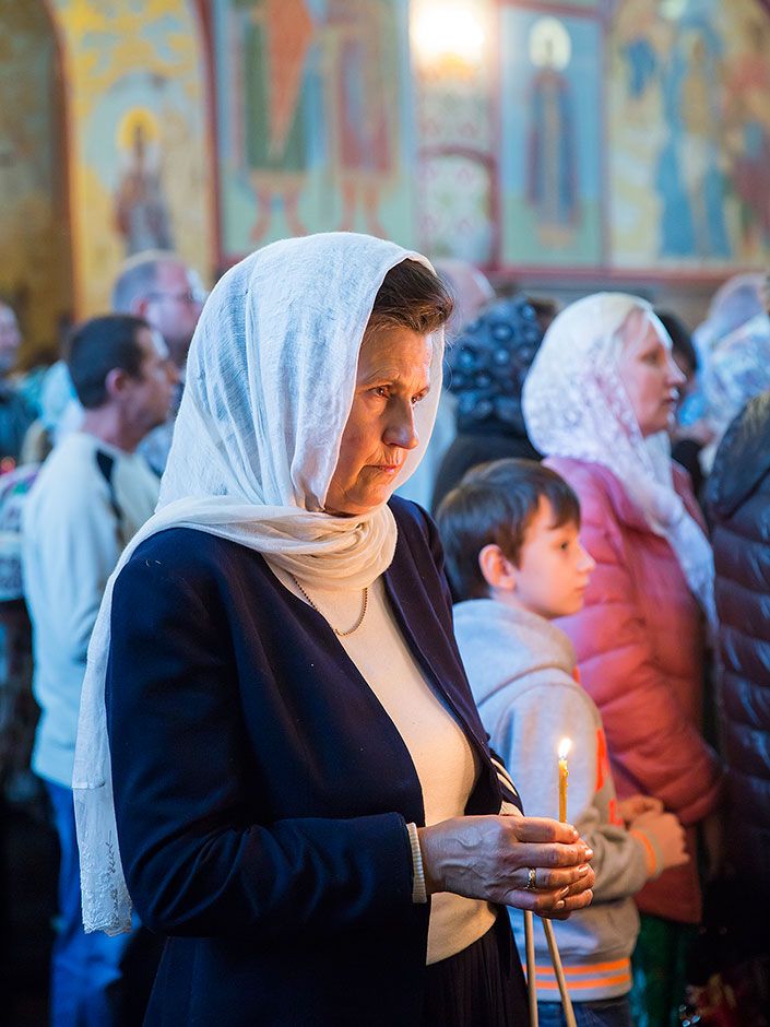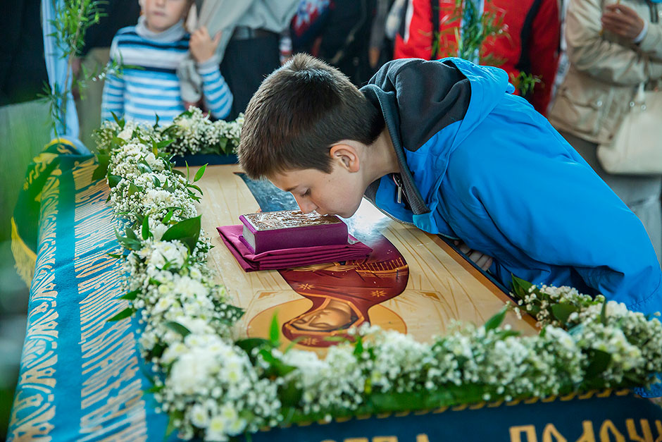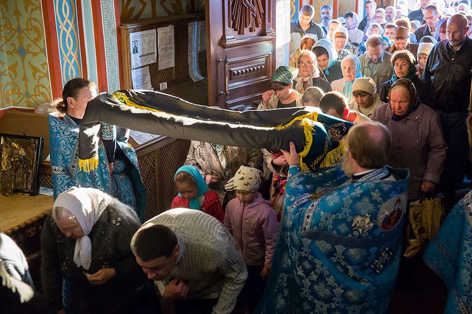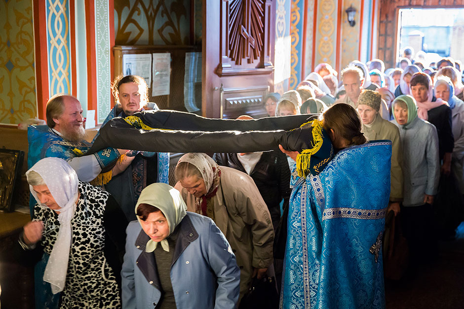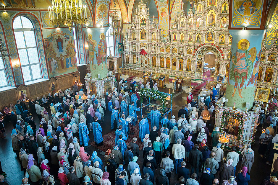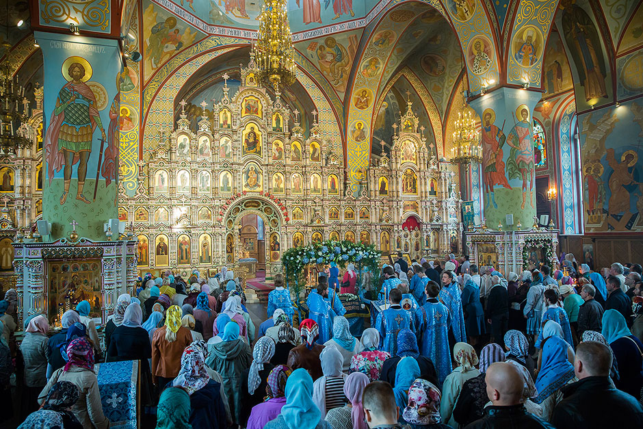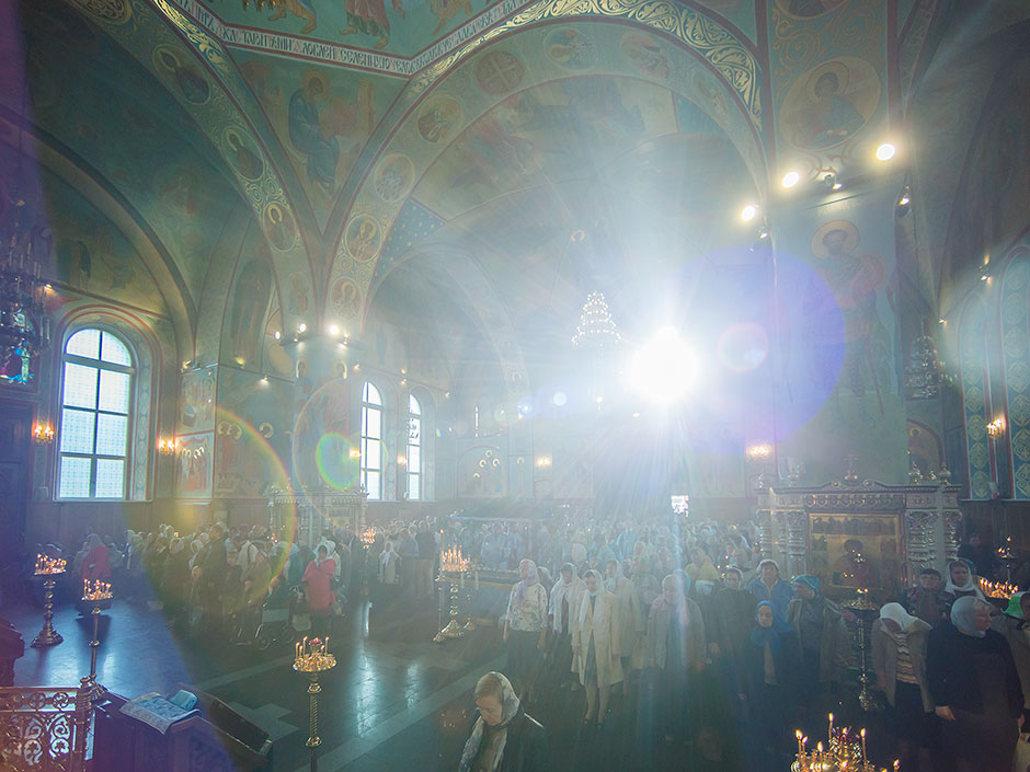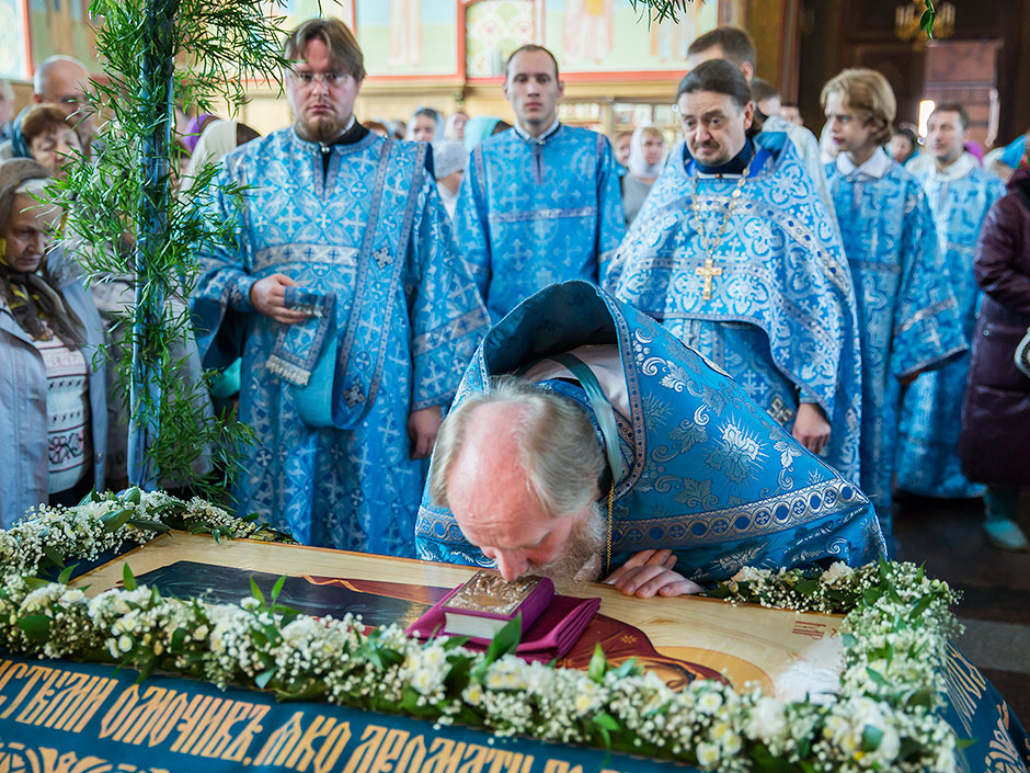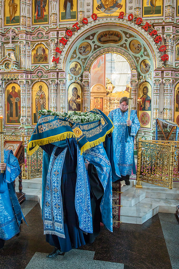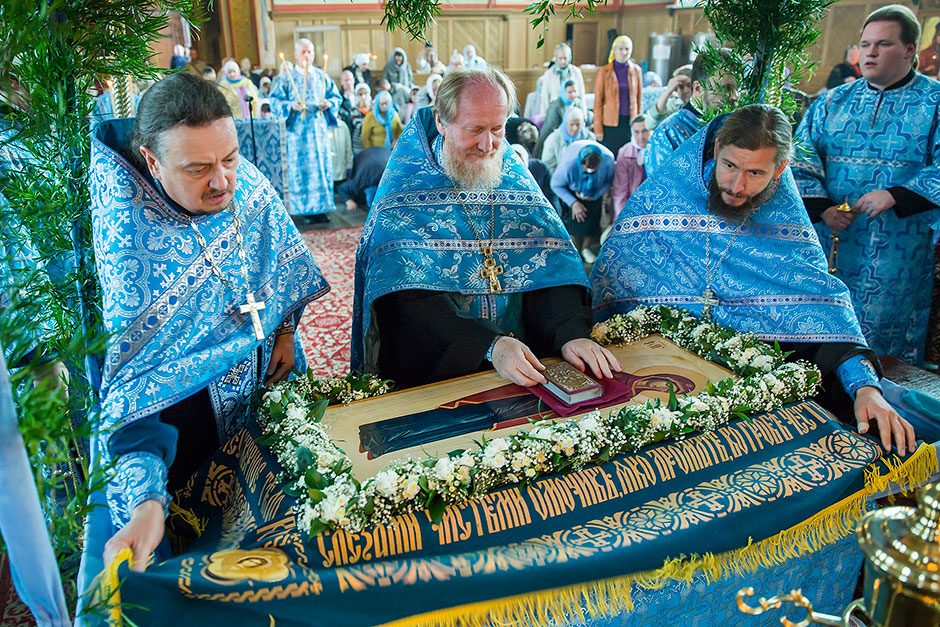 После великого славословия духовенство храма торжественно обнесло Плащаницу с изображением Богоматери вокруг храма.