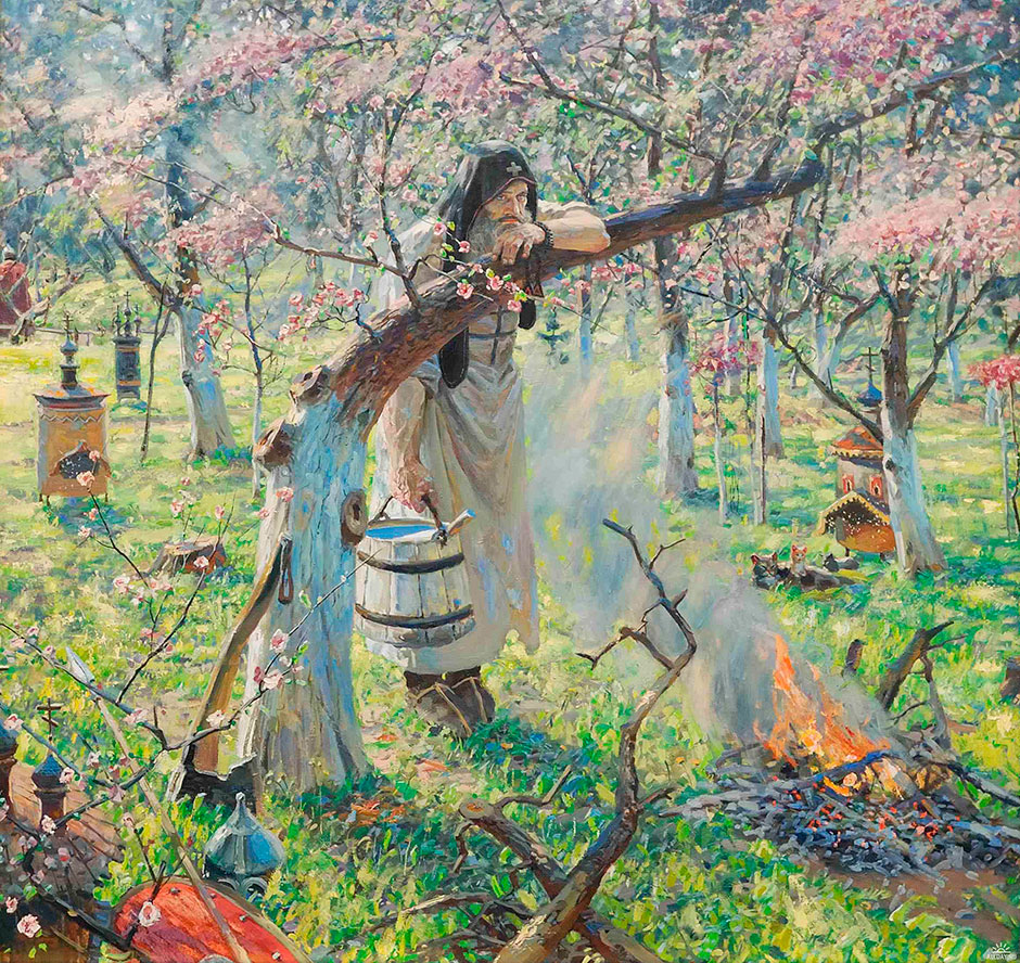 Художник сильно сокрушался, говоря: «Современность в лице средств массовой информации и популярной, мишурной антикультуры добивается от нас забвения главных вопросов бытия человека. Посредством различных пестрых и действующих на самые низменные инстинкты и наклонности шоу «мир» принуждает нас забыть о том, кто мы...», - и далее призывал нас: «Вспомним же вместе, дорогой зритель, о нашем древнем прошлом, о нашем убиенном отце – Государе, сравним нашу теперешнюю жизнь с деятельной, созерцательной – величественной жизнью Государей наших, воинственных предков, простых детей и жен тех времен, о которых «мир» вспоминать не велит нам. Вспомним о них, подумаем о великой цене, которую заплатили они за нас и устыженные, но обнадеженные, взглянем на себя, на свою жизнь поглубже, построже».