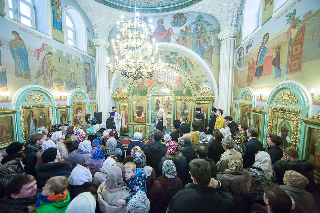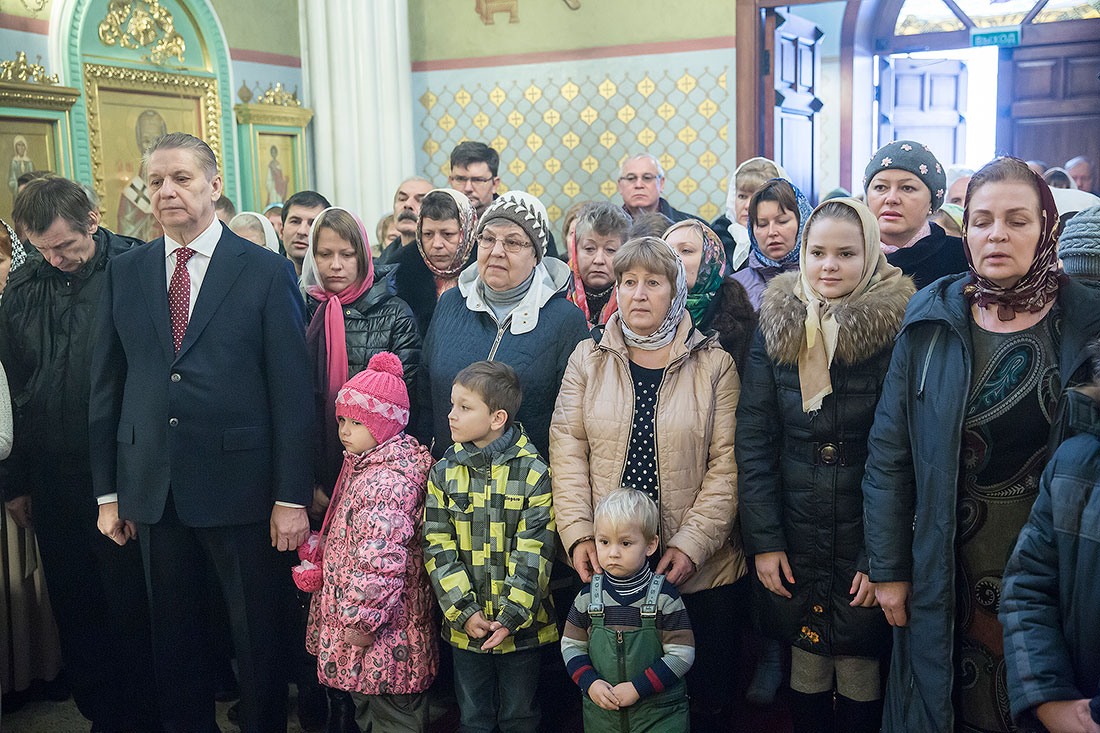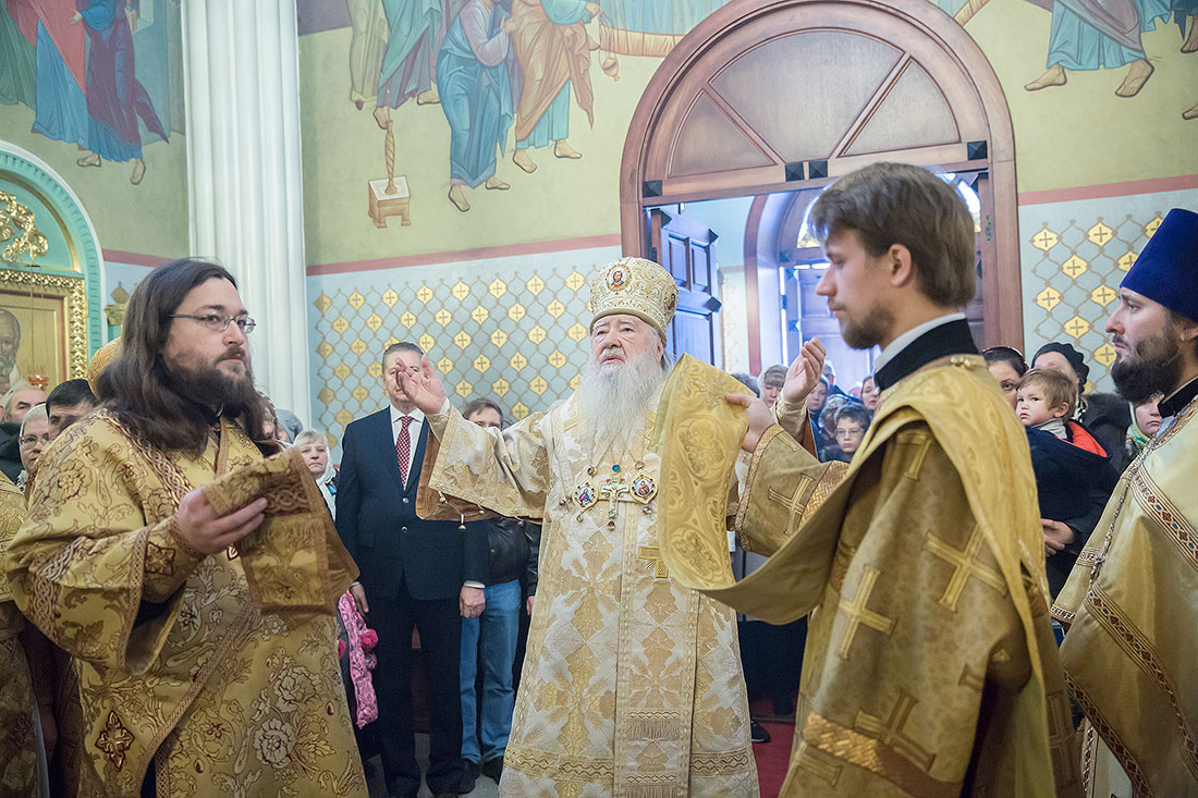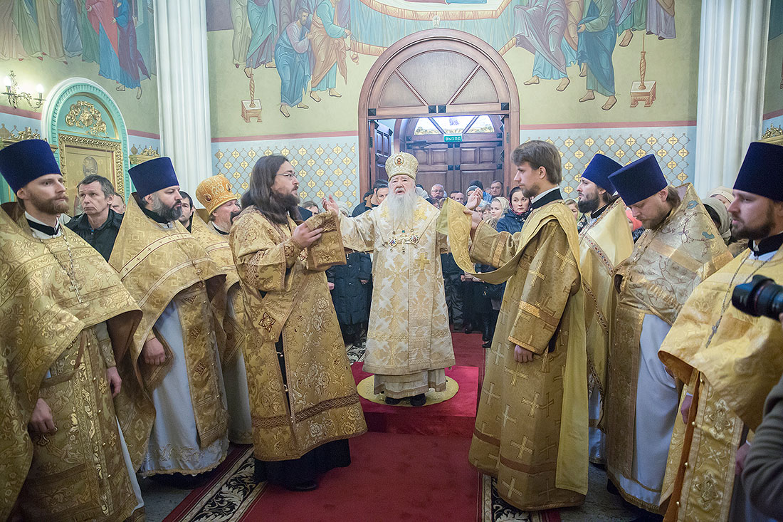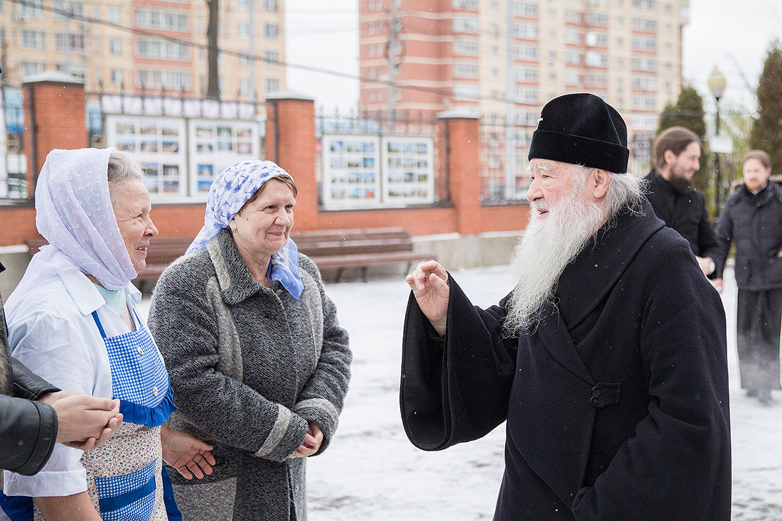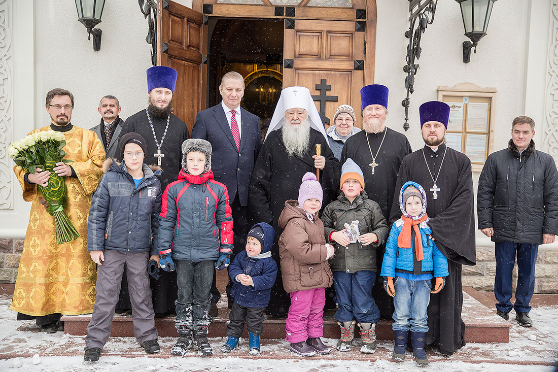 После богослужения Владыка обратился к пастве со следующими словами: «Дорогие и возлюбленные отцы, братья и сестры, уважаемый Игорь Викторович! Я очень рад, что в этот воскресный день Господь сподобил меня вновь совершить Божественную литургию в этом святом храме, посвященном иконе Божией Матери «Спорительница хлебов». Совсем недавно здесь отмечался престольный праздник в честь иконы Божией Матери «Спорительница хлебов», но в силу обстоятельств, я не мог разделить его с вами, но мысленно был здесь. И вот в самое ближайшее время после престольного праздника решил посетить Вас и совершить здесь вместе с вами молитву. Я просил Господа, чтобы он исполнил желание моего сердца. Храм этот – душа предприятия, которое здесь расположено. Здесь совершается Божественная литургия и молятся обо всех людях, в том числе обо всех труждающихся здесь. Помимо этого, в храме Божием мы молимся не только о себе и о близких своих, но вспоминаем всех, кто нуждается в наших молитвах. А сегодня мы особенно это чувствуем, потому что весь мир встревожен теми террористическими актами, которые совершены в Бейруте, в Париже, где много пострадало невинных людей. С ужасом думаешь о том, что люди нарушают Заповедь Божию: «Не убий». Эти страшные преступления возопиют к Небу. К месту гибели людей несут цветы, зажигают свечи. А у нас, православных, есть обычай совершать молитву о них в храме Божием, и сегодня мы с сокрушением сердца молились о погибших людях, чтобы Господь вселил их в Царство Небесное. С этого святого места я выражаю от имени Московской епархии всем родственникам и всем организациям, которых коснулись эти варварские акции, свои соболезнования и заверение в молитвах. Сегодня за Божественной литургией в Послании к Ефесянам святого апостола Павла говорилось, что «Христос есть мир наш». Вот это мы должны всем сердцем воспринимать, дорогие братья и сестры, надеяться на Господа во всех радостных и печальных обстоятельствах, обращаться ко Господу, чтобы он благословил нашу жизнь и дал мир нашим сердцам и людям с метущимися сердцами. Сегодня было много детей за богослужением, и это повод и радости нашей, и надежды. Хочется пожелать, чтобы родители воспитывали детей в вере православной, в любви Христовой. Если так воспитают детей, то они будут счастливы и благословенны. Я поздравляю всех вас с праздником, причастников и причастниц с принятием Святых Христовых Таинств и призываю на всех вас Божие благословение. Храни Вас все Господь!».