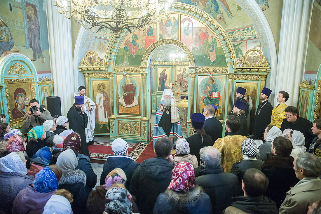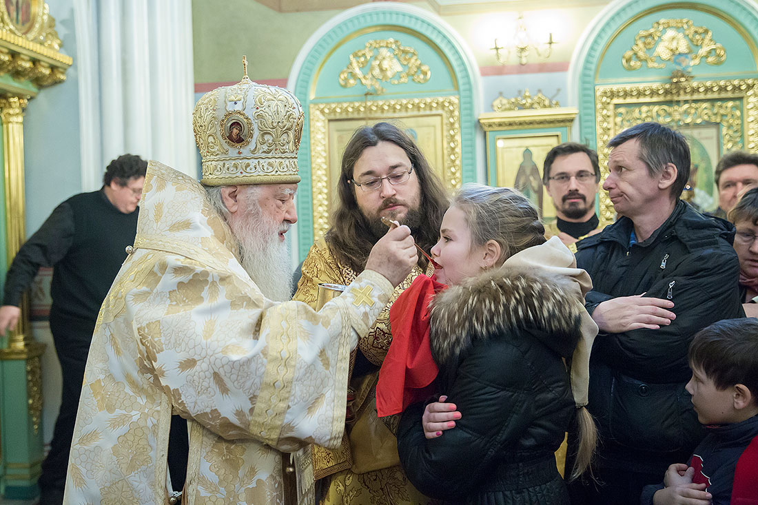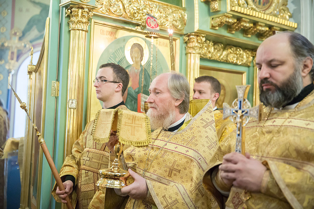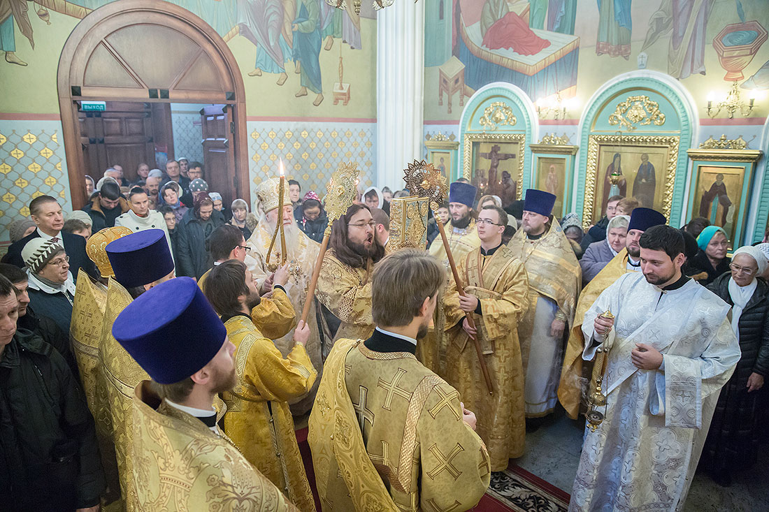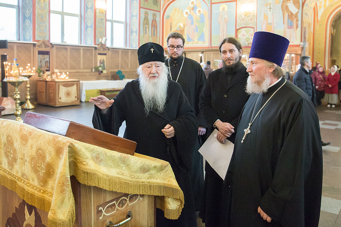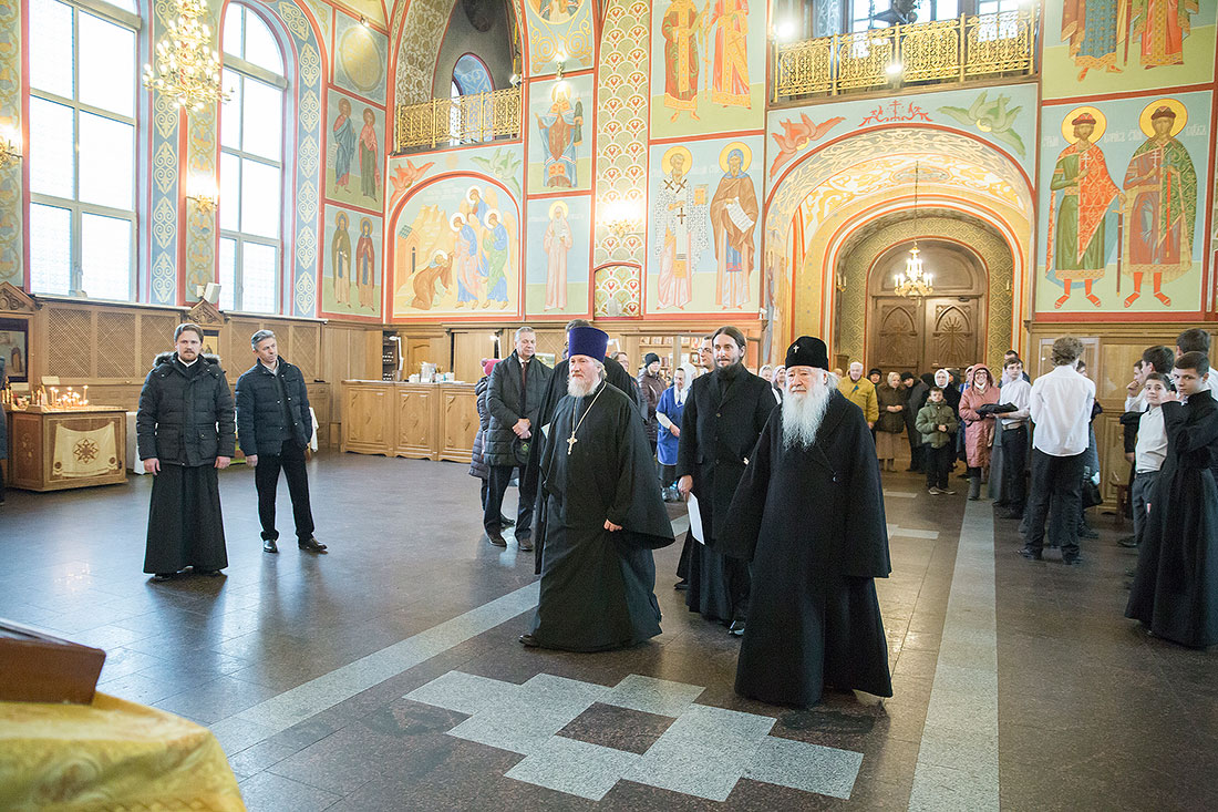 После богослужения Владыка обратился к пастве со следующими словами: «Дорогие и возлюбленные отцы, братья и сестры, уважаемый Игорь Викторович! Я очень рад, что в этот воскресный день Господь сподобил меня вновь совершить Божественную литургию в этом святом храме, посвященном иконе Божией Матери «Спорительница хлебов». Совсем недавно здесь отмечался престольный праздник в честь иконы Божией Матери «Спорительница хлебов», но в силу обстоятельств, я не мог разделить его с вами, но мысленно был здесь. И вот в самое ближайшее время после престольного праздника решил посетить Вас и совершить здесь вместе с вами молитву. Я просил Господа, чтобы он исполнил желание моего сердца. Храм этот – душа предприятия, которое здесь расположено. Здесь совершается Божественная литургия и молятся обо всех людях, в том числе обо всех труждающихся здесь. Помимо этого, в храме Божием мы молимся не только о себе и о близких своих, но вспоминаем всех, кто нуждается в наших молитвах. А сегодня мы особенно это чувствуем, потому что весь мир встревожен теми террористическими актами, которые совершены в Бейруте, в Париже, где много пострадало невинных людей. С ужасом думаешь о том, что люди нарушают Заповедь Божию: «Не убий». Эти страшные преступления возопиют к Небу. К месту гибели людей несут цветы, зажигают свечи. А у нас, православных, есть обычай совершать молитву о них в храме Божием, и сегодня мы с сокрушением сердца молились о погибших людях, чтобы Господь вселил их в Царство Небесное. С этого святого места я выражаю от имени Московской епархии всем родственникам и всем организациям, которых коснулись эти варварские акции, свои соболезнования и заверение в молитвах. Сегодня за Божественной литургией в Послании к Ефесянам святого апостола Павла говорилось, что «Христос есть мир наш». Вот это мы должны всем сердцем воспринимать, дорогие братья и сестры, надеяться на Господа во всех радостных и печальных обстоятельствах, обращаться ко Господу, чтобы он благословил нашу жизнь и дал мир нашим сердцам и людям с метущимися сердцами. Сегодня было много детей за богослужением, и это повод и радости нашей, и надежды. Хочется пожелать, чтобы родители воспитывали детей в вере православной, в любви Христовой. Если так воспитают детей, то они будут счастливы и благословенны. Я поздравляю всех вас с праздником, причастников и причастниц с принятием Святых Христовых Таинств и призываю на всех вас Божие благословение. Храни Вас все Господь!».