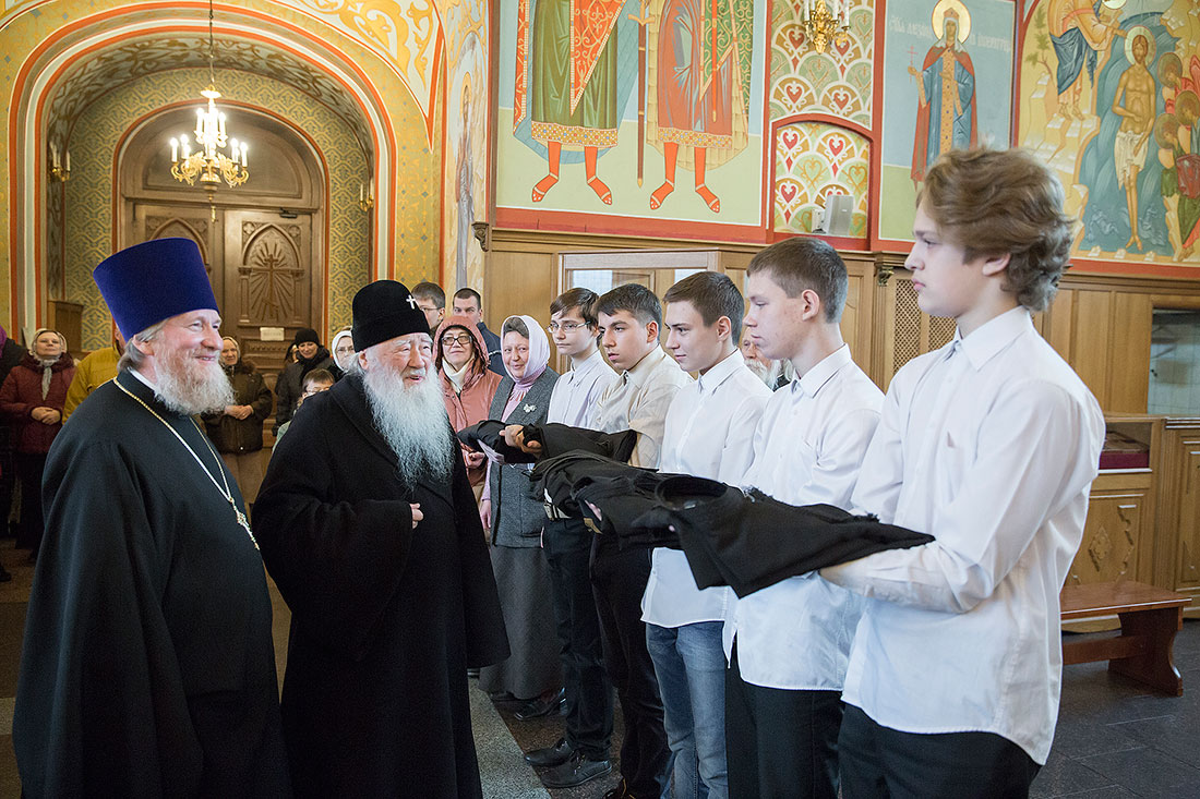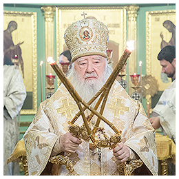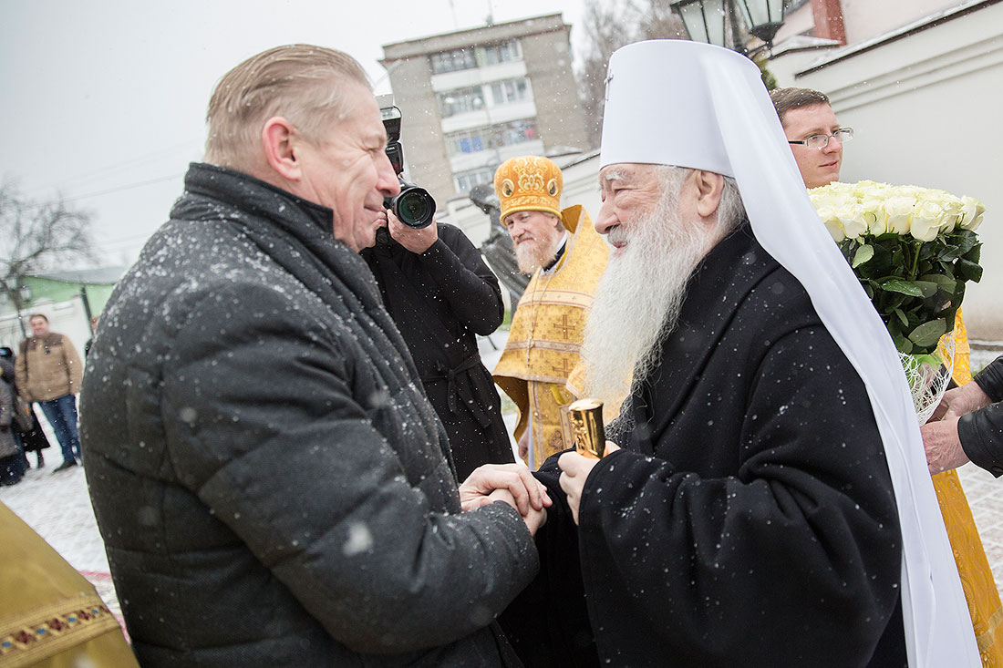 С этими словами Вы обратились ко всем верующим в храме. Эти слова относятся ко всем православным христианам Московской епархии, потому что наш долг восстановить храмы. И поздравляя Вас с днем вашего 80-летия, хочется пожелать Вам, дорогой Владыка, крепкого здоровья, чтобы Господь дал Вам сил и Вы увидели все порушенные храмы восстановленными, смогли послужить в одном из восстановленных храмов в этом облачении, которое с любовью Вам сегодня преподносим». Игорь Викторович Ларин и благочинный Щелковского округа протоиерей Андрей Ковальчук преподнесли Владыке архиерейское облачение и митру.