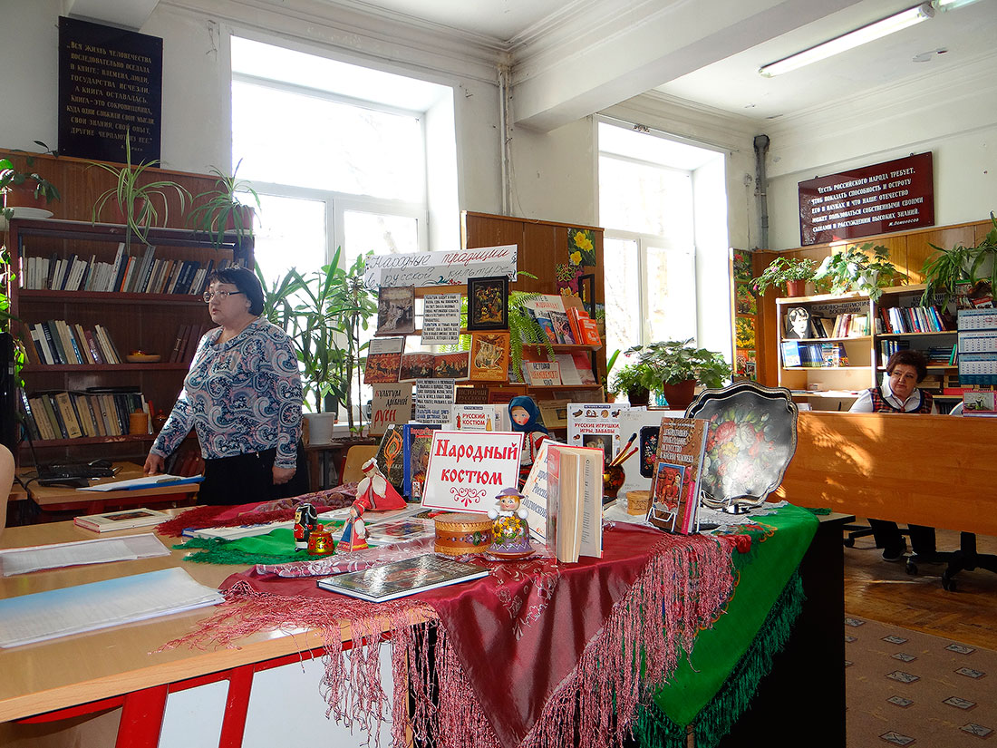 Сотрудниками Православного духовно-просветительского центра "Благовест" была оформлена книжно-иллюстративная экспозиция "Традиции русского быта: народный костюм, народные промыслы", включающая предметы хохломы, жостовские подносы, гжель, красочные шали, изделия лаковой миниатюры, а также были подготовлены презентации и доклады "Русский народный костюм", "Русские народные промыслы: видео-галерея". Завершился урок показом музыкального видеоролика "Народные промыслы России".