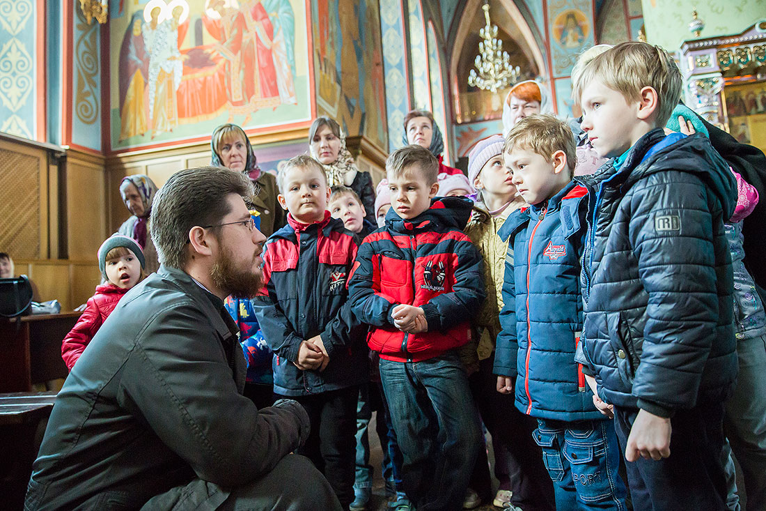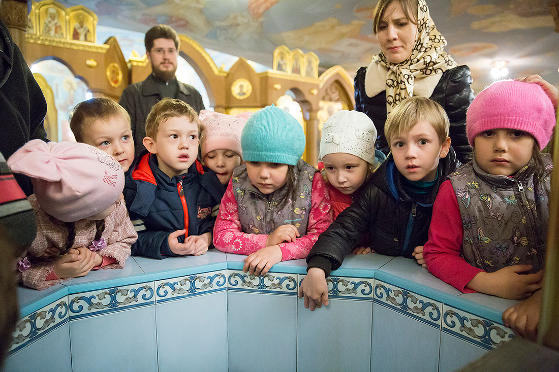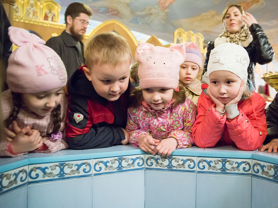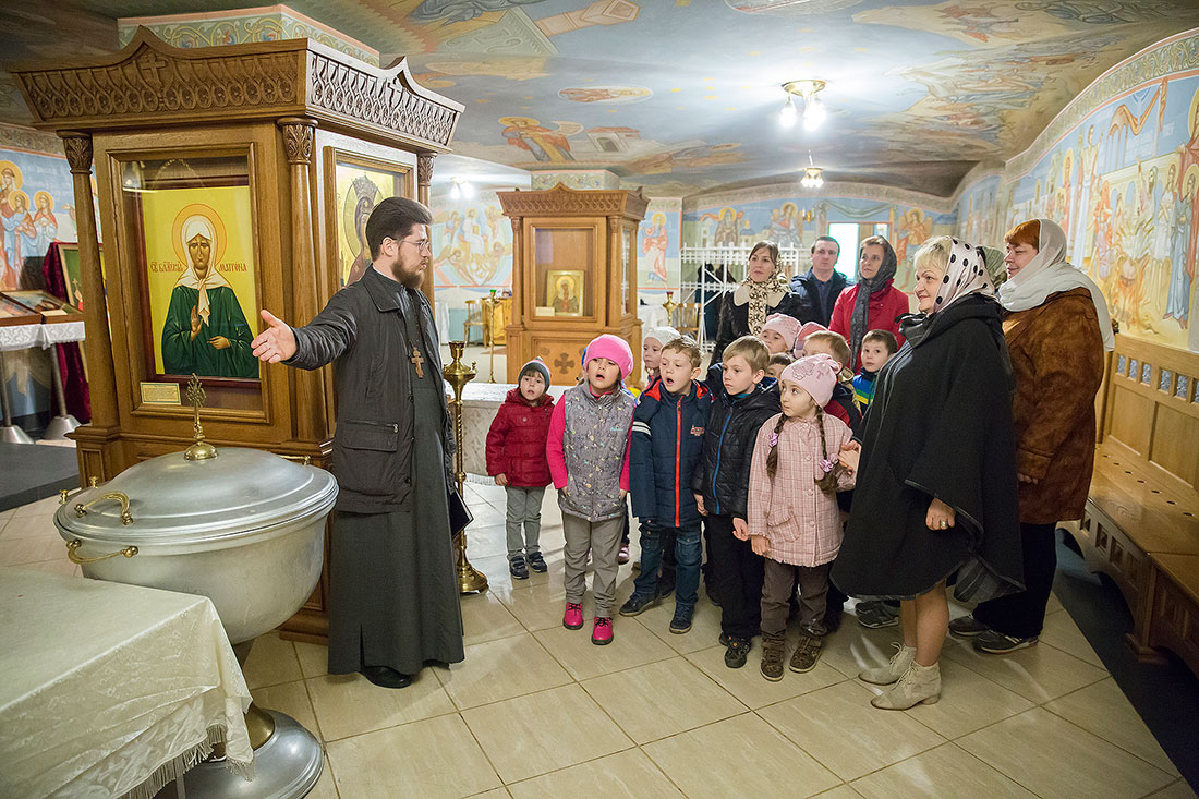 Ребятишки узнали много интересного – об устройстве храме и иконостаса, побывали в нижнем храме, посвященном свв. мцц. Вере, Надежде, Любови и матери их Софии, а потом сделали памятные снимки со священником.