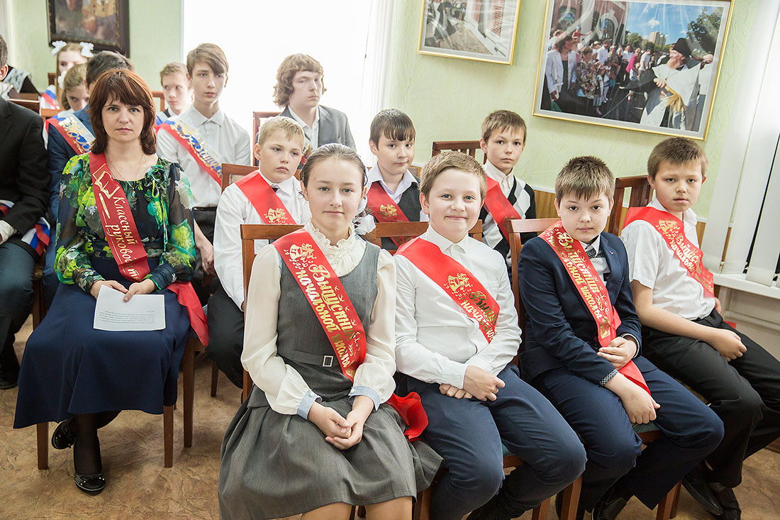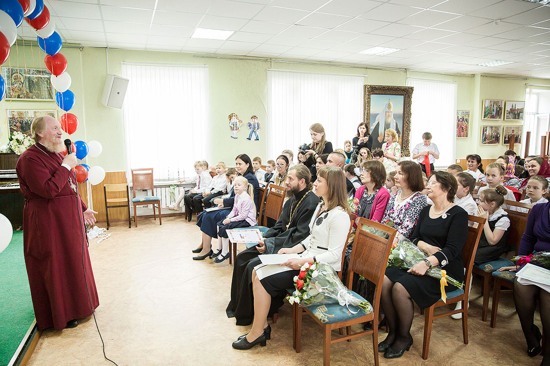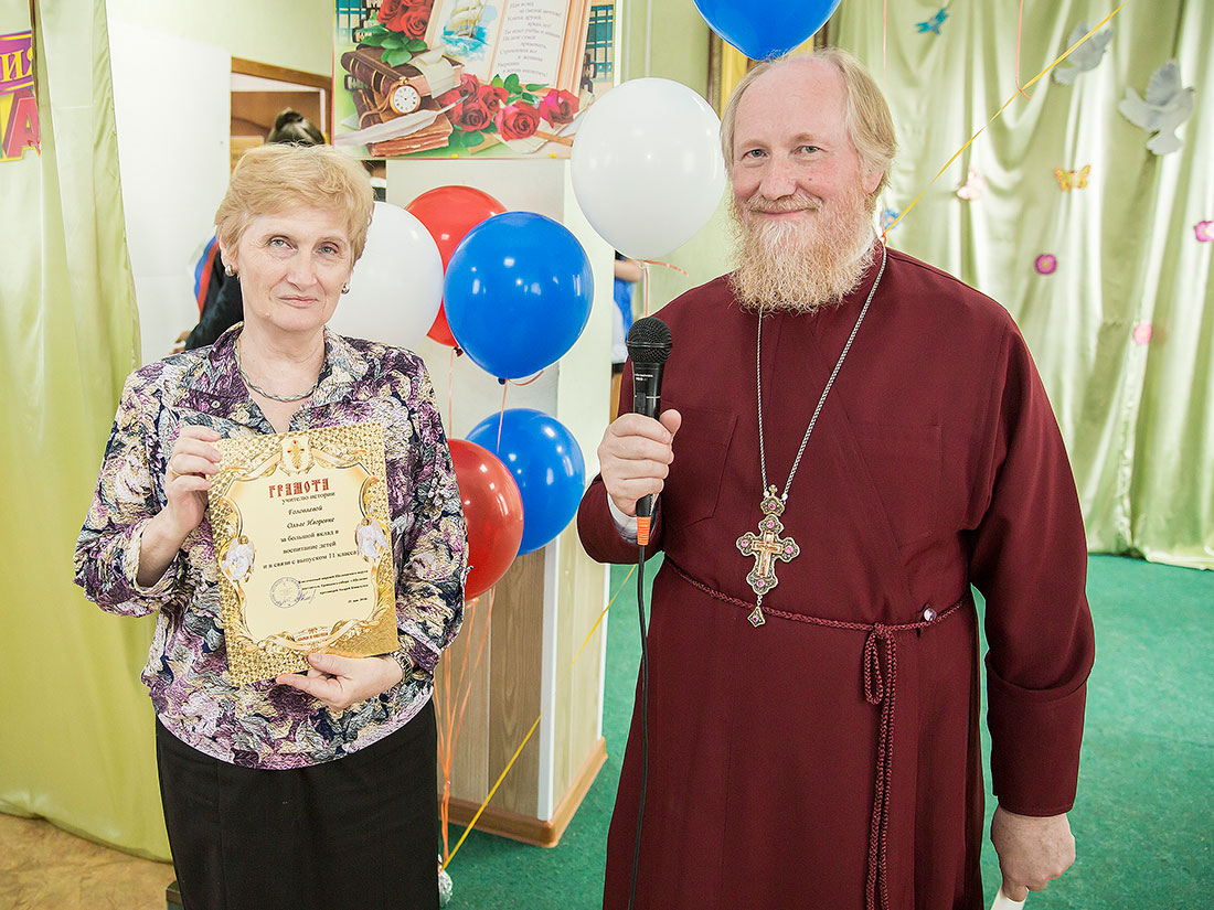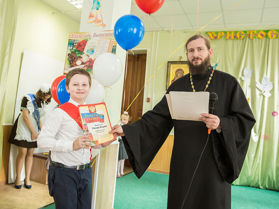 Праздник «Последнего звонка» продолжился в конференц-зале, здесь чествовали выпускников начальной школы, 9-х и 11–х классов. Классные руководители напутствовали ребят, ученики – благодарили своих учителей и дарили им стихи, песни, танцы и цветы. От учительского коллектива выступила заведующая учебно-воспитательной частью А.В. Лыгина, которая поздравила всех с окончанием учебного года. Заведующий Гимназии священник Максим Алифанов вручил похвальную грамоту за успехи в изучении отдельных предметов за весь период обучения ученику 9 класса Вязникову Сергею, а также похвальные листы за отличные успехи в учебе по итогам года - Жарову Максиму (6 класс), Костиной Ксении, Легких Варваре (2 класс), Князевой Татьяне, Кагитиной Марии (3 класс); почетные грамоты получили Захаров Иван (2 класс), Новиков Никита (4 класс). С благодарственным словом обратились к священнослужителям и педагогам родители Манюкова Н.В. и Туманова С.С., они поблагодарили за тот духовный фундамент, который дала гимназия их детям.