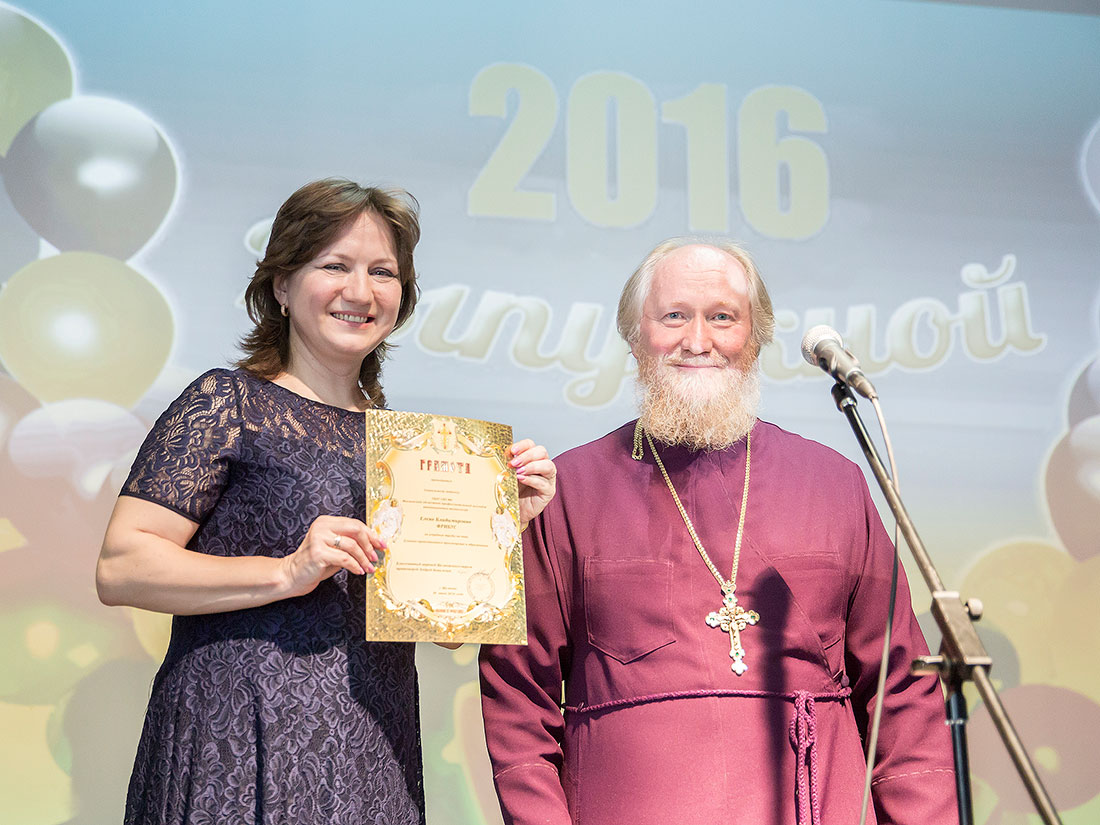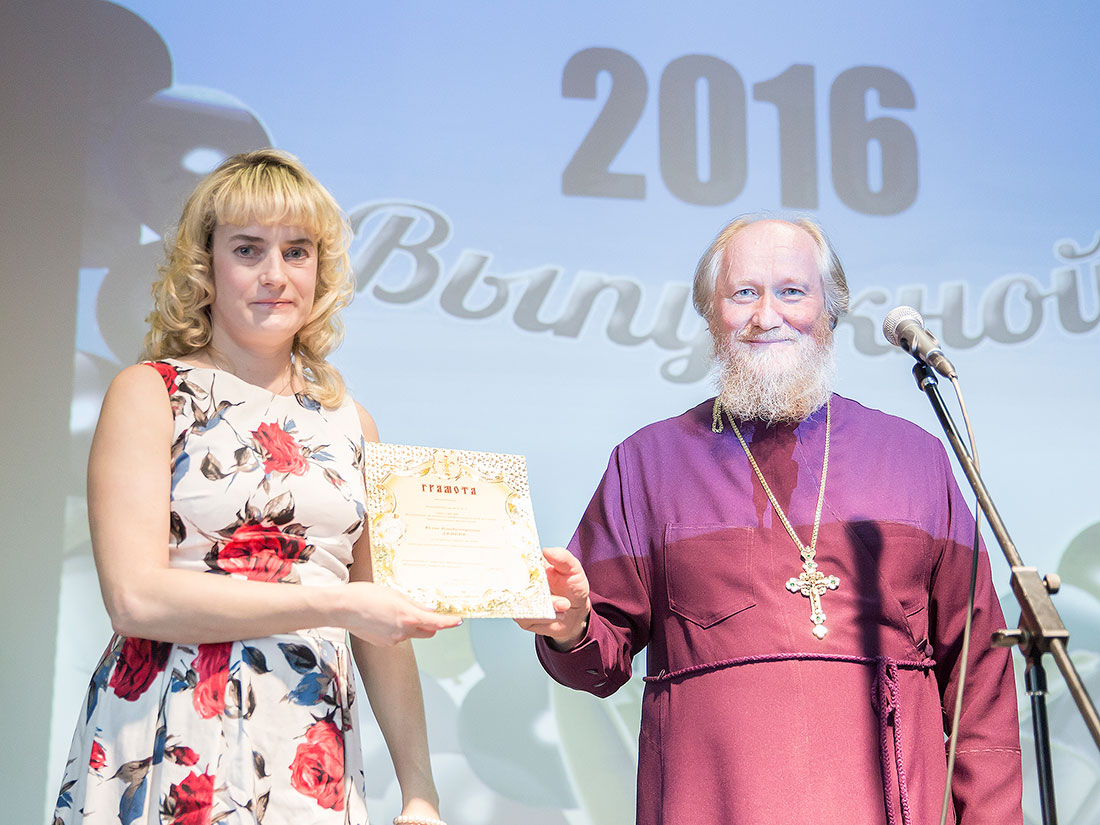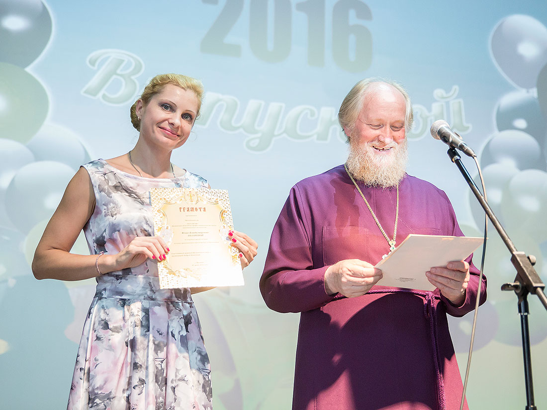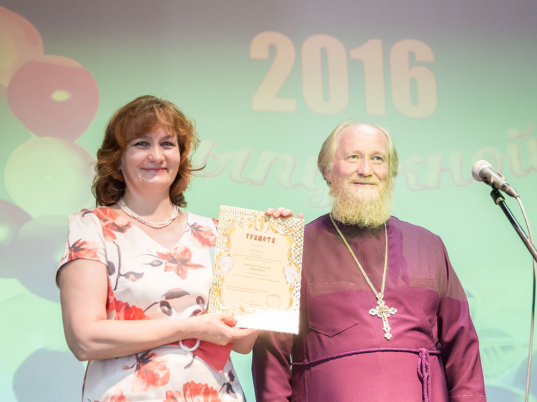 Отец Андрей поздравил выпускников с окончанием образования и наградил директора колледжа Джикию Юлию Владимировну и преподавателей грамотами Щелковского благочиния.