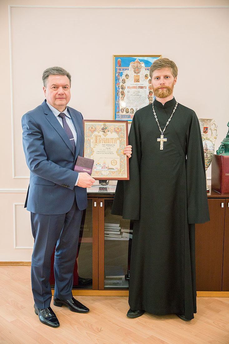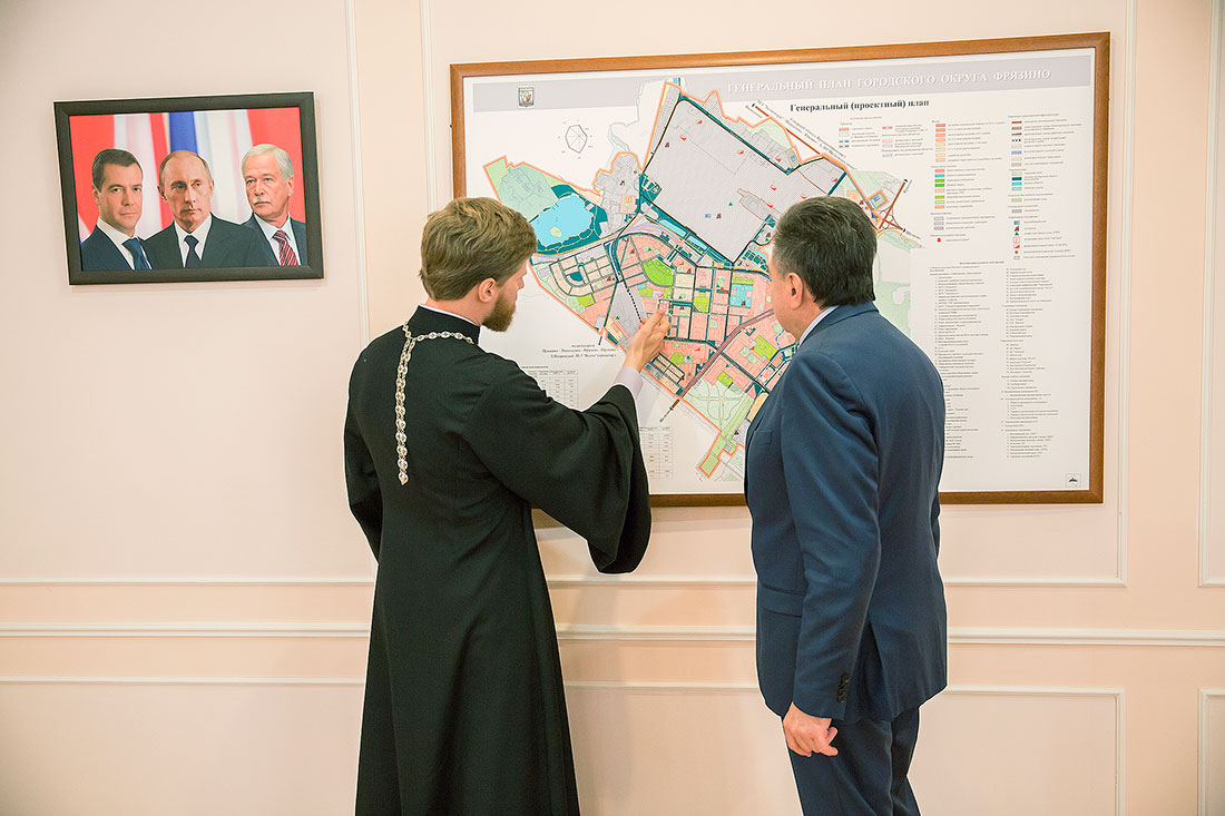 По благословению митрополита Крутицкого и Коломенского Ювеналия отец Димитрий вручил главе города Благословенную грамоту и походную Библию с пожеланиями Божией помощи в его нелегком служении на благо Наукограда и Отечества. Также, по просьбе благочинного протоиерея Андрея, обсудили вопросы, связанные со строительством нового храма на территории бывшей военной части, закладка которого запланирована на следующий год.
