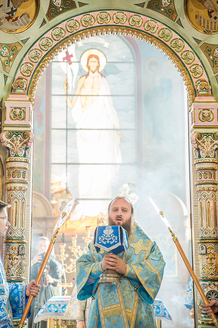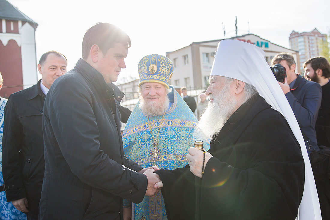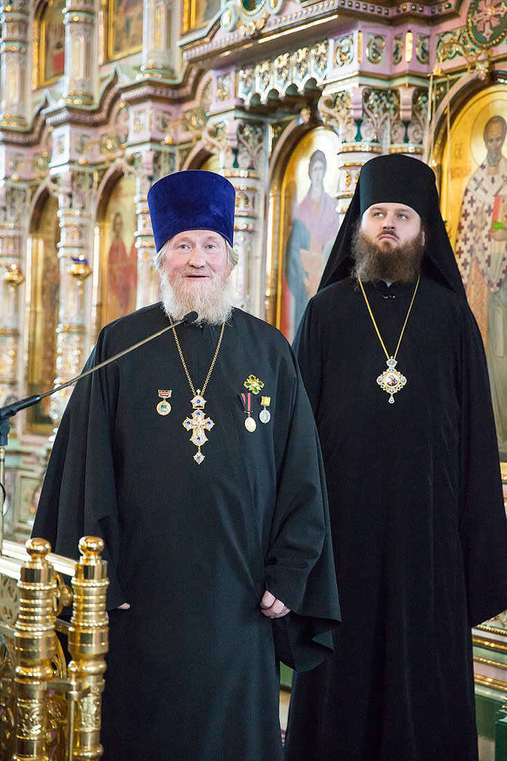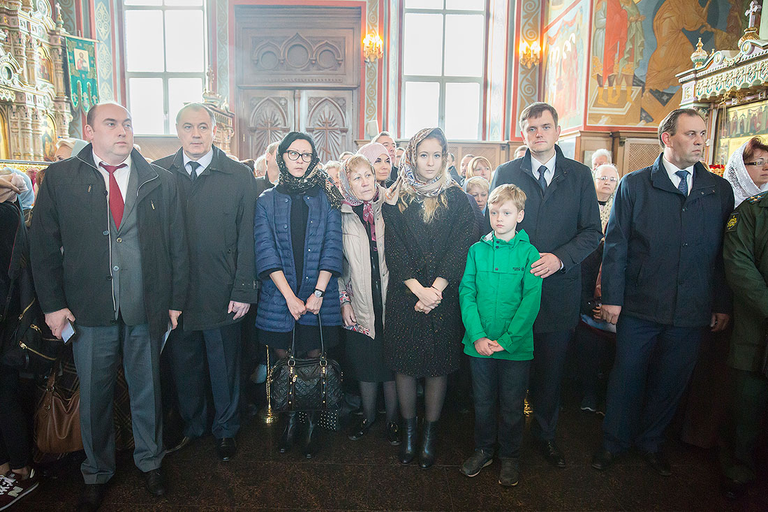 Его Высокопреосвященству сослужили: епископ Зарайский Константин, благочинные церковных округов: Щелковского – протоиерей Андрей Ковальчук, Одинцовского – архимандрит Нестор (Желяев), Красногорского – протоиерей Константин Островский, Орехово-Зуевского – протоиерей Андрей Коробков, Лосино-Петровского – священник Павел Галушко, заведующий канцелярией Московской епархии иеромонах Сергий Александров.