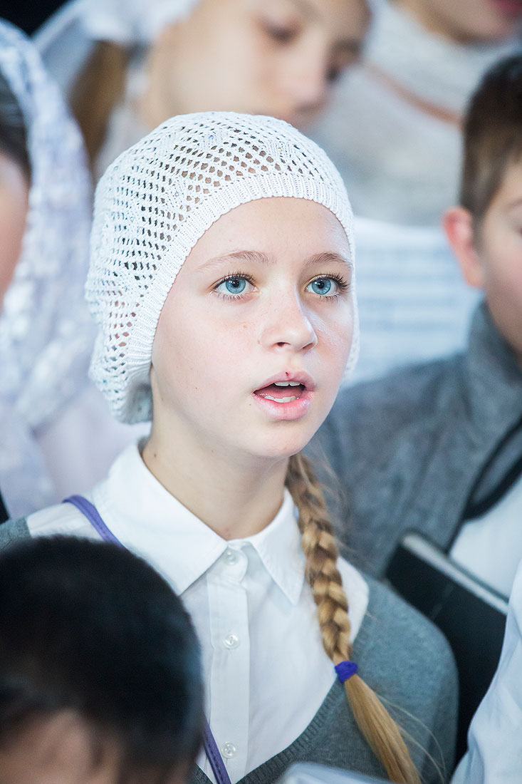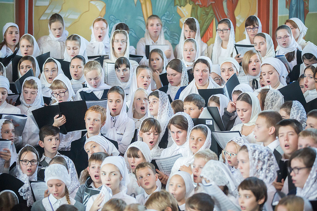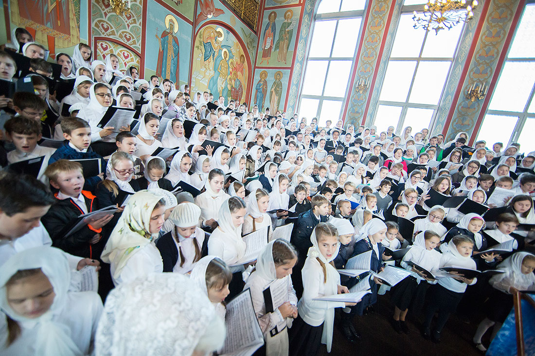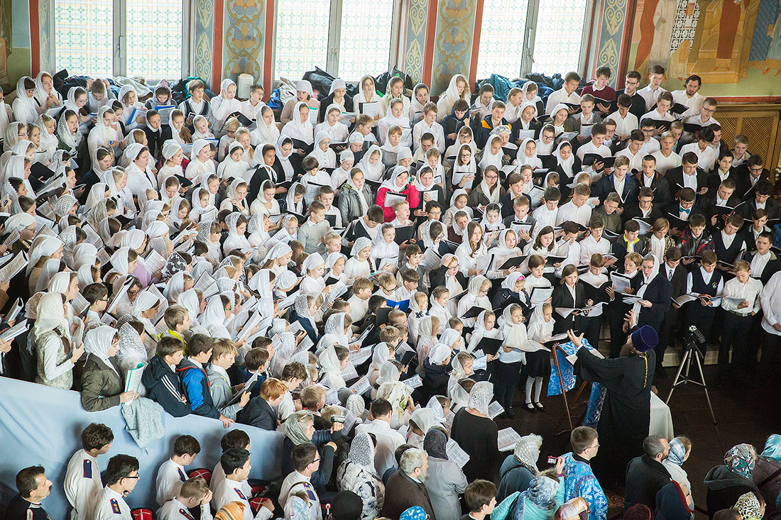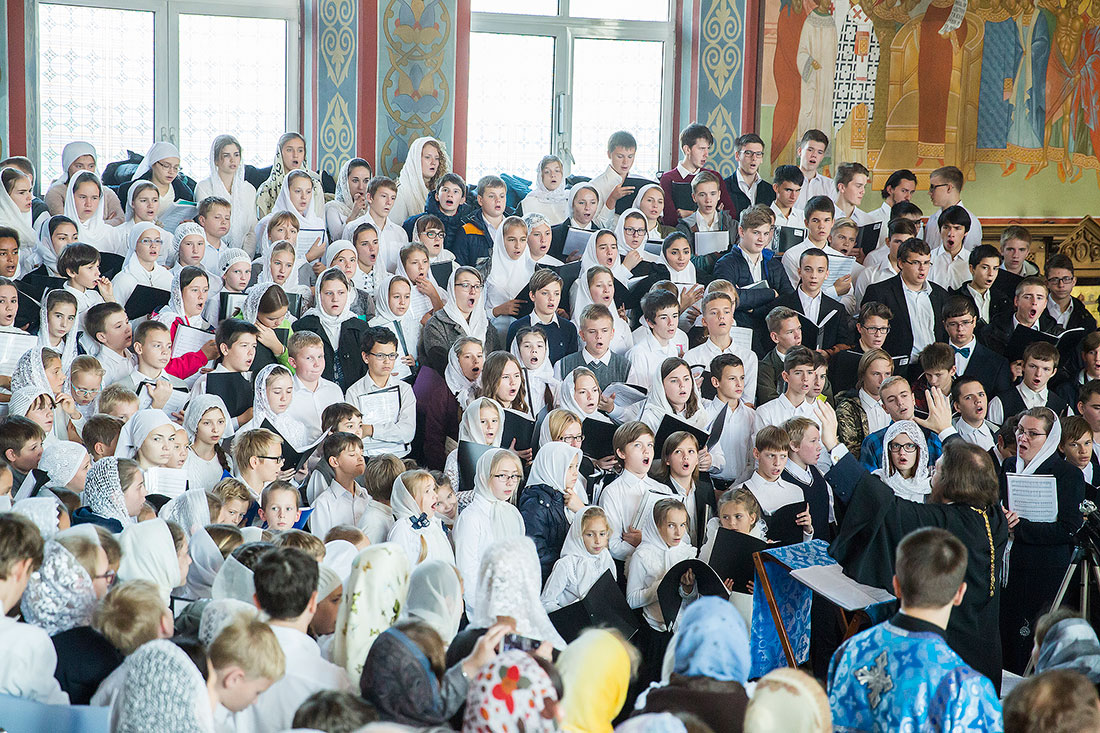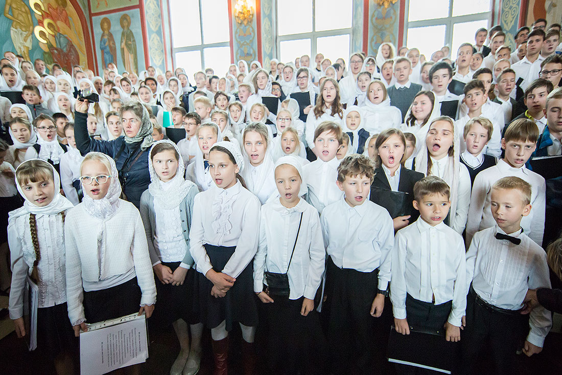 Воцерковленные дети с большой радостью возносили песнопения Богу. Вместе с хором за Божественной литургией молились учащиеся православной гимназий «Ковчег» и воскресной школы, воспитанники Кадетского казачьего центра Цесаревича Алексия, всего более 600 детей. Апостольское послание читал одиннадцатилетний пономарь Новодевичьего монастыря Федор Гришаев.
