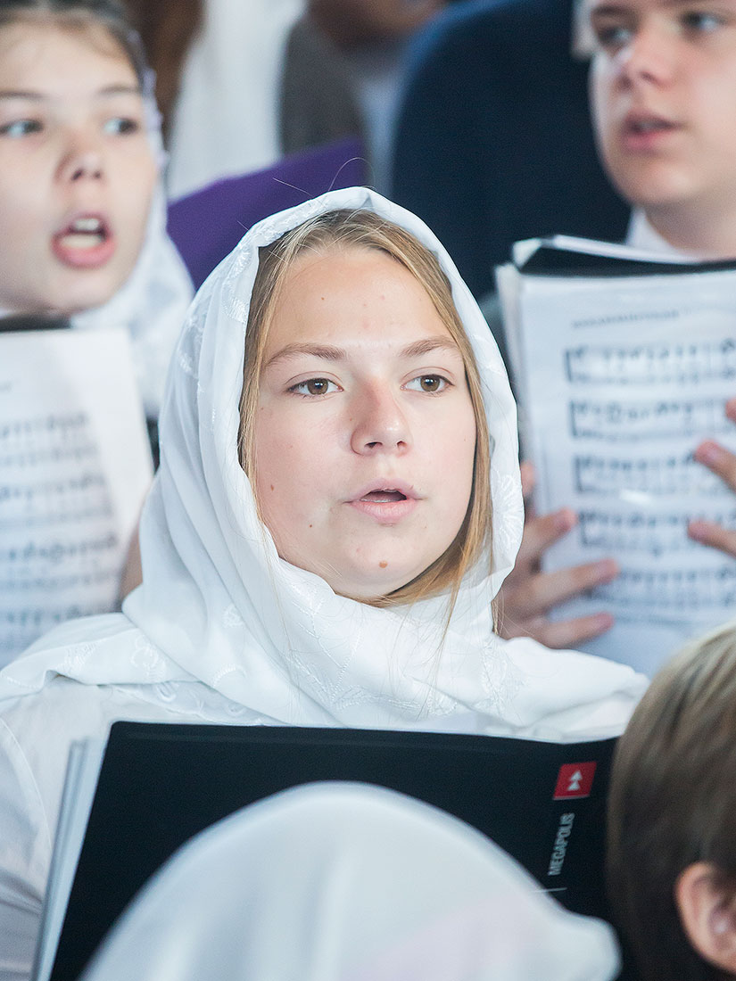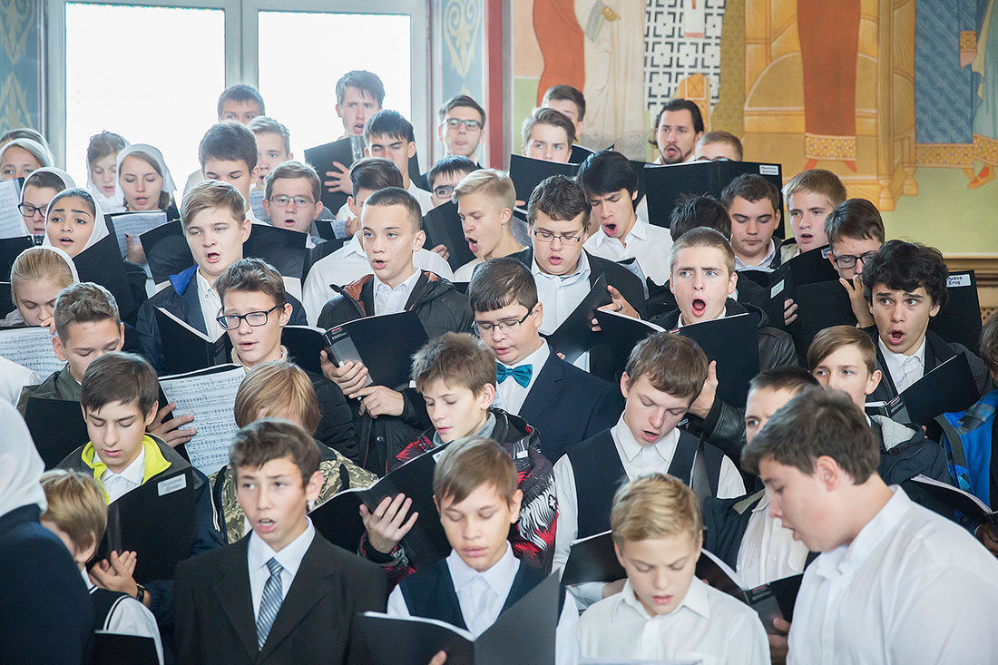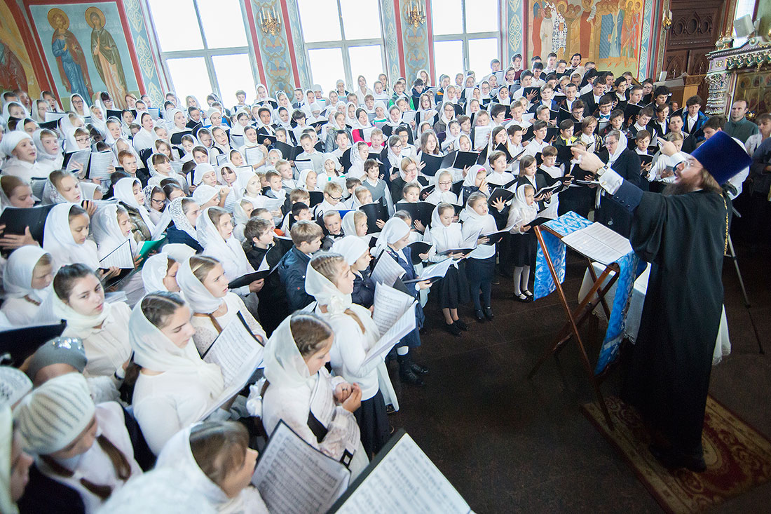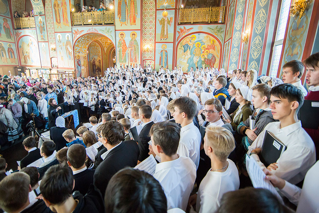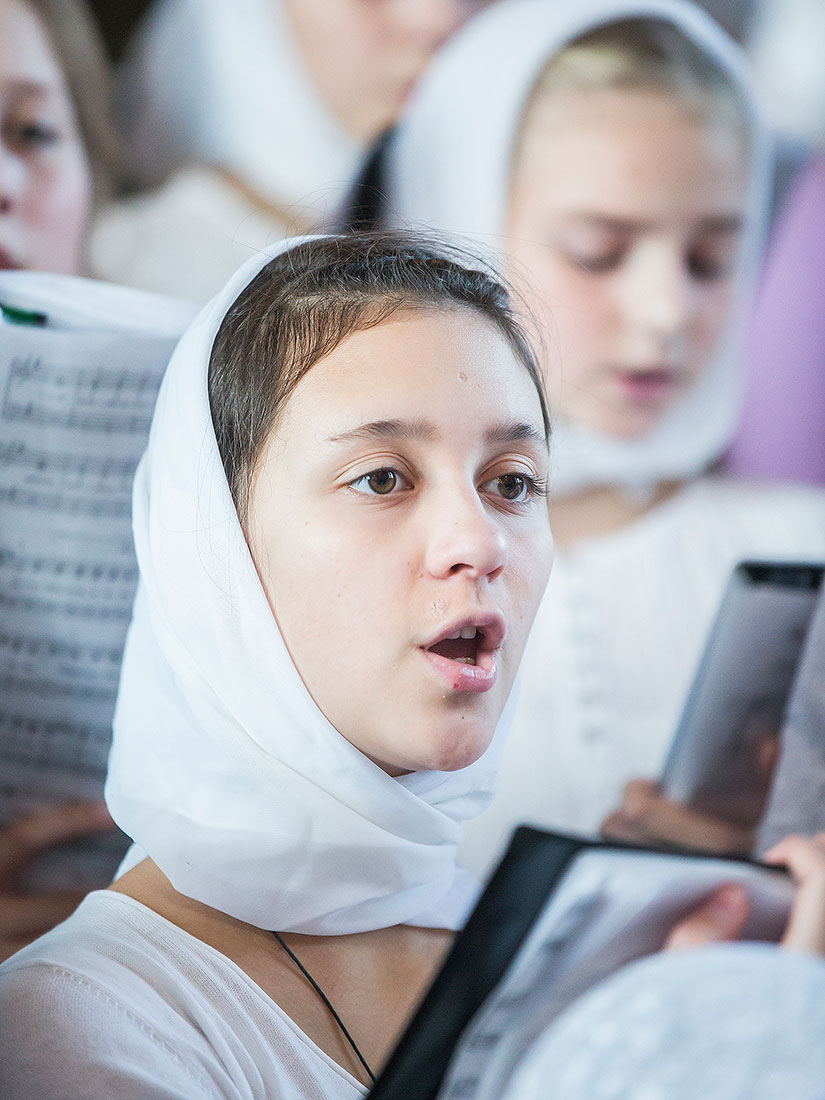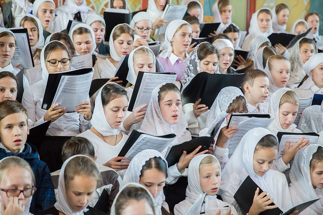 Воцерковленные дети с большой радостью возносили песнопения Богу. Вместе с хором за Божественной литургией молились учащиеся православной гимназий «Ковчег» и воскресной школы, воспитанники Кадетского казачьего центра Цесаревича Алексия, всего более 600 детей. Апостольское послание читал одиннадцатилетний пономарь Новодевичьего монастыря Федор Гришаев.