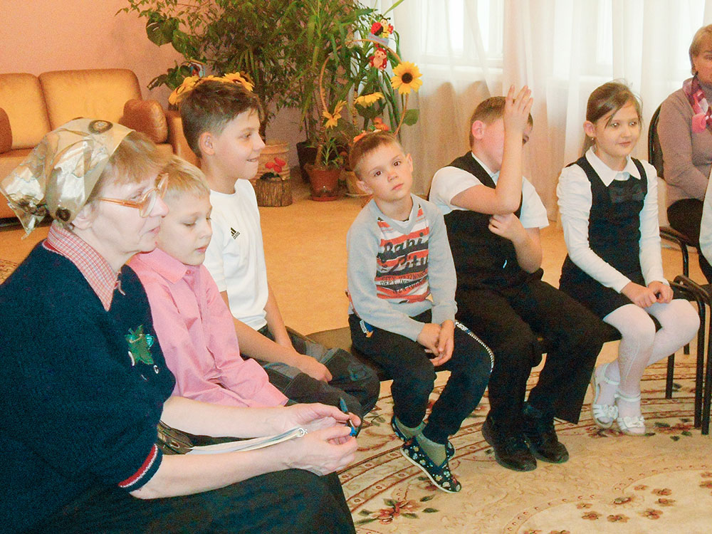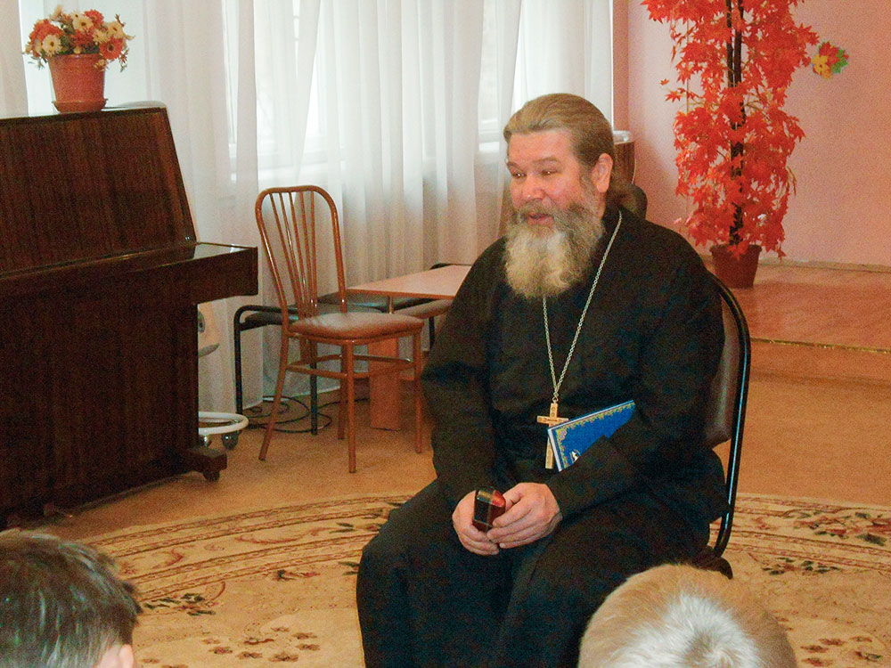 Дети только что пришли из школы и ждали гостей с нетерпением в светлом, уютном зале. Ребята общались с батюшкой и задавали ему различные вопросы.