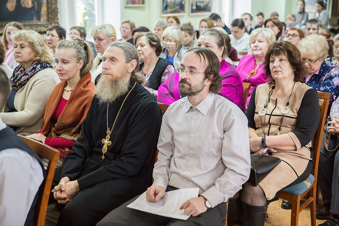 С приветственным словом к педагогам, священнослужителям и старшеклассникам православной гимназии «Ковчег» обратились благочинный церквей Щелковского округа протоиерей Андрей Ковальчук и председатель Комитета по вопросам образования Щелковского муниципального района Г. Б. Поляковский. Затем ведущий мероприятия, настоятель Спасского храма с. Каблуково протоиерей Сергий Дубинин открыл конференцию «1917-2017: уроки столетия». После просмотра небольшого видеосюжета «Гонения на Церковь в России XX века», последовали доклады, темы которых раскрывали слушателям трагичные страницы российской истории. Ключарь Троицкого собора г. Щелково священник Александр Амелин рассказал о Поместном Соборе Русской Православной Церкви 1917-1918 гг. Учитель истории Щелковской общеобразовательной школы № 16 Тимофей Александровича Балыко поделился новыми архивными находками о последних годах жизни Щелковского священномученика Василия Крылова. Доклад священника Дмитрия Выдумкина «Разрушенные и возрожденные святыни Щелковского округа» сопровождался показом фотографий храмов благочиния, сделанные в годы разрухи и их современный вид. Выступление учеников православной гимназии «Ковчег» с декламацией стихов щелковского поэта Сергия Савельева о «Троицком соборе» продолжила учитель русского языка и литературы Елена Борисовна Быковская. Тема ее доклада «Христианские мотивы и осмысление русской истории в творчестве Александра Блока» показала, как надломлена и опустошена была русская душа без веры, как отражалось это настроение интеллигенции в творчестве русских поэтов и писателей. Завершило конференцию выступление лауреата Международных конкурсов исполнителей на баяне и аккордеоне Романа Галиева, его доклад «Сохранение духовного и культурного наследия – диалог поколений» сопровождало музыкальное исполнение классических произведений композиторов начала XX века. В ходе конференции задавались вопросы докладчикам, и шло живое обсуждение темы конференции.