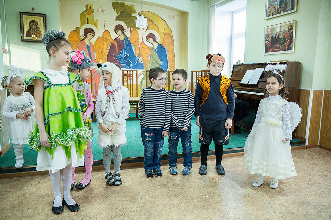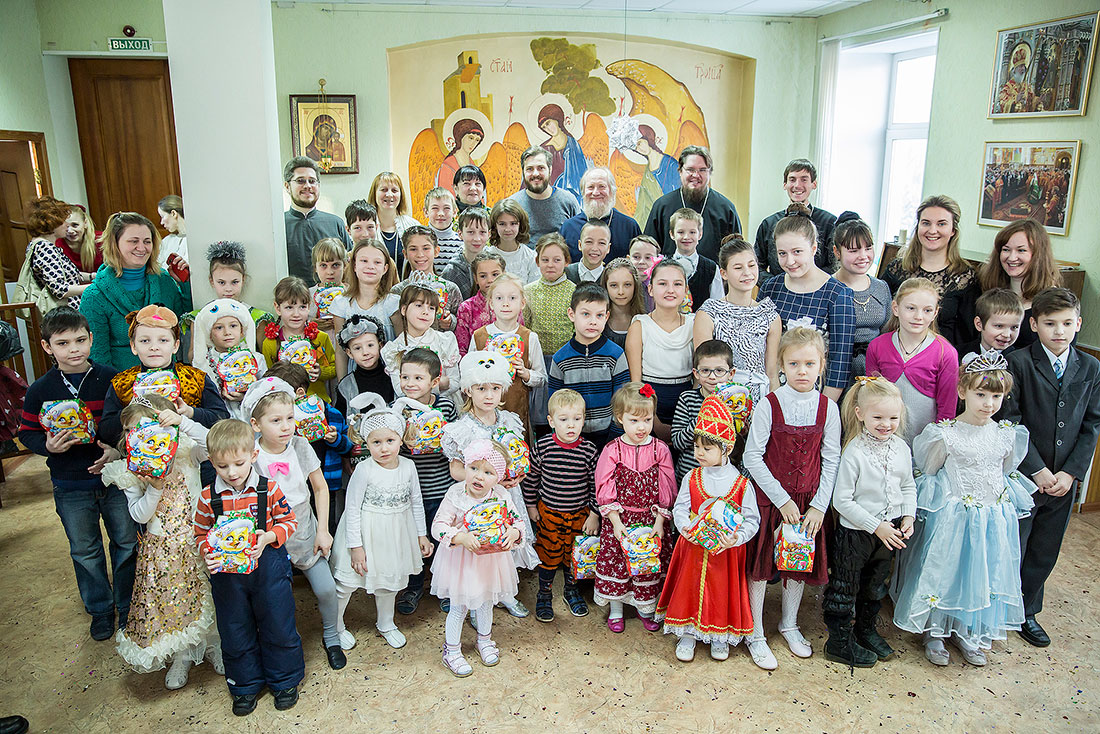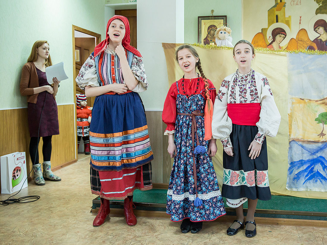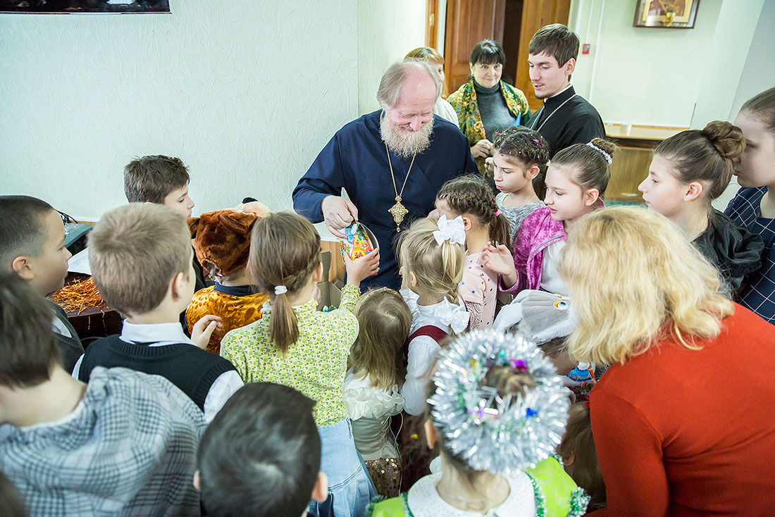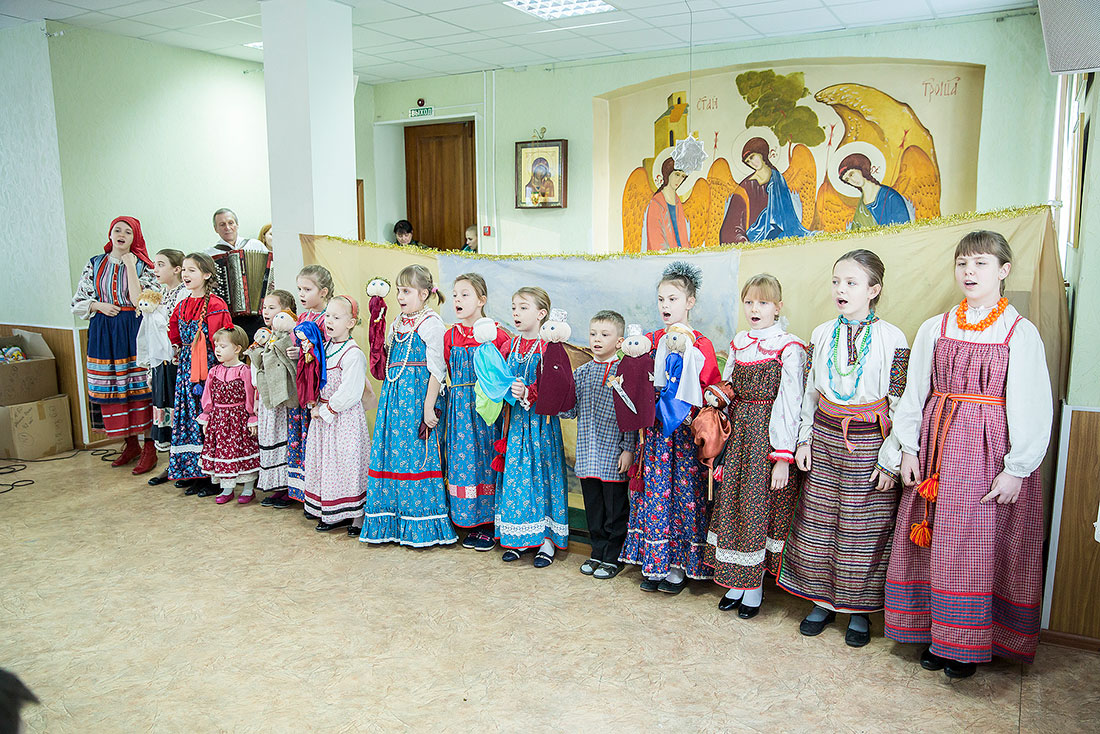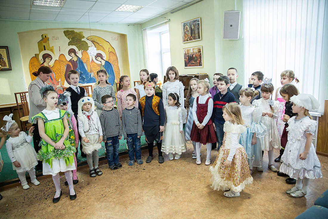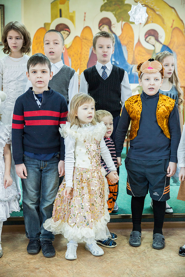 Многие ребята в этот день причащаются Святых Христовых Таин, а затем, переодевшись в нарядные костюмы, становятся участниками праздничного выступления. Они читают стихи, поют песни и показывают театрализованные постановки. Вот и сегодня, несмотря на крепчайший мороз, в конференц-зале Троицкого собора собрался полный зал.