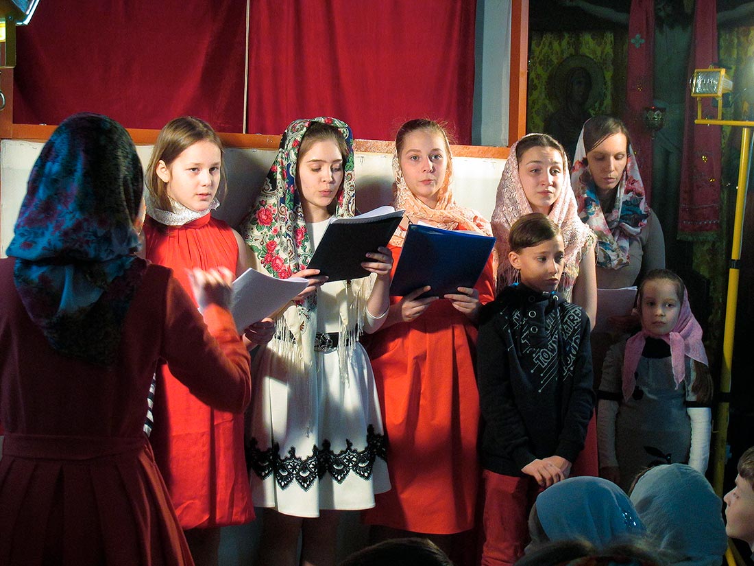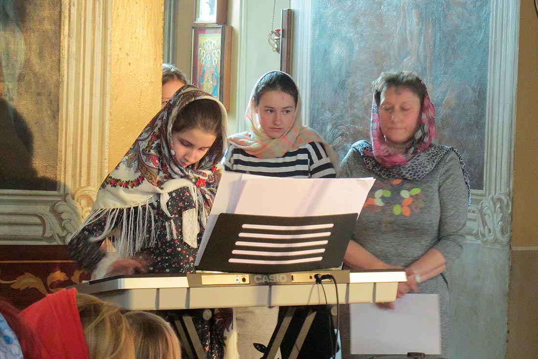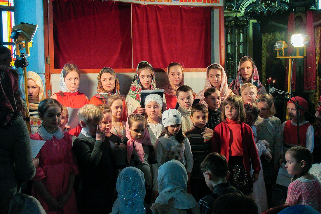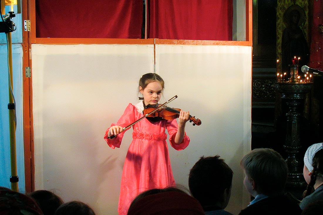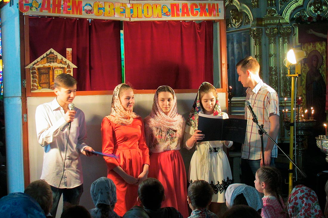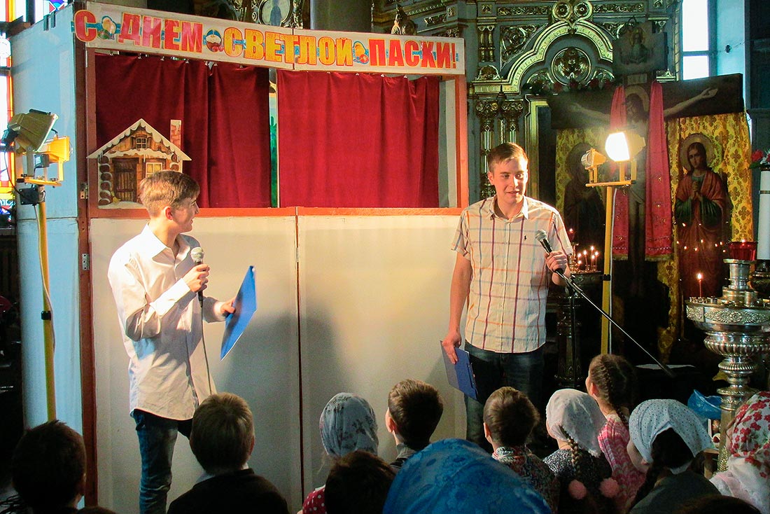 Воспитанники дошкольной группы поставили спектакли «Теремок» (по мотивам сказки «Настенька») и «Зайкина избушка», а затем завершили свое выступление замечательной пасхальной песенкой «Сегодня у окошка чирикнул воробей». Ребята средней группы показали спектакль «Пасхальное яичко» и «Премудрый царь». Между спектаклями Варя Огнева исполнила на синтезаторе «Испанскую полька», а Мария Котляр на скрипке - произведение «Зайчик». Детский юношеский хор порадовал зрителей песнями: «Бог мой храни меня», «Христос Воскрес», «Пасха ранняя» и «Пасхальное яичко».
