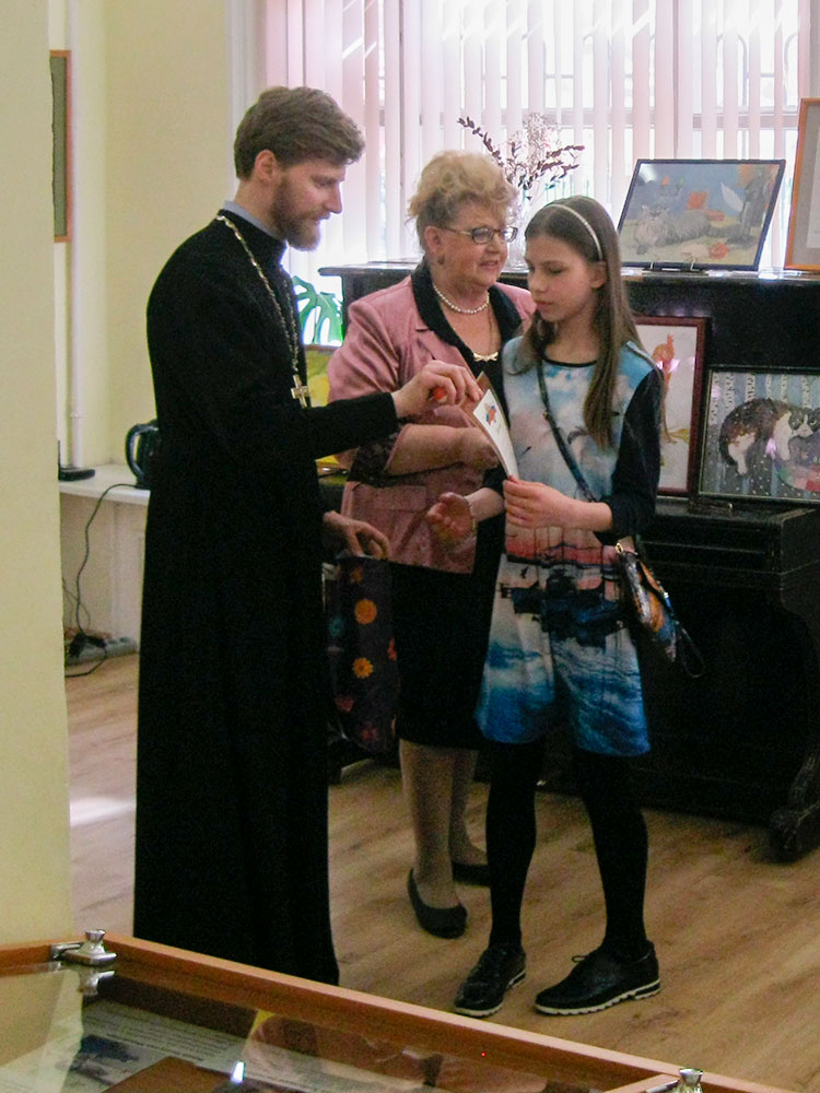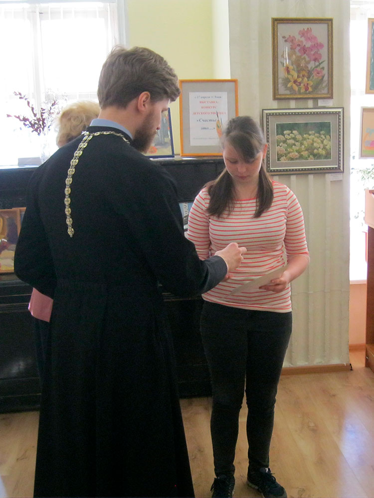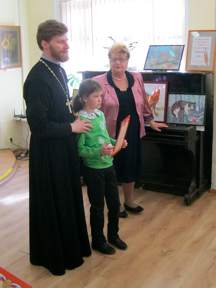 Директор Культурного центра В.Н. Сергеева и настоятель Державного храма священник Димитрий Поповский вручили детям дипломы и сладкие подарки. Самым-самым был признан рисунок воспитанницы Воскресной школы Державного храма Ксении Брель. Все работы можно увидеть на проходящей в Культурном центре выставке детского рисунка.