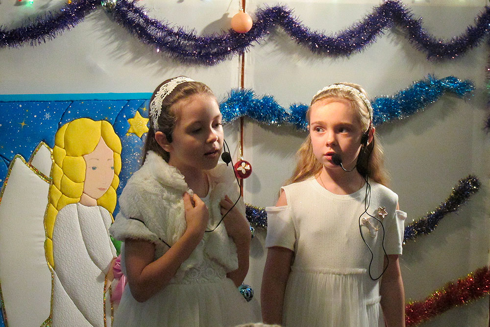 Праздник открыл детско-юношеский хор, исполнив тропарь Рождества Христова. Младшая группа (дошкольного возраста) продолжили праздник сценкой о событиях свершившихся в святую ночь, и поведали зрителям о Рождении Христа. Праздник сопровождался рождественскими песнопениями. Учащиеся средней группы исполнили песнопения: «В ночном саду», «Рождественская песня», и дуэт девочек Евсеева Екатерина и Полина Соловьева исполнили «Ночь свята над Палестиной».