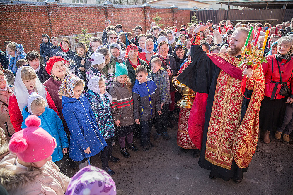 Затем отец Александр вместе с клириком собора священником Димитрием Медведевым совершил праздничный пасхальный крестный хор вокруг храма. В крестном ходе участвовали учащиеся православной гимназии "Ковчег" г. Щелково.