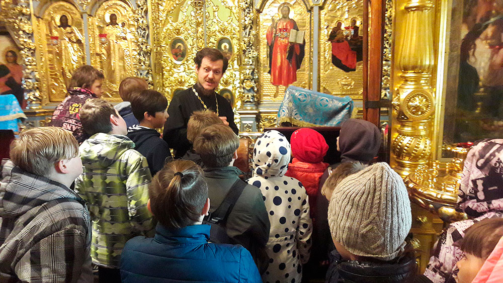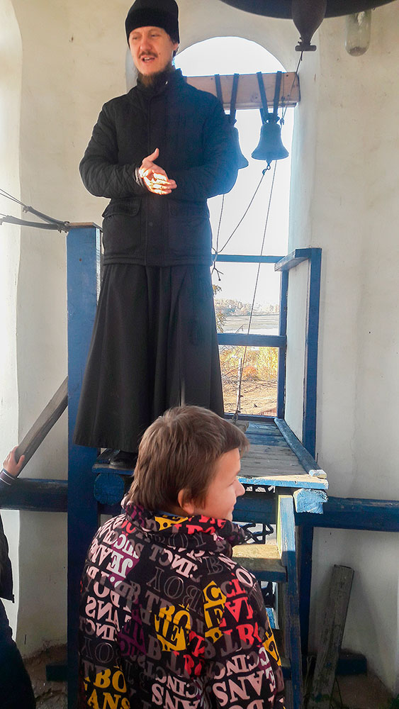 Во время экскурсии ребята познакомились с историей храма, послушали рассказ о некоторых особо почитаемых древних иконах храма, узнали о том, что такое святые мощи и для чего совершается исповедь. В качестве изюминки экскурсии ребятам было предложено залезть на колокольню и позвонить в колокола, что они с радостью и сделали.