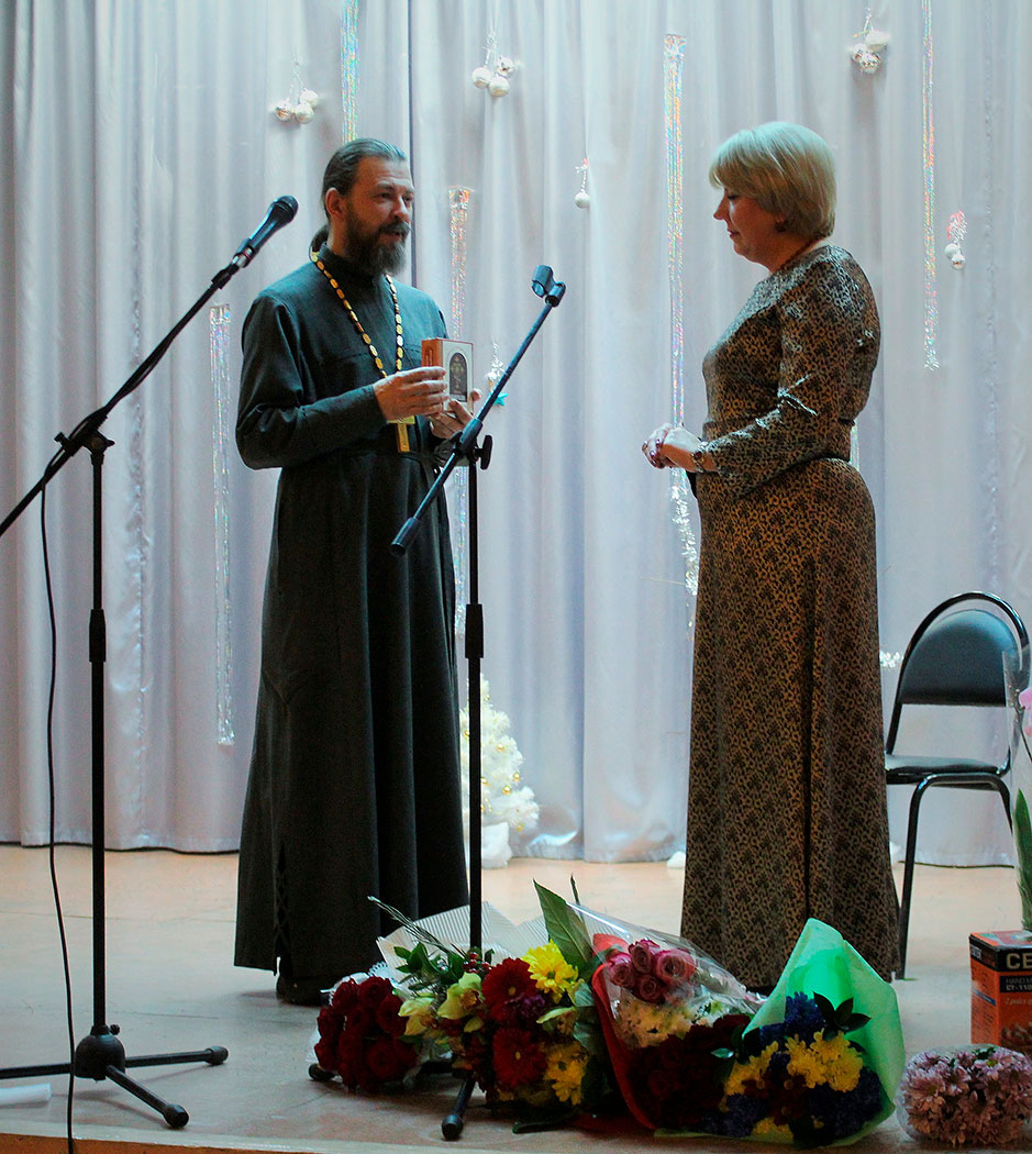 К многочисленным поздравлениям присоединился настоятель Сергиевского храма с. Трубино священник Антоний Сенько. Вместе с дочерью Ефросинией батюшка исполнил новую песню трубинского жителя композитора О. Бакума "Колокольный звон".