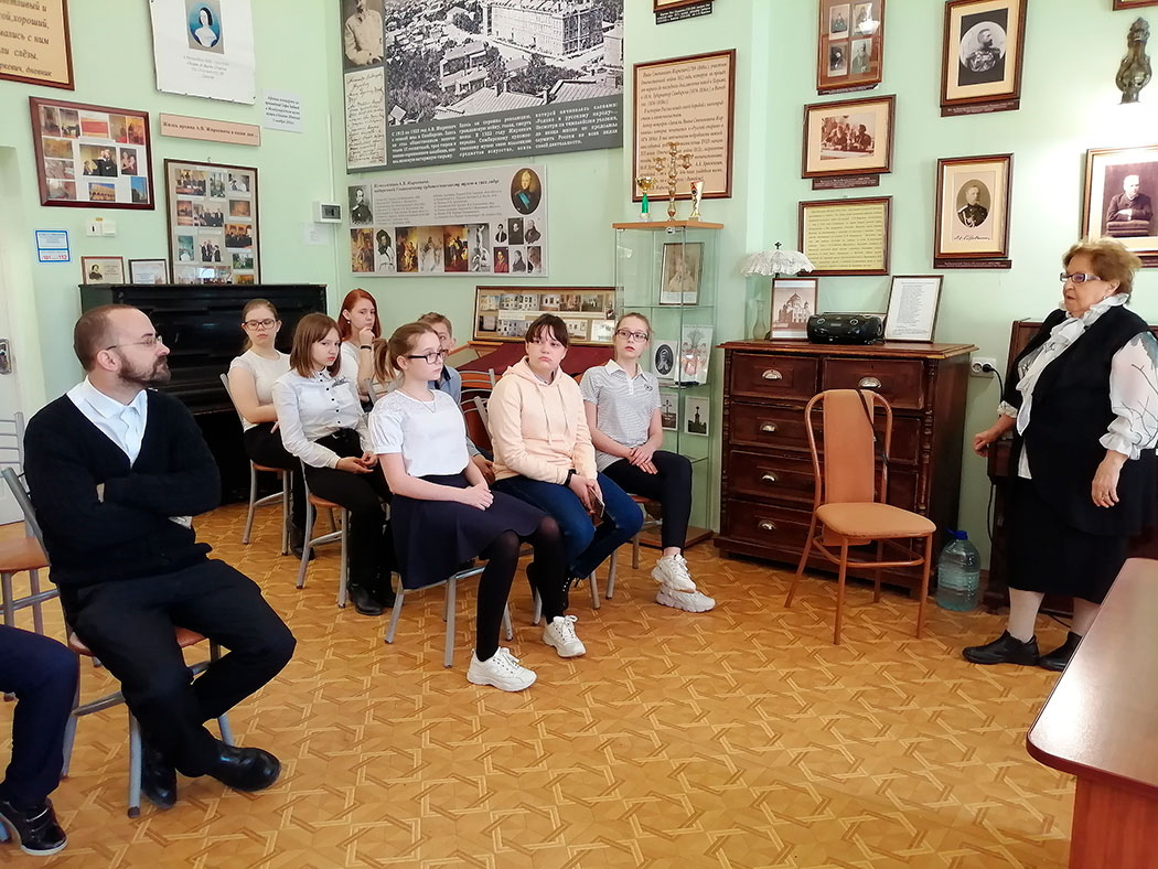 В беседе приняли участие учитель истории Т.А. Балыко, настоятель Сергиевского храма с. Трубино священник Антоний Сенько и участники исторического кружка 16-й школы г. Щелково. Ведущая беседы Н.Г. Жиркевич познакомила гостей с историей семьи Жиркевичей, семейных досуговых традиций, совместных игр. Ребята активно участвовали в беседе, задавали непростые вопросы. В заключении беседы ознакомились с образцами писем конца 19-го начала 20-го столетий и пропели вместе небольшую детскую песню.