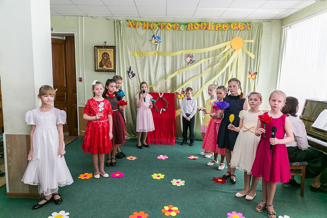 После праздничной трапезы в конференц-зале состоялся пасхальный концерт. Старшая группа представила музыкальную-поэтическую композицию «Венок для Христа» с использованием произведений П.И.Чайковского и В.А.Моцарта. Специально для номера на творческих занятиях дети изготовили красивые цветочные декорации.