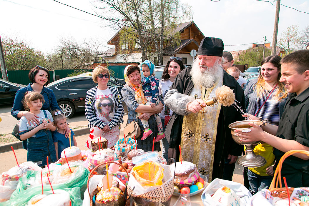 27 апреля, в Великую Субботу, в Покровском храме г. Щелково после утреннего богослужения настоятель храма протоиерей Алексий Никонов вместе с клириком храма протоиереем Владимиром Александровым освятили крашеные яйца, куличи и пасхи, принесенные в этот день в храм жителями Щелкова.