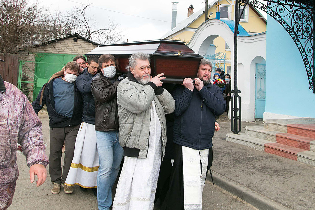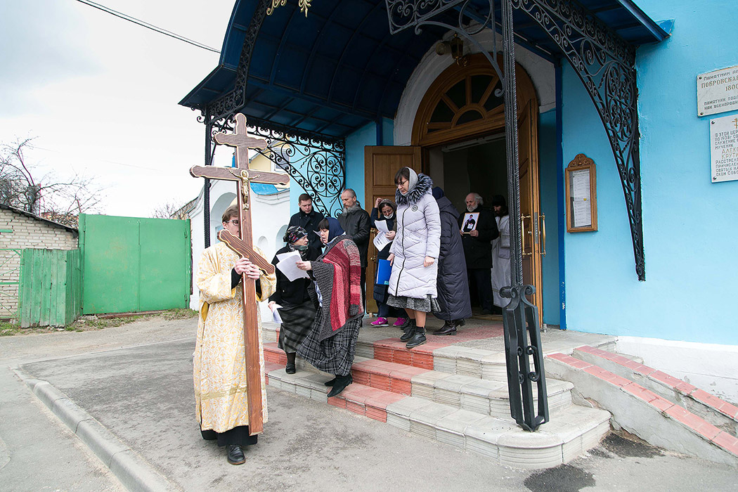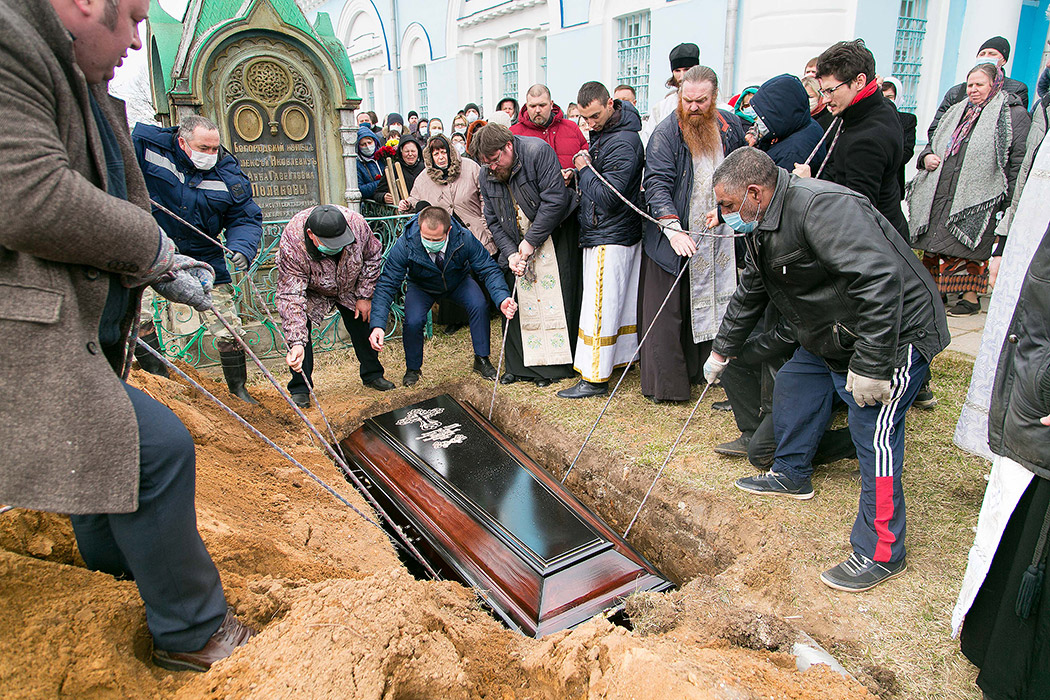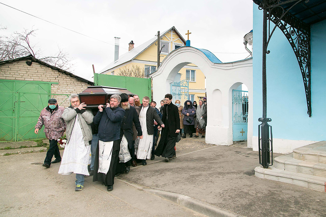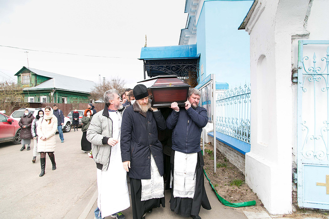 Под колокольный звон и пасхальные песнопения похоронная процессия крестным ходом прошла вокруг храма. Протоиерей Владимир Александров был похоронен на территории Покровского храма.