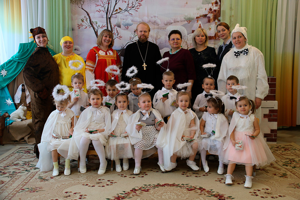 Воспитатели и дети под руководством Давыдовой Евгении Анатольевны подготовили к празднику тематическую сказку «Рождественский колобок». На мероприятии присутствовали заведующая учреждением Ряжкина Елена Владимировна и ответственный по вопросам семьи, защиты материнства и детства в Щелковском благочинии священник Димитрий Медведев, который обратился к собравшимся с приветственным словом и подарил каждому участнику иконку Рождества Христова.