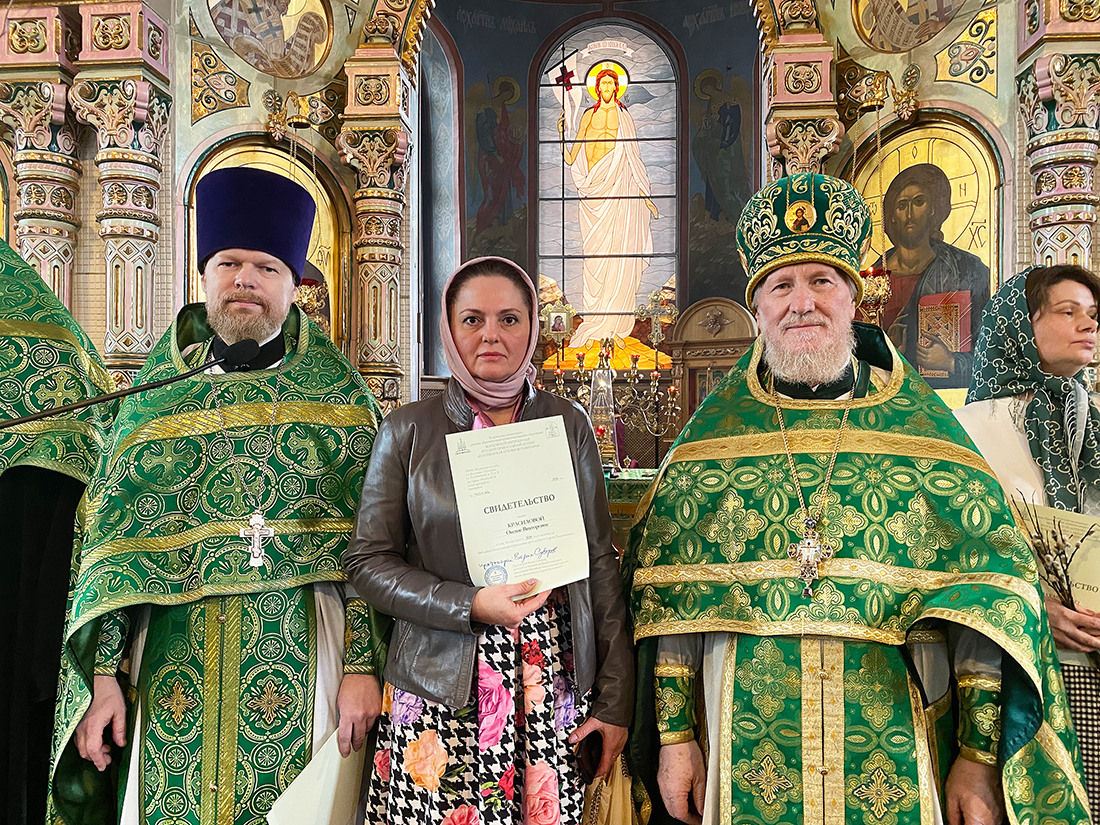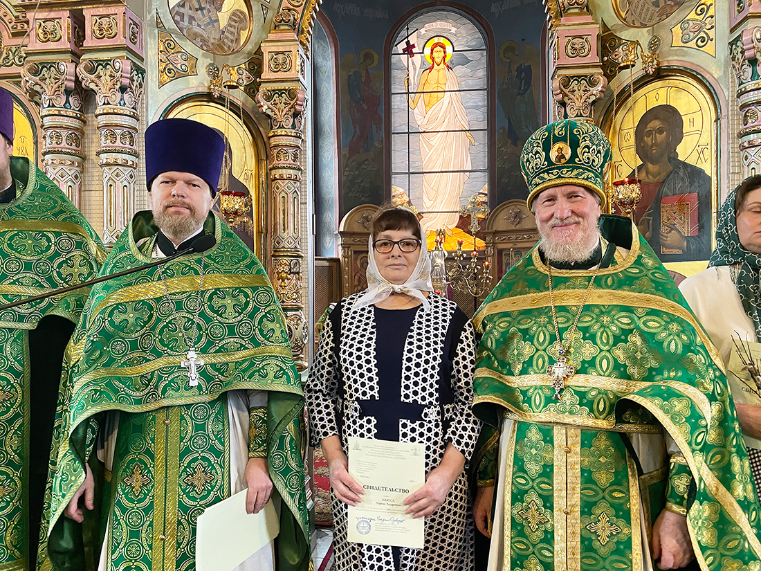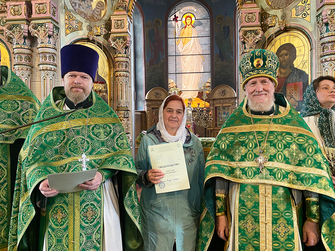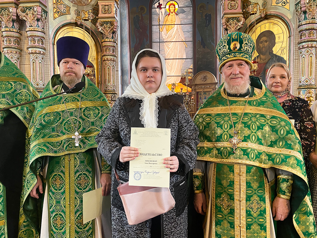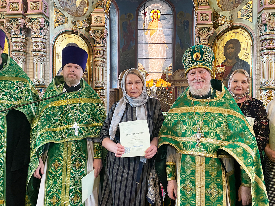 По окончании Божественной Литургии благочинный Щёлковского церковного округа протоиерей Андрей Ковальчук поздравил выпускников с окончанием обучения и вручил свидетельства за подписью ректора Коломенской духовной семинарии протоиерея Вадима Суворова. Мероприятие продолжилось благодарственным молебном, который отслужил руководитель отделения курсов священник Димитрий Медведев, и праздничным чаепитием.