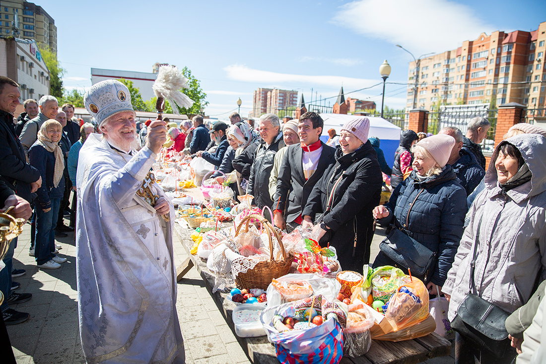 По окончании богослужения отец Андрей и священники собора освятили крашеные яйца, куличи и пасхи, принесенные в этот день в храм жителями Щёлково.