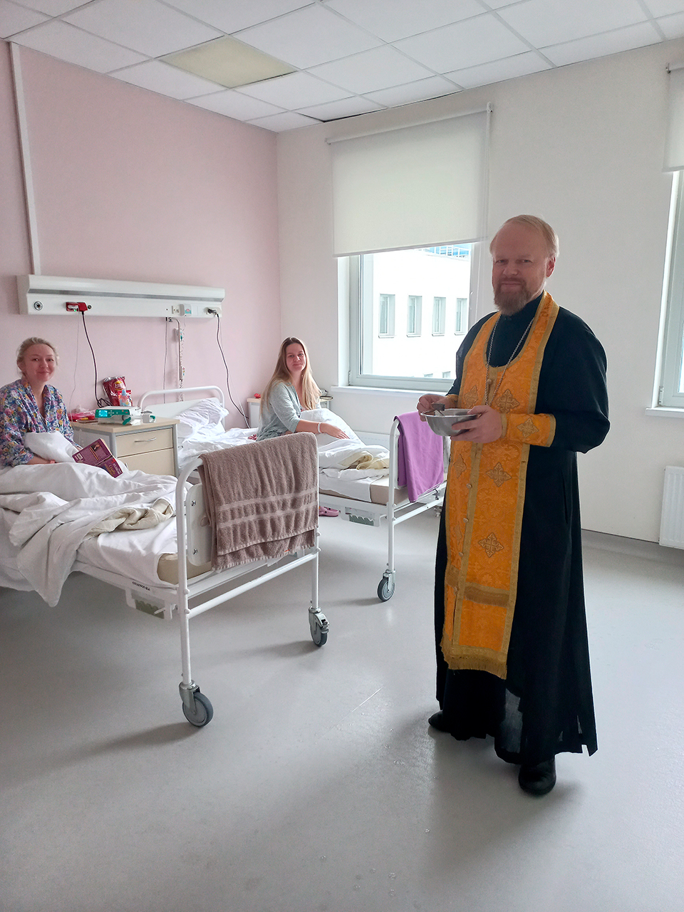 По просьбе сотрудников отделения отец Димитрий отслужил молебен и окропил палаты с пациентами Святой водой.