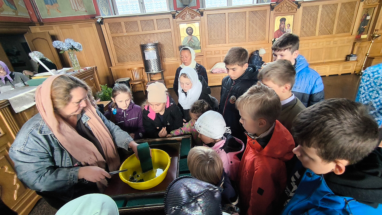 Преподаватель Мария Дмитриевна Медведева рассказала детям историю праздника, а также о житии преподобного Романа Сладкопевца, чья память отмечается Церковью в этот день.