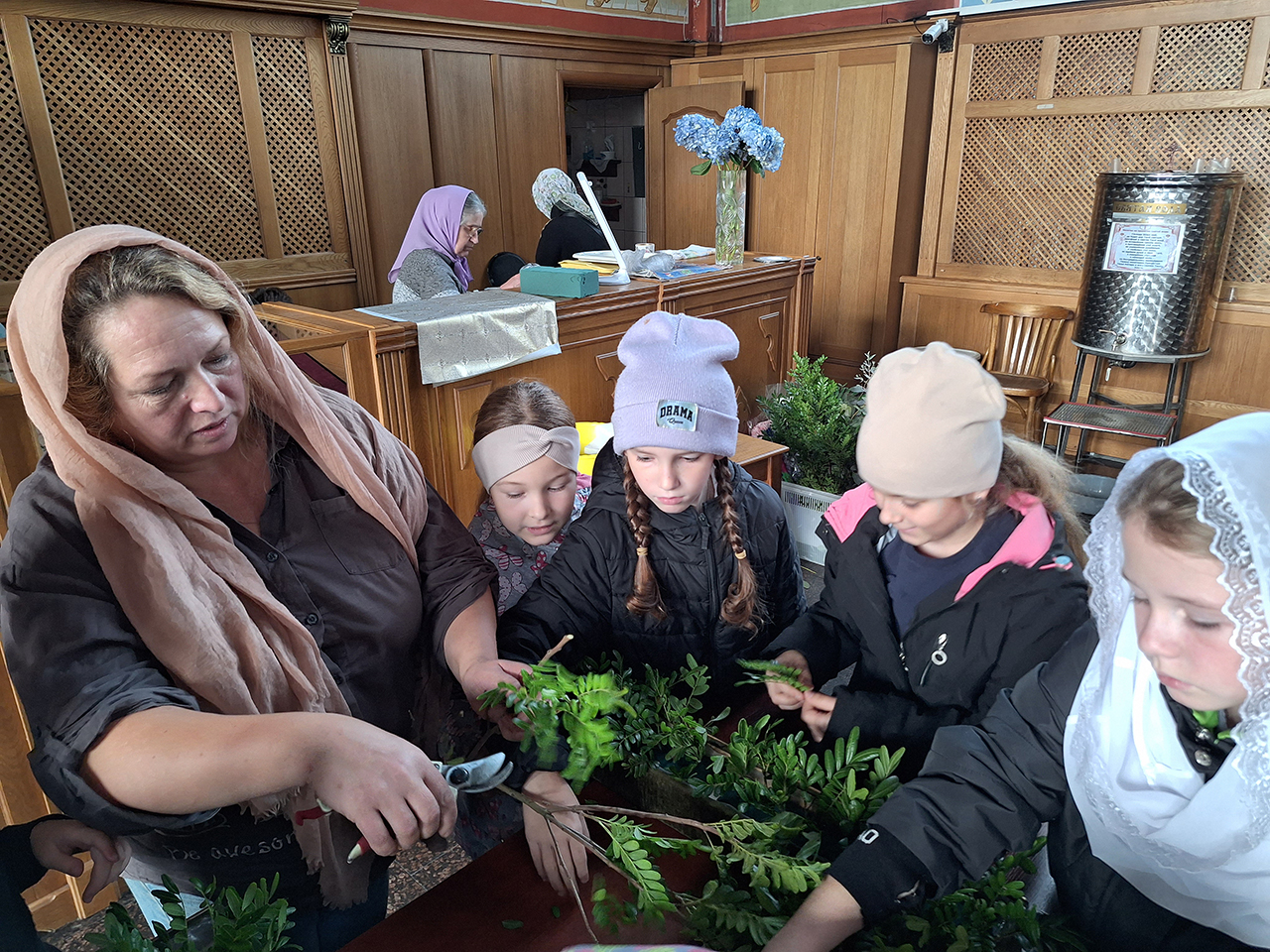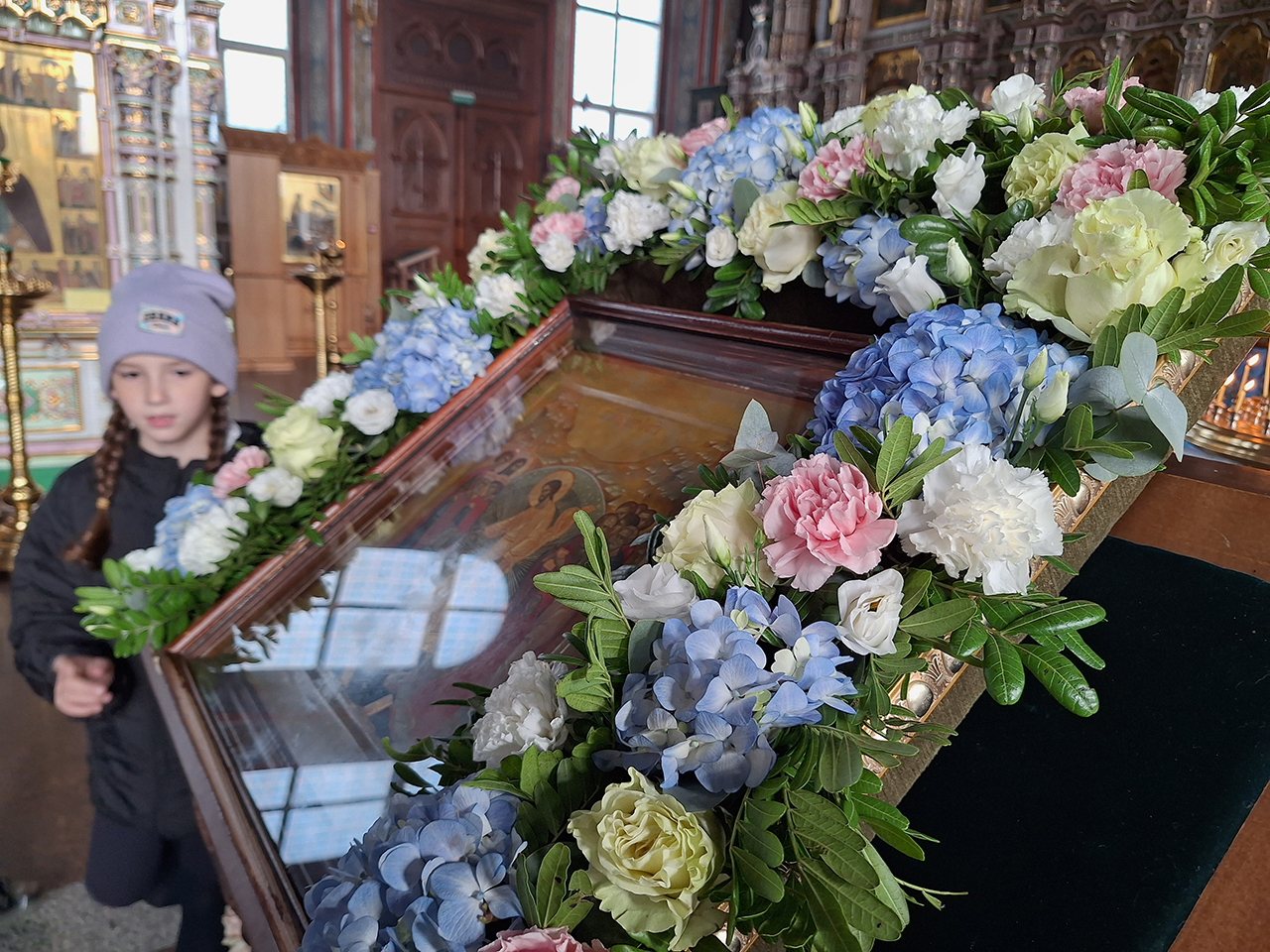 Преподаватель Евгения Анатольевна Давыдова и флорист Екатерина Александровна Щербакова провели ребятам мастер-класс, в ходе которого дети украсили цветами икону праздника и освоили основные принципы составления флористической композиции.