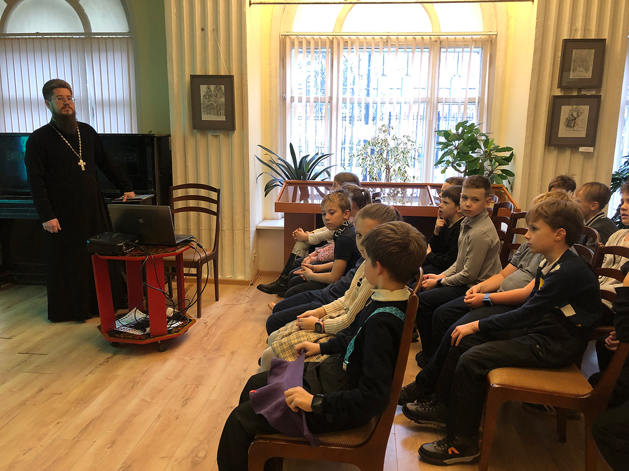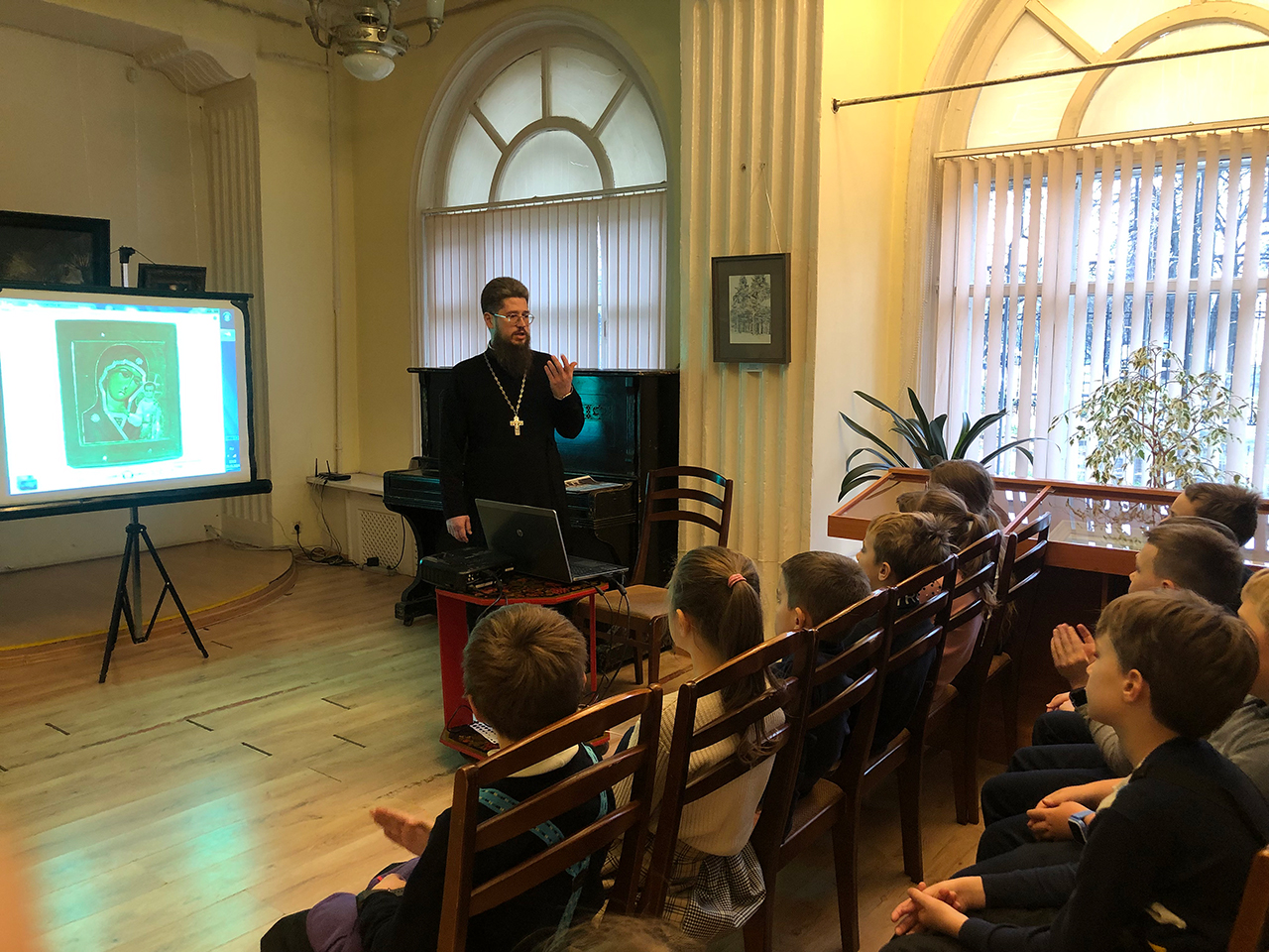 Ребята задавали много вопросов, им очень понравилось путешествие на воображаемой машине времени в 1579 год, когда благодаря девочке Матроне была обретена Казанская икона Божией Матери, затем в 1612 год, когда народное ополчение во главе с Кузьмой Мининым и князем Дмитрием Пожарским освободило Москву от нашествия интервентов, далее в 1812 год, когда после Отечественной войны Казанский собор в Санкт-Петербурге стал храмом-памятником русской армии, и, конечно, в наше время, когда Казанская икона путешествует по городам России для молитвенного единения народа.