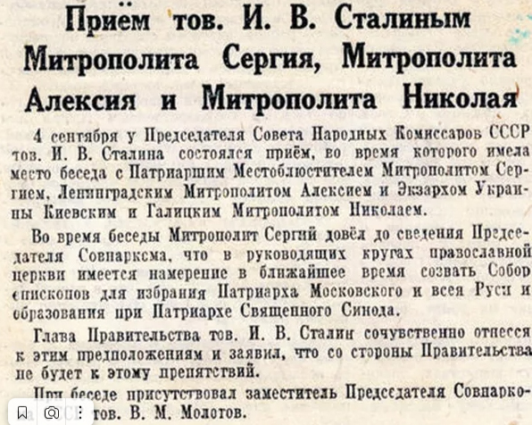 В сентябре 1943 года в Кремле состоялась историческая встреча Сталина с иерархами нашей Церкви, после которой советскими властями было дозволено избрать Патриарха, открыть духовные школы, и были решены многие юридические вопросы, не решавшиеся годами. Это не был акт покаяния власти, прежде всего, самого Сталина, после тех гонений, которые обрушились на Церковь: спустя время эти гонения продолжились. Очень непростым является вопрос оценки вклада Иосифа Сталина в победу. Однако нельзя поддерживать мифы, раздутые вокруг тогдашнего руководителя государства: то, что мы выиграли войну, – это заслуга всего народа, выдающихся полководцев, солдат и офицеров, тружеников тыла и всех людей, отдавших жизнь за свою страну, за её будущее.