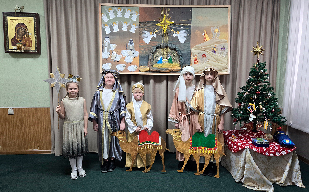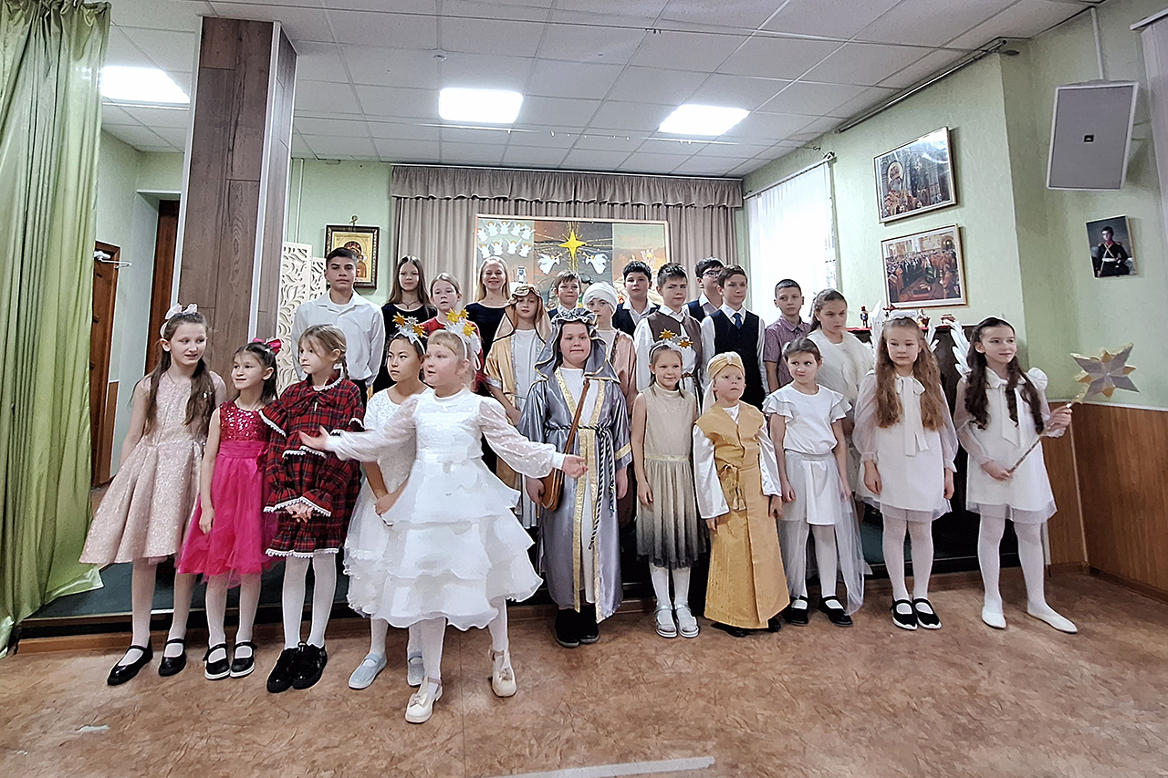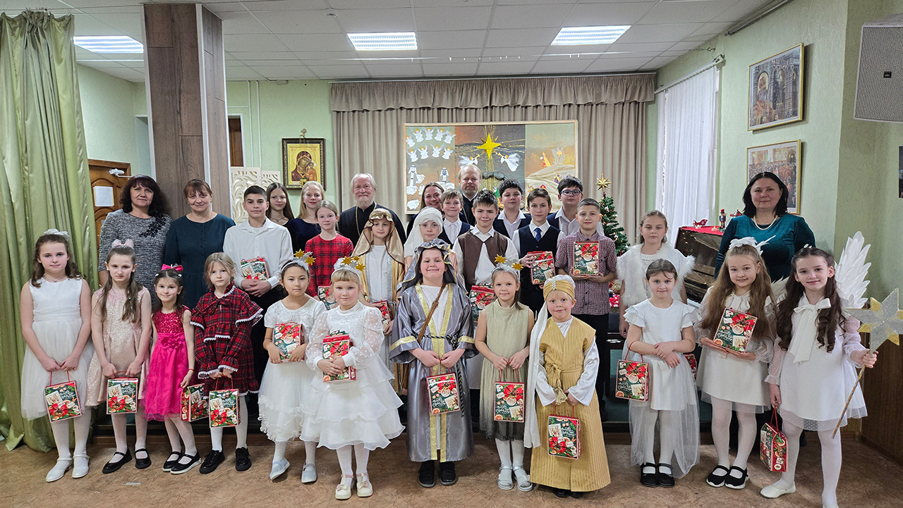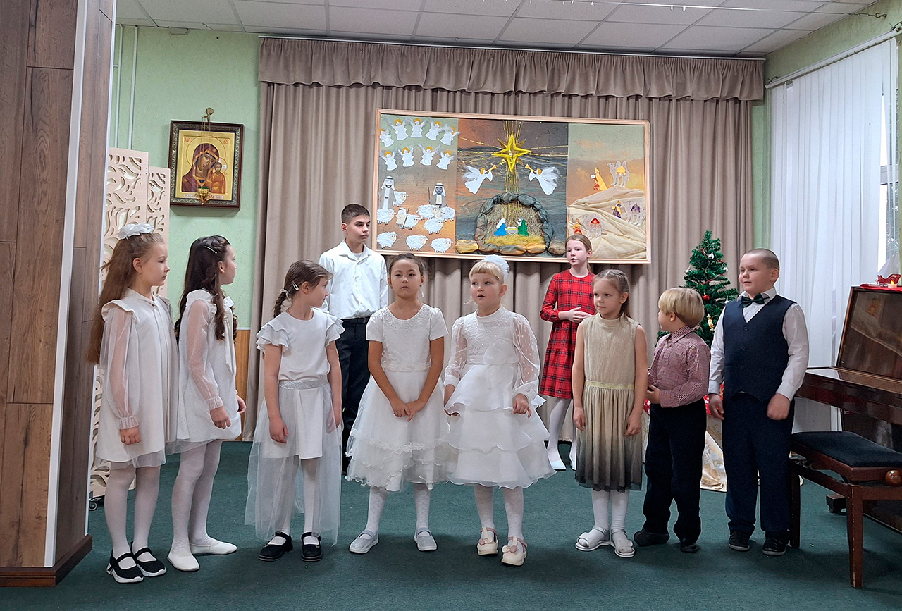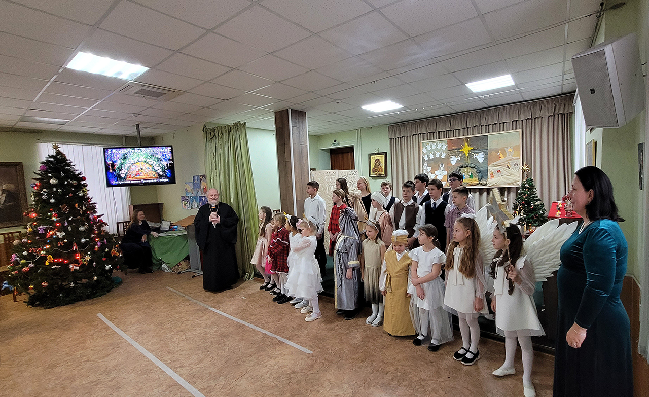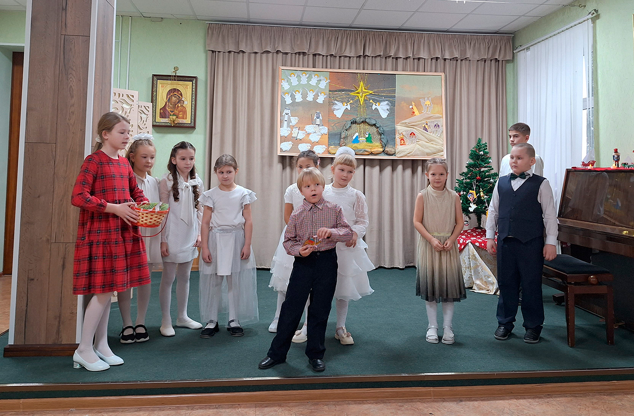Учащиеся прославили родившегося Господа в стихах и песнопениях, представив зрителям основные евангельские события, вспоминаемые в этот день (музыкальный руководитель – Медведева Мария Дмитриевна).