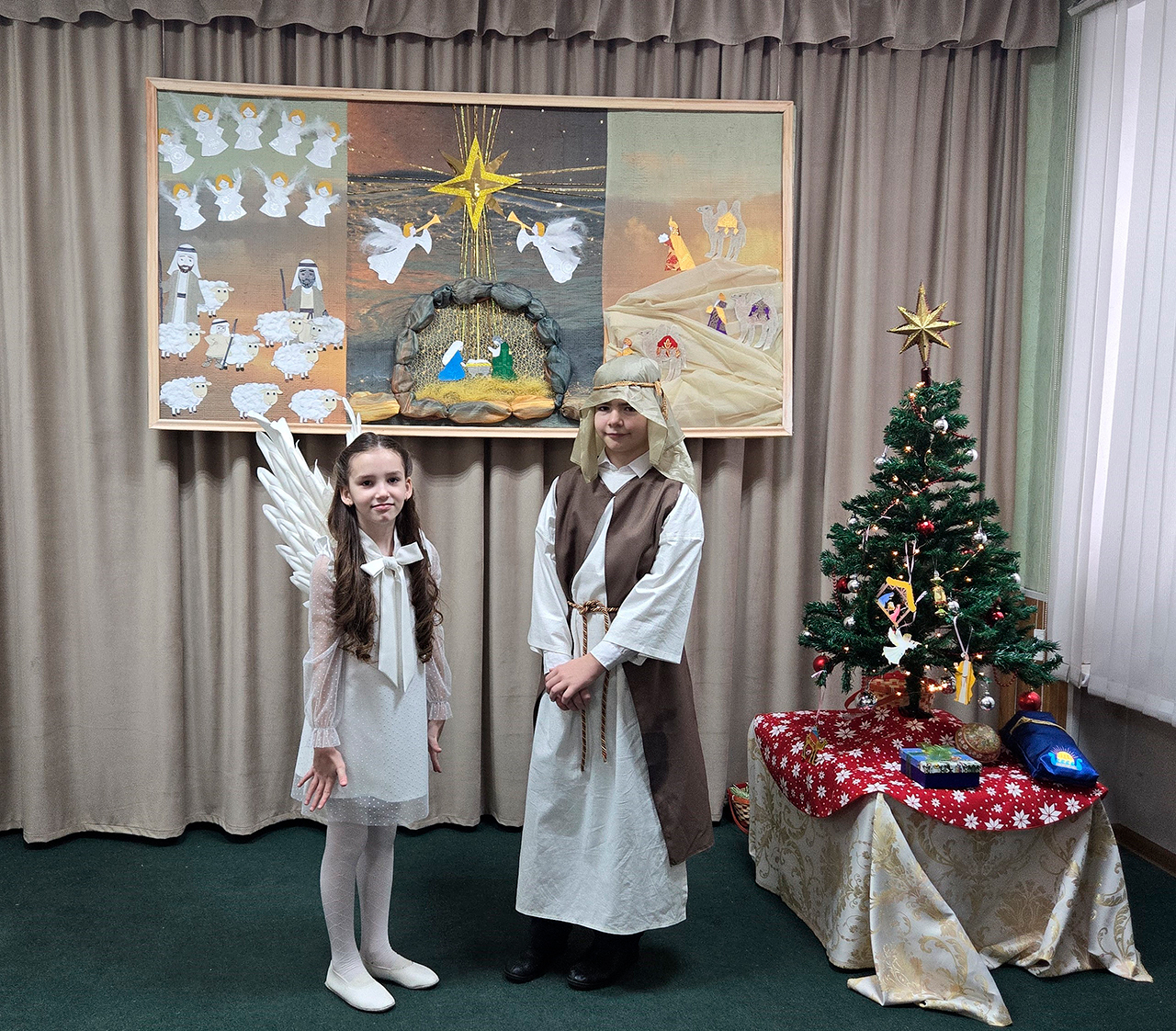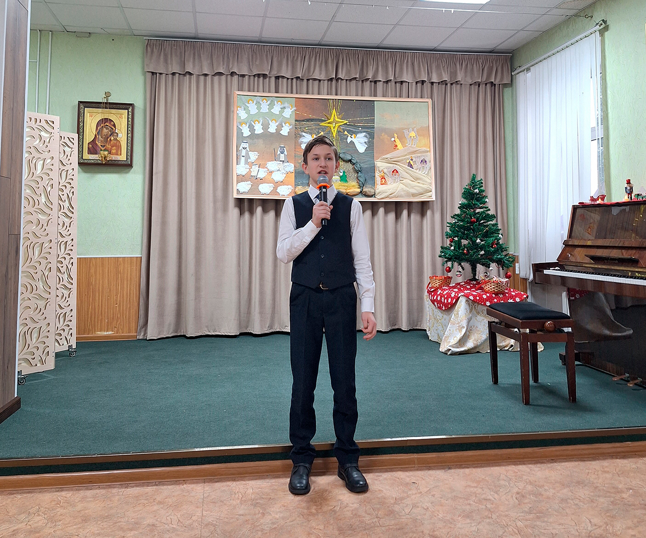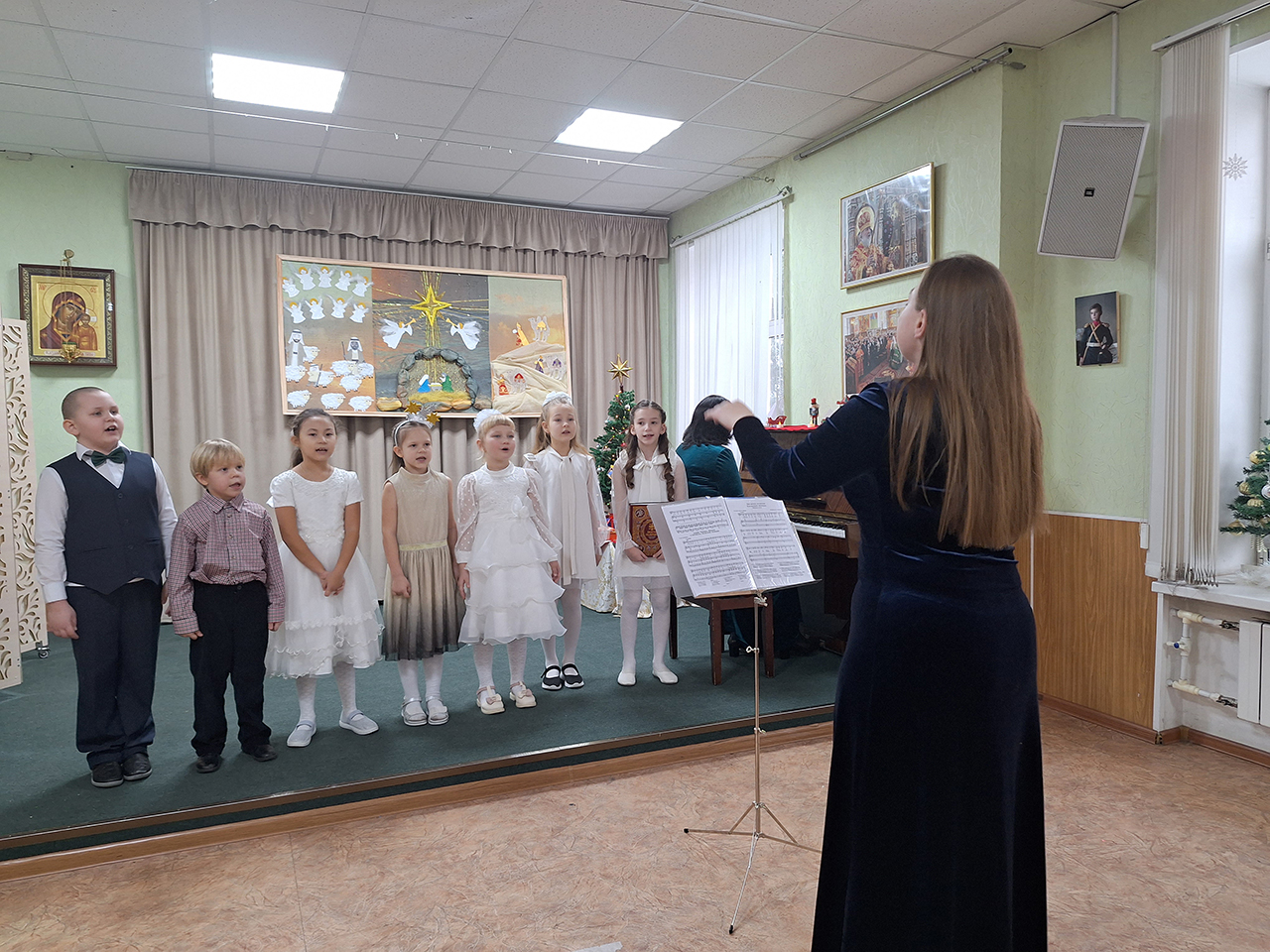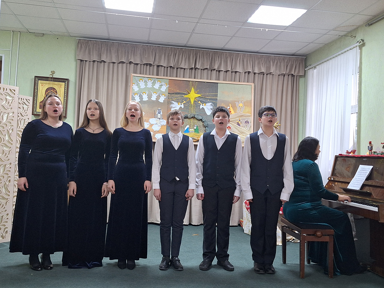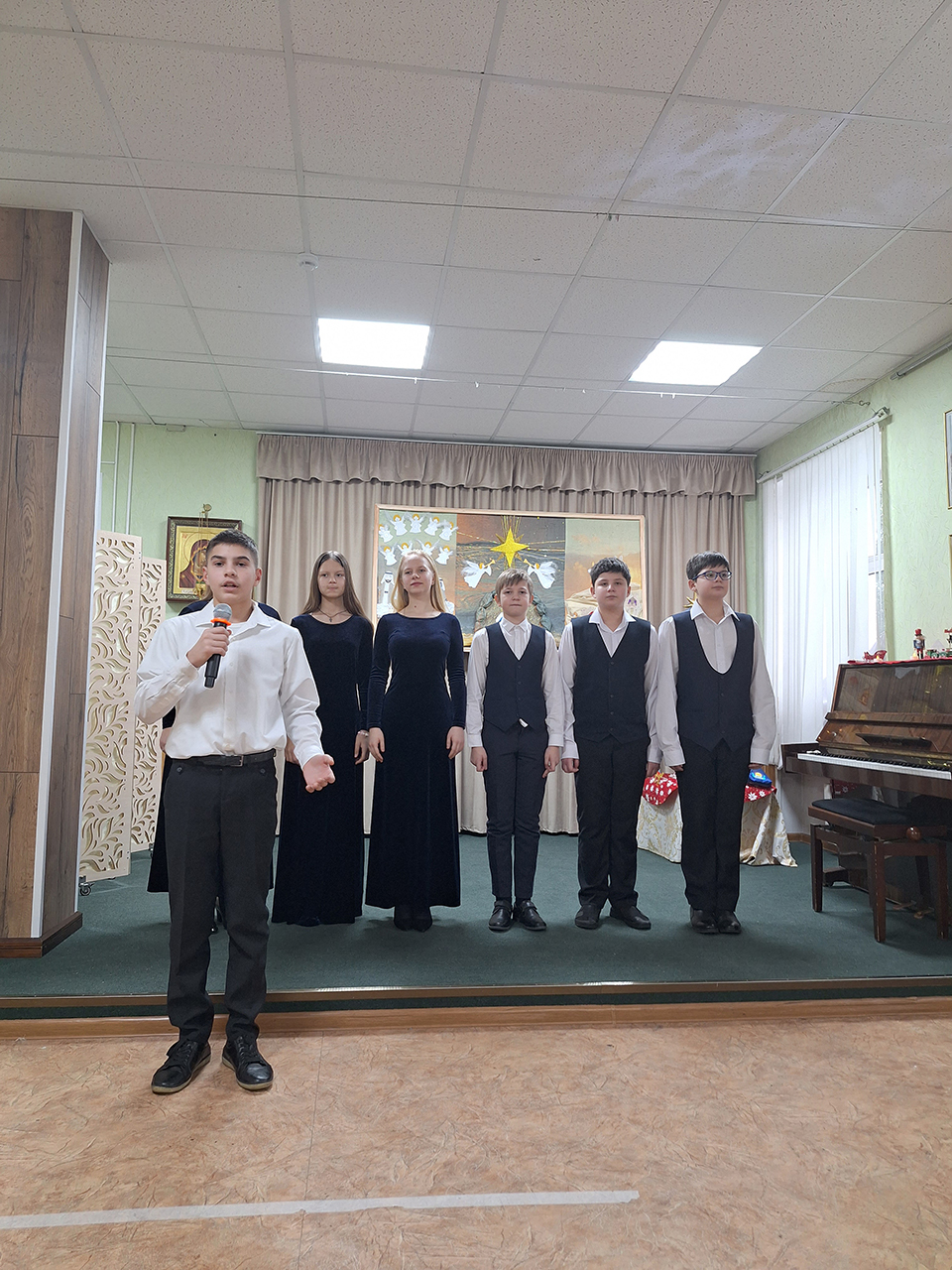 Учащиеся прославили родившегося Господа в стихах и песнопениях, представив зрителям основные евангельские события, вспоминаемые в этот день (музыкальный руководитель – Медведева Мария Дмитриевна).