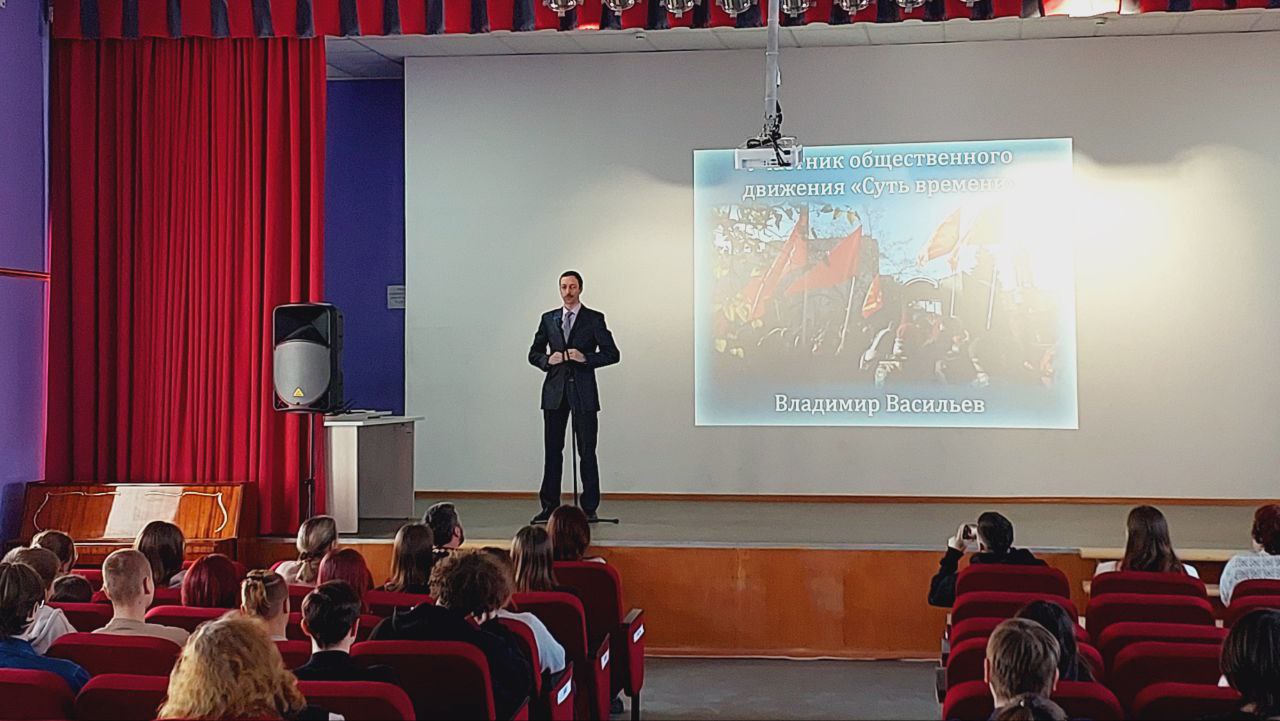 Участник общественного движения «Суть времени» Владимир Васильев выступил с обращением к молодежи и рассказал о неофашизме, его символике, религиозных и философских корнях, проиллюстрировав свой рассказ отрывком из документального фильма «Украинство».